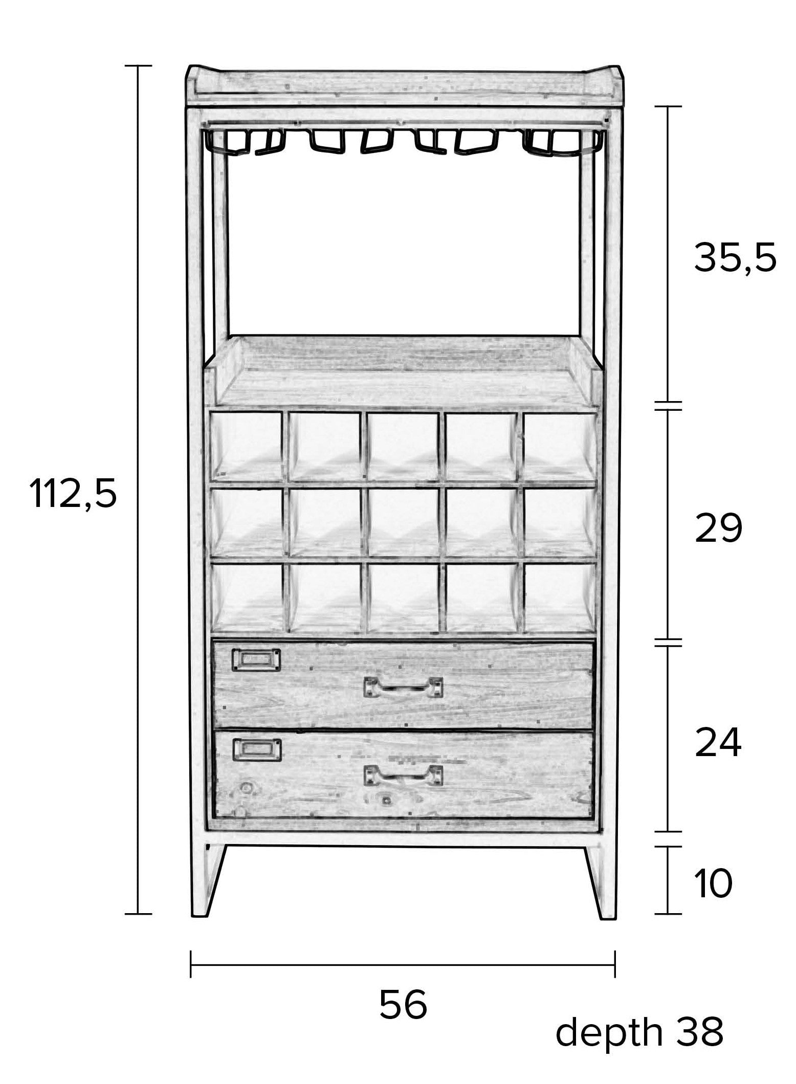 Materiał: drewno jodłowe (góra i przegródka na butelki), MDF, żelazo