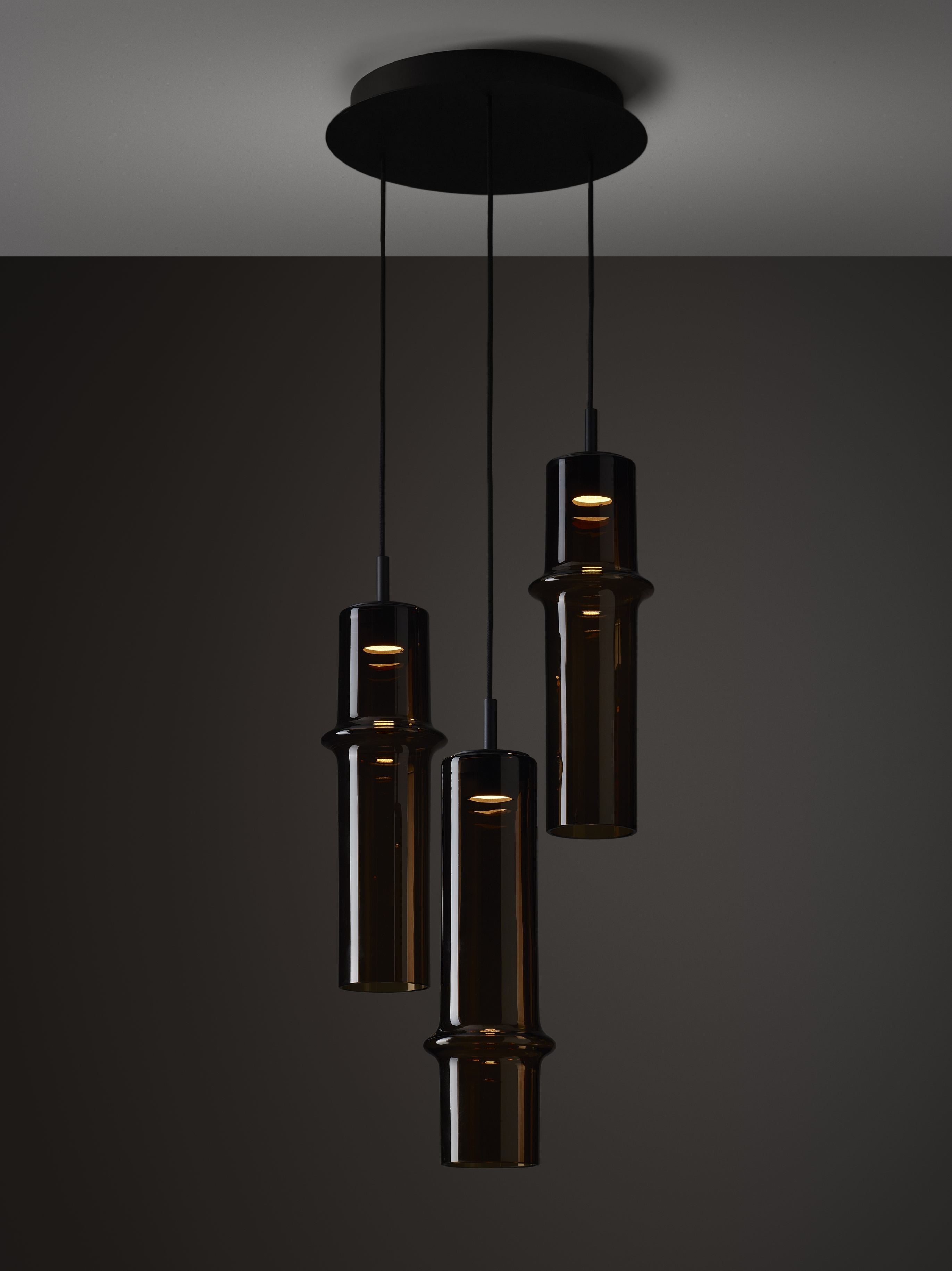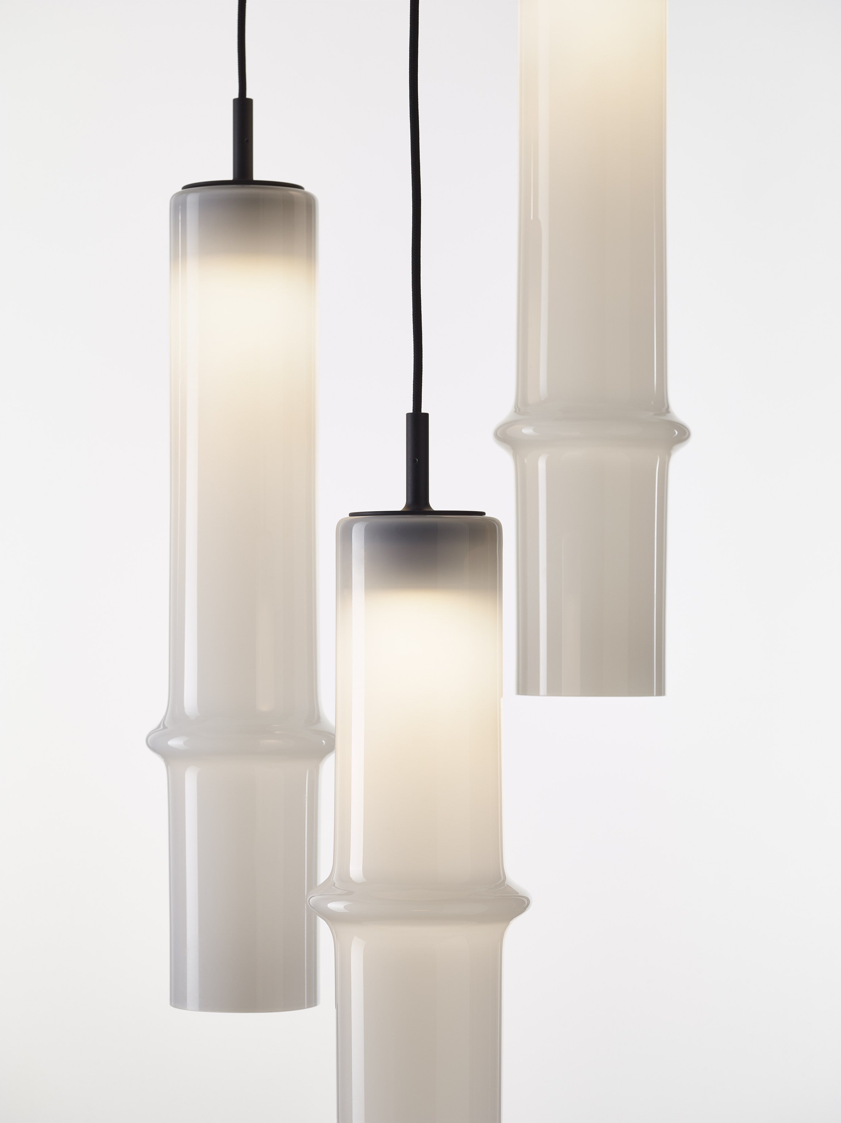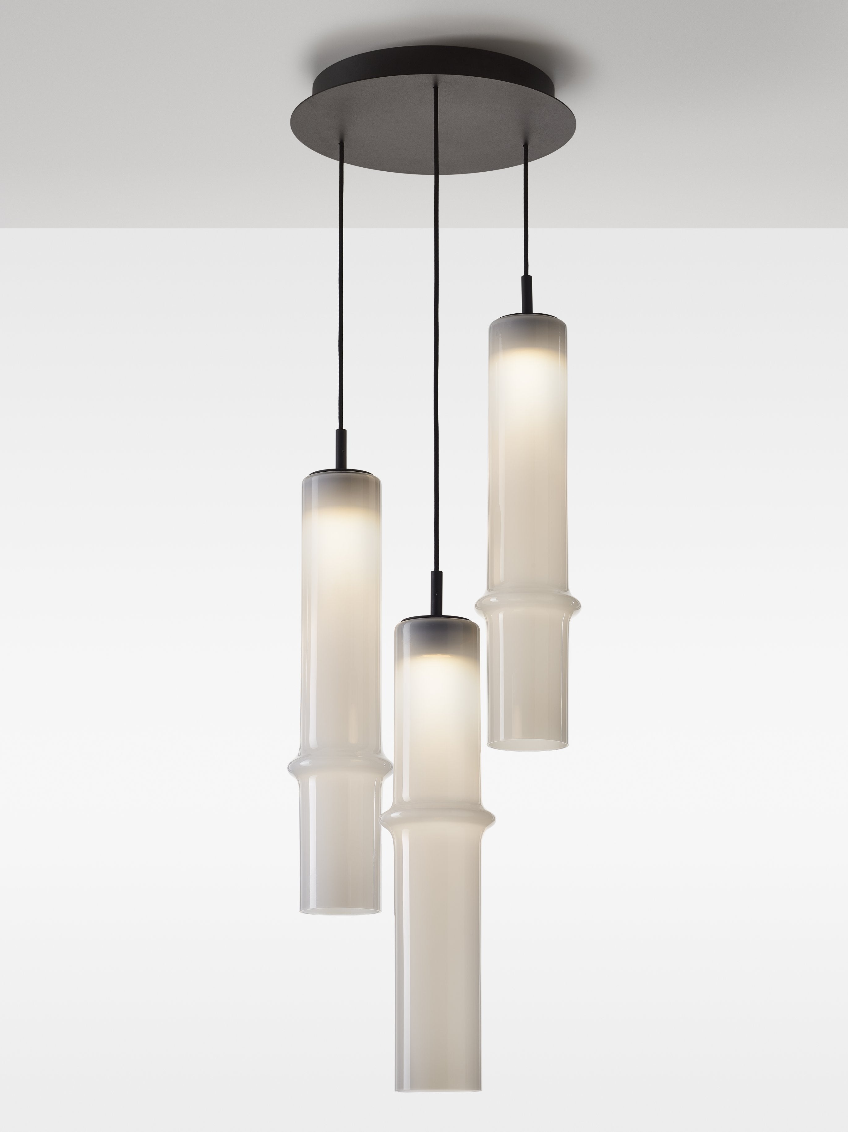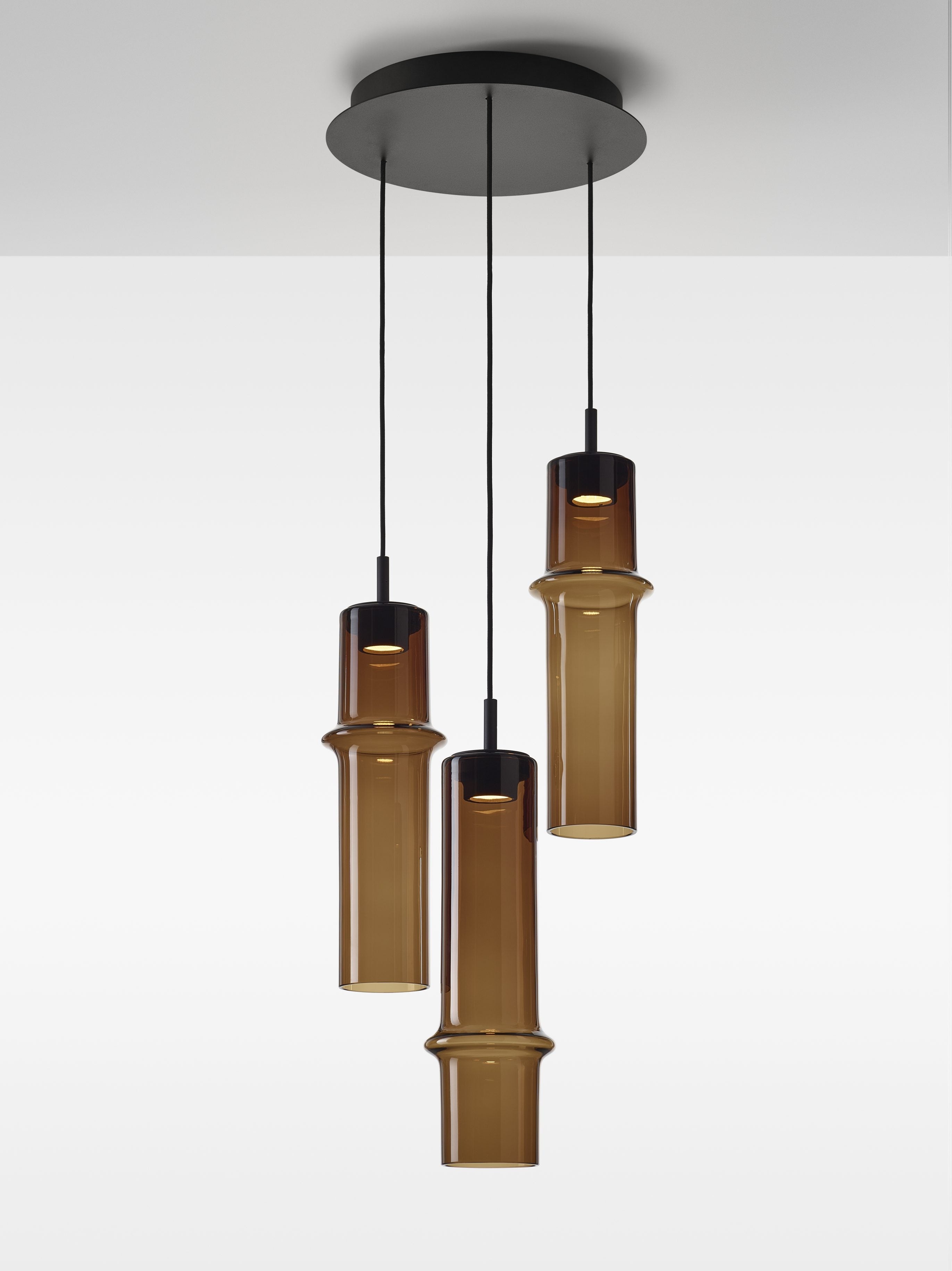 Lampa wisząca Bamboo Forest inspirowana jest pionowymi konturami kęp bambusa, co nadaje jej wyjątkową estetykę. Ręcznie rzeźbione szkło naśladuje łodygi bambusa, z charakterystycznym pierścieniem węzłowym, który pogrubia się, tworząc subtelne cienie. Różnorodność rozmiarów i umiejscowienie węzłów na łodygach nadają tej kolekcji natychmiastowo rozpoznawalny charakter.