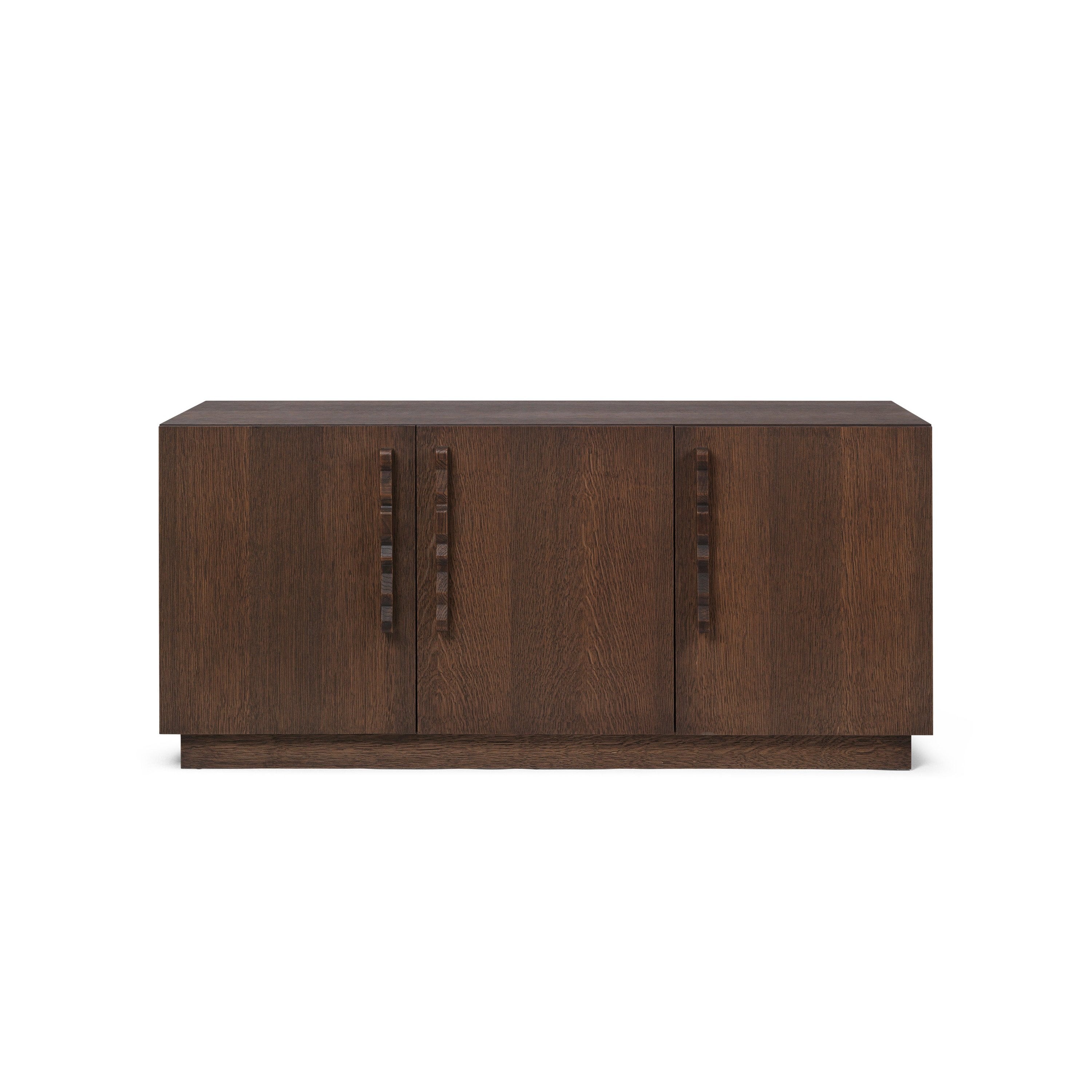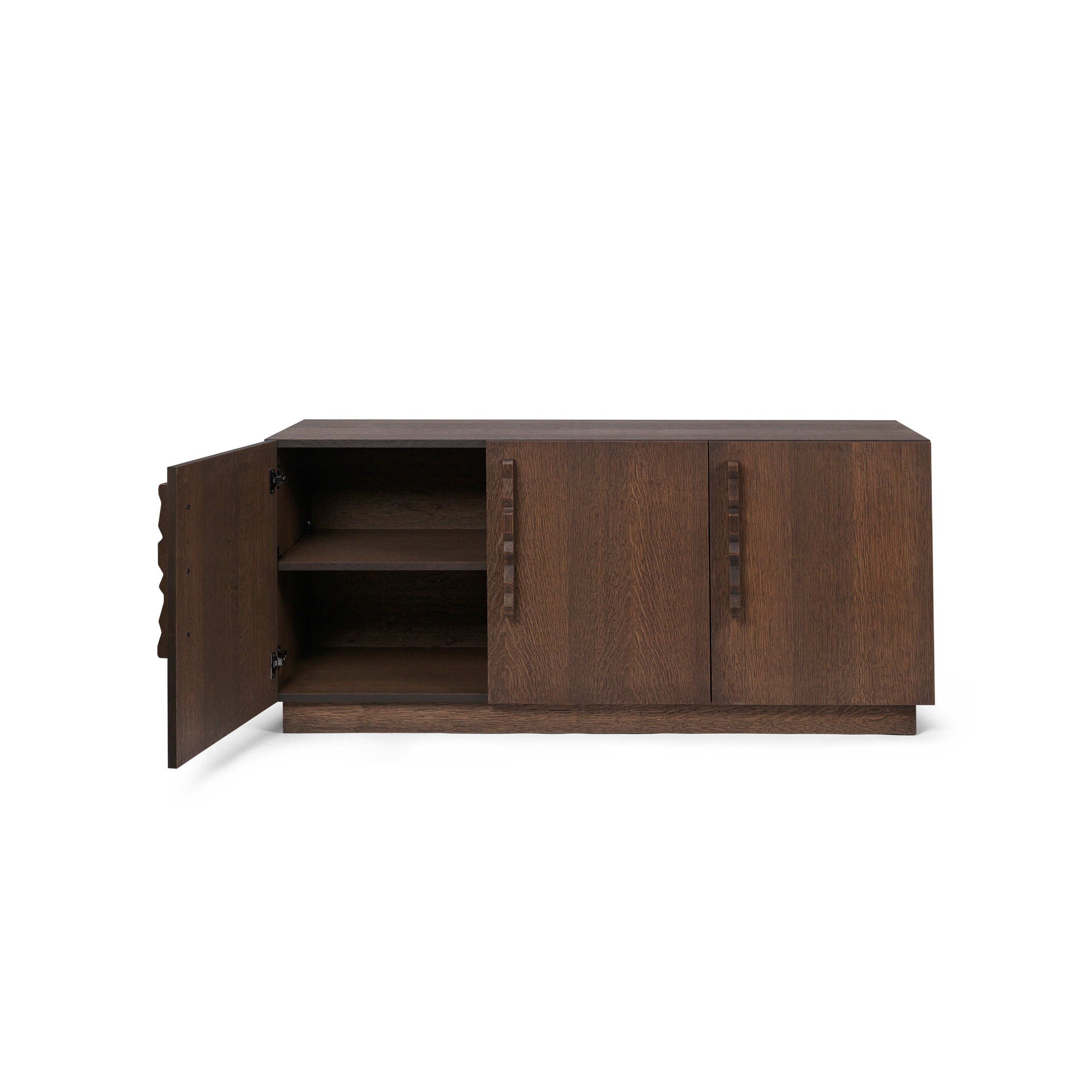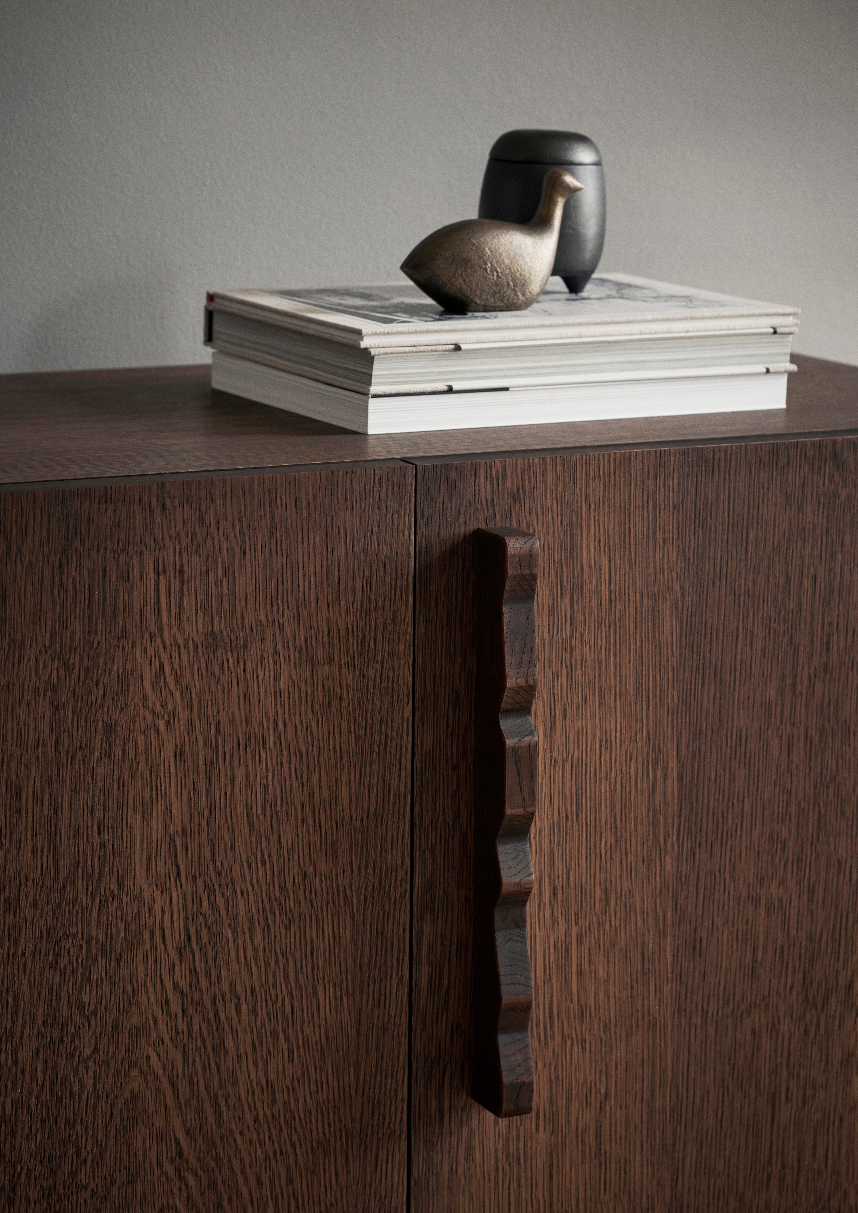 Komoda Unda została wykonana z ciemno barwionego drewna dębowego z certyfikatem FSC™, łącząc solidną, klasyczną estetykę z nieco figlarnymi, falistymi uchwytami. To zestawienie funkcjonalności z odrobiną lekkości tworzy ponadczasowy mebel, który doskonale dopasowuje się do każdego wnętrza.
