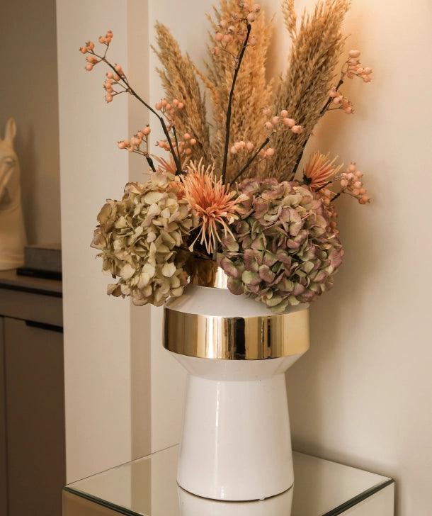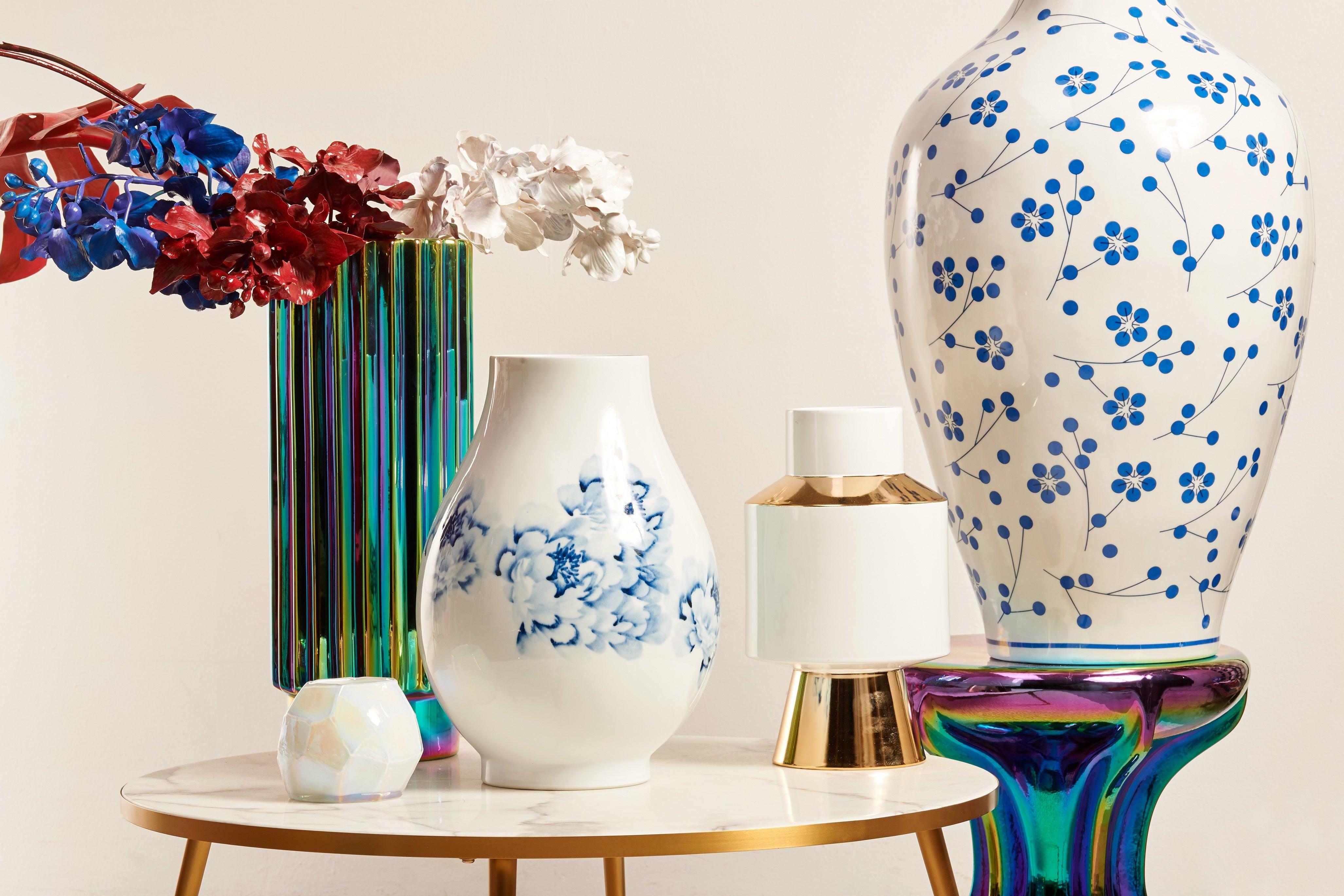 Wazon Object w kolorze białym stanowi połączenie elegancji i minimalizmu. Klasyczna biel idealnie łączy się ze lśniącymi, złotymi elementami, które wyróżniają się na tle innych tego typu produktów. Subtelny, choć efektowny wygląd idealnie odzwierciedla charakter tego obiektu dodając mu przy tym niebanalnego wydźwięku. Gładkie, biało-złote szkliwo podkreśla jakość projektu, podczas gdy kształt uwypukla subtelny kunszt wykorzystany podczas jego tworzenia.