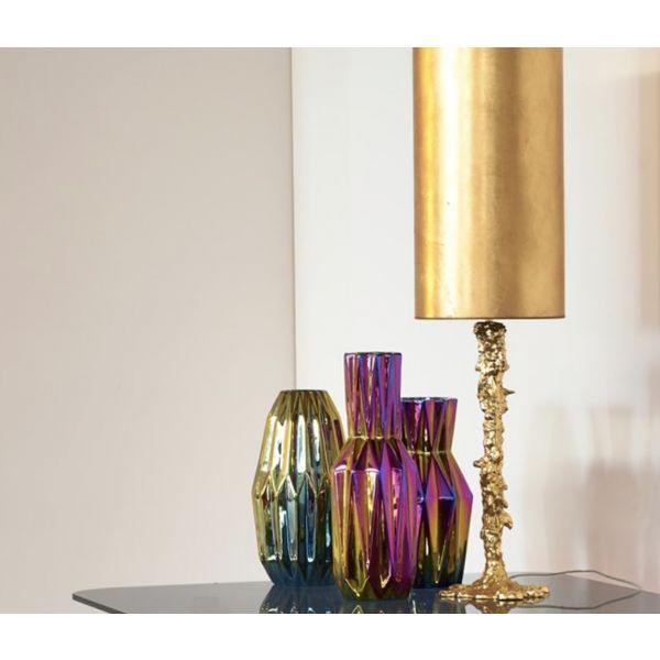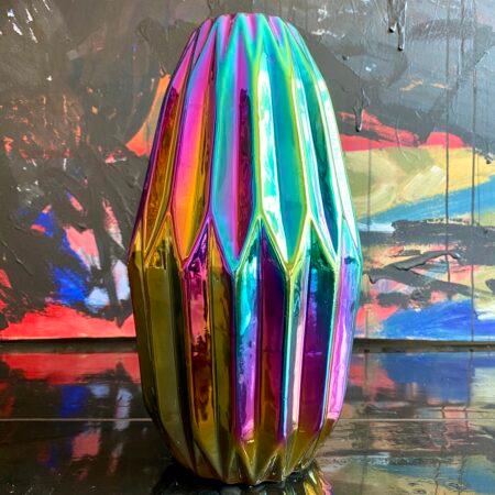 Wazon Oily Folds to model, który swoim wyglądem zaskakuje, a także przywodzi na myśl charakterystyczny chlust benzyny zatopiony w kałuży wody. Nieregularny kształt podkreśla to niezwykłe wrażenie, ponieważ dzięki temu promienie słoneczne padają na różne płaszczyzny dodatkowo eksponując elegancką różnorodność kolorystyczną.