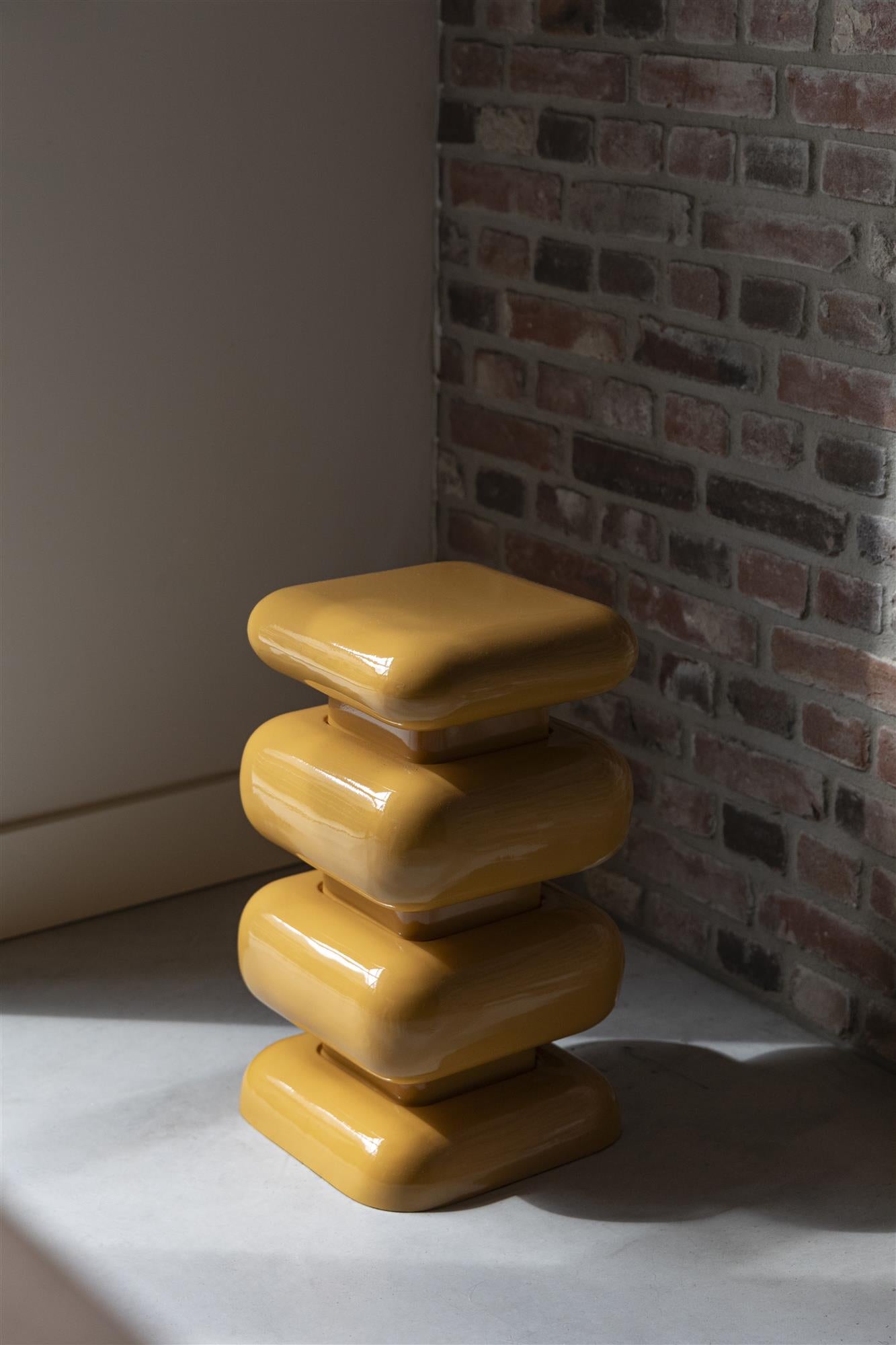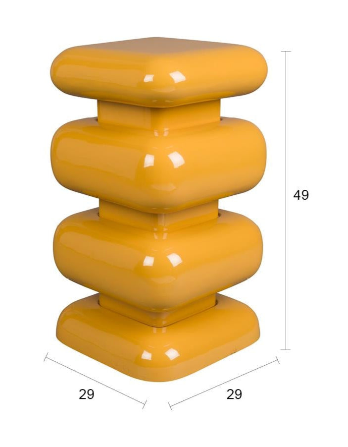 Nowoczesny stolik boczny Stubby w kolorze żółtym to doskonały wybór dla osób, które chcą wprowadzić do wnętrza subtelny akcent retro. Wykonany z żelaza i pokryty błyszczącym wykończeniem, zachwyca oryginalnym kształtem inspirowanym stylem lat 70. Cztery zaokrąglone warstwy nadają mu wyjątkowego charakteru, a intensywny żółty odcień przyciąga wzrok i pięknie komponuje się z różnymi aranżacjami.