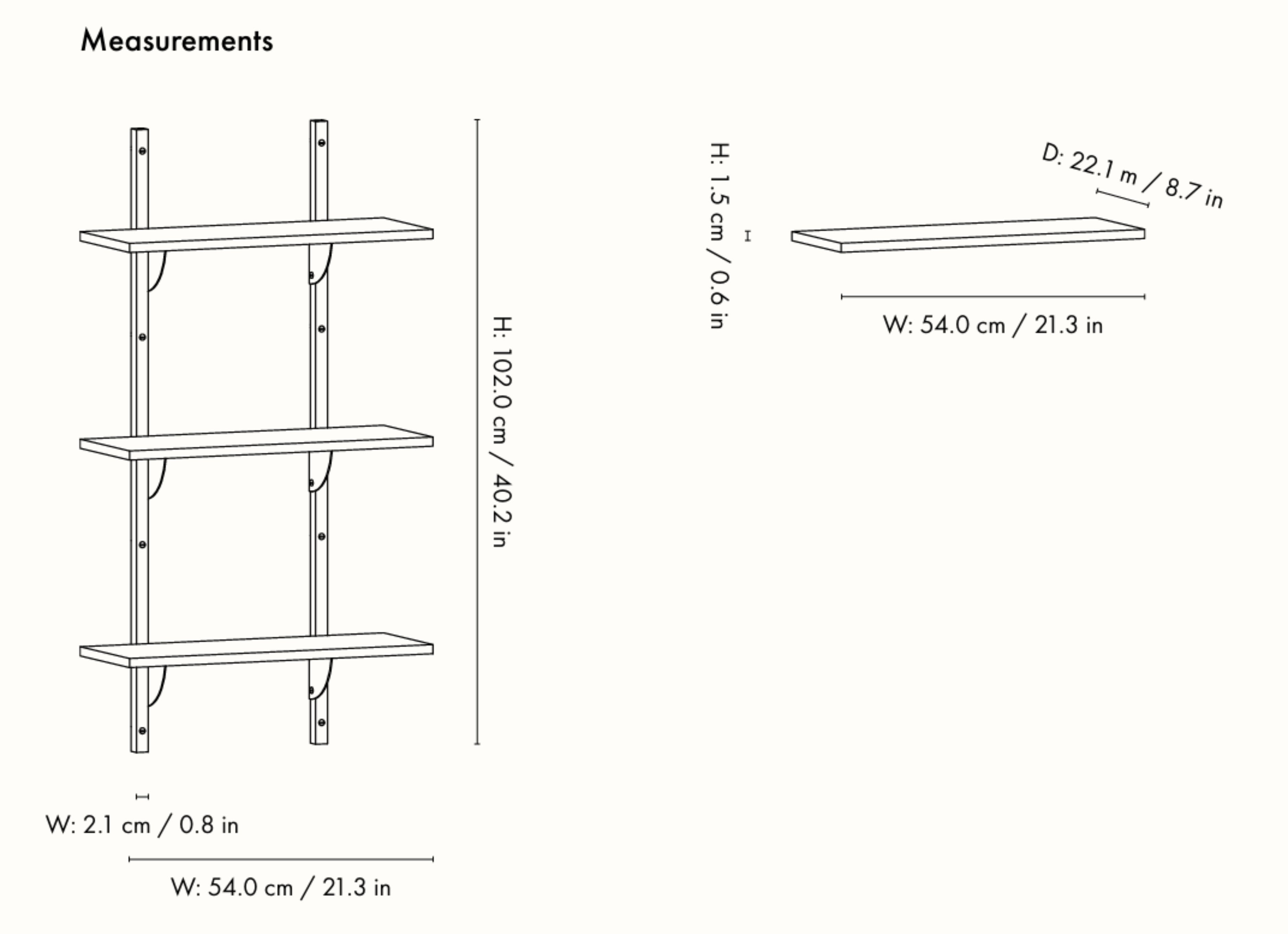 Materiały: Półki: czarny fornir jesionowy z rdzeniem MDF, Profile: lite drewno jesionowe bejcowane na czarno, Wsporniki: mosiądz