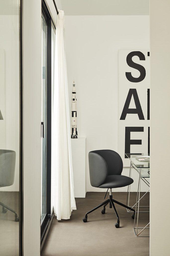 Krzesło na kółkach w kolorze czarnym o nazwie "Mogi", odnoszącej się do koreańskiego słowa oznaczającego komara, prezentuje elegancki design o ponadczasowych kształtach, który zapewnia użytkownikowi poczucie spokoju i wygody.