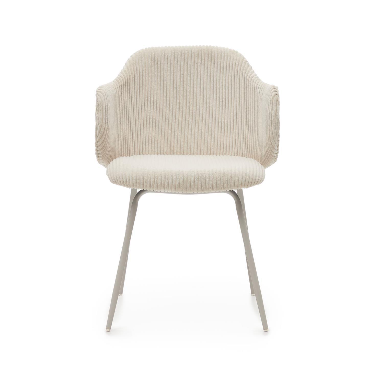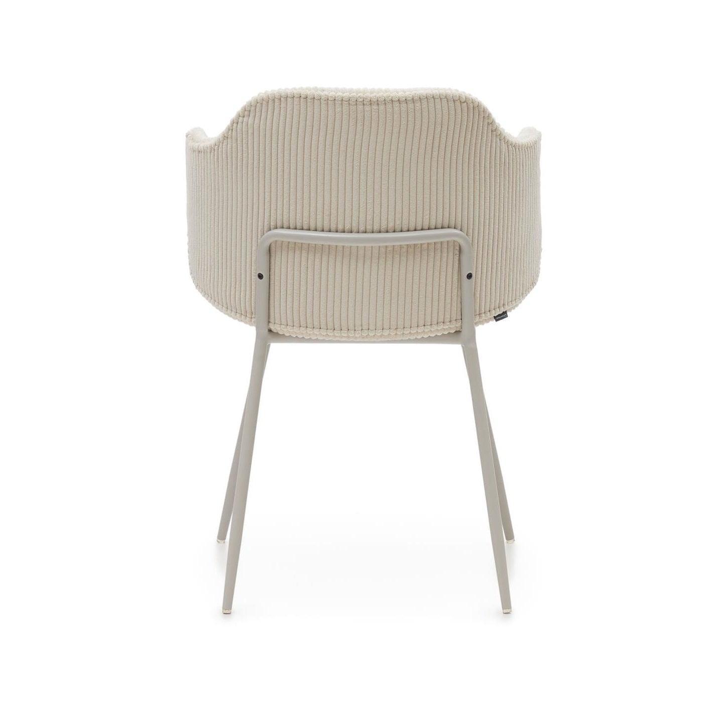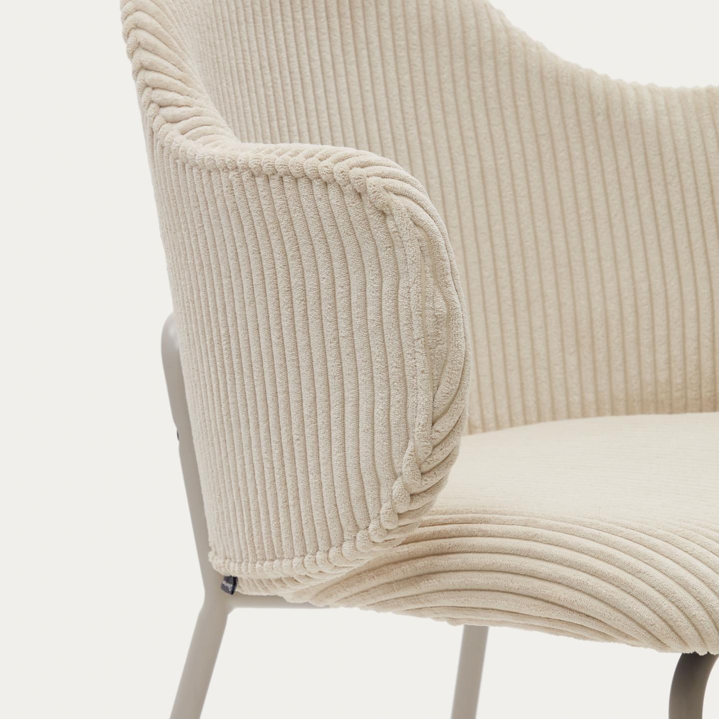Metalowe nogi z czarnym wykończeniem stanowią solidne podparcie dla tego designerskiego krzesła. Całość emanuje nowoczesnością, a jednocześnie zachowuje subtelność, dzięki delikatnemu odcieniowi jasnoróżowego sztruksu.