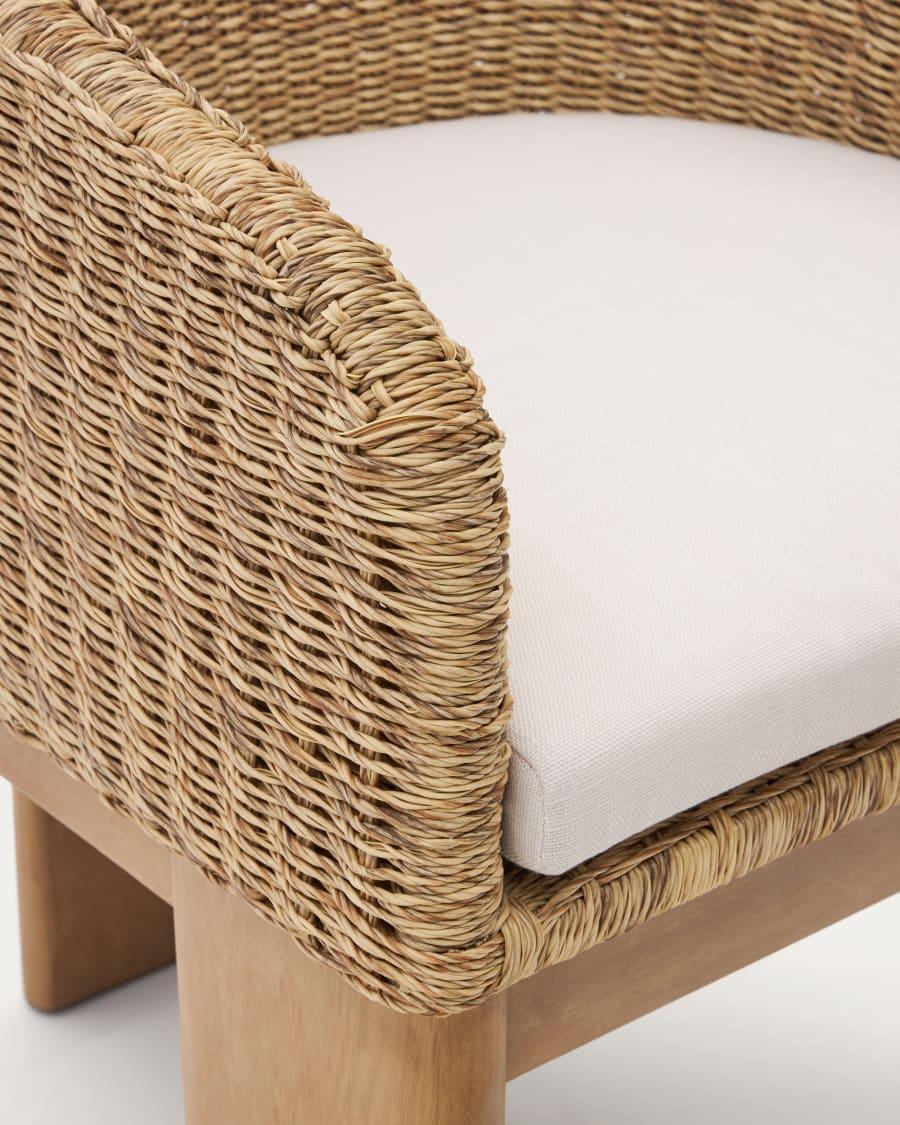 Wykonane z litego drewna eukaliptusowego (podstawa) oraz syntetycznego rattanu (oparcie), krzesło Xoriguer łączy w sobie naturalne materiały, zapewniając nie tylko estetyczny wygląd, ale także trwałość i odporność na warunki atmosferyczne.