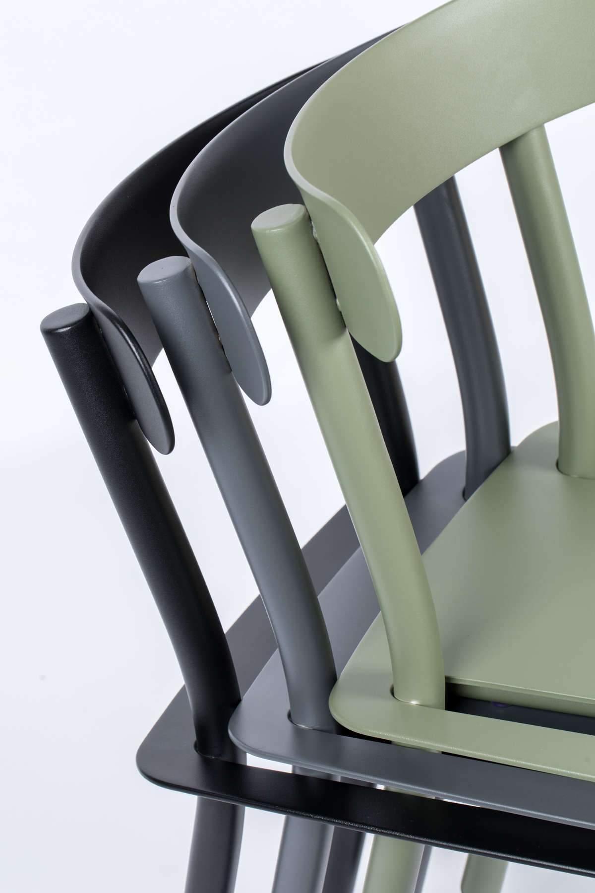 Krzesło wykonane z ramy aluminiowej, malowanej metodą proszkowaną. Użyto również zaślepek z tworzywa sztucznego w kolorze czarnym.