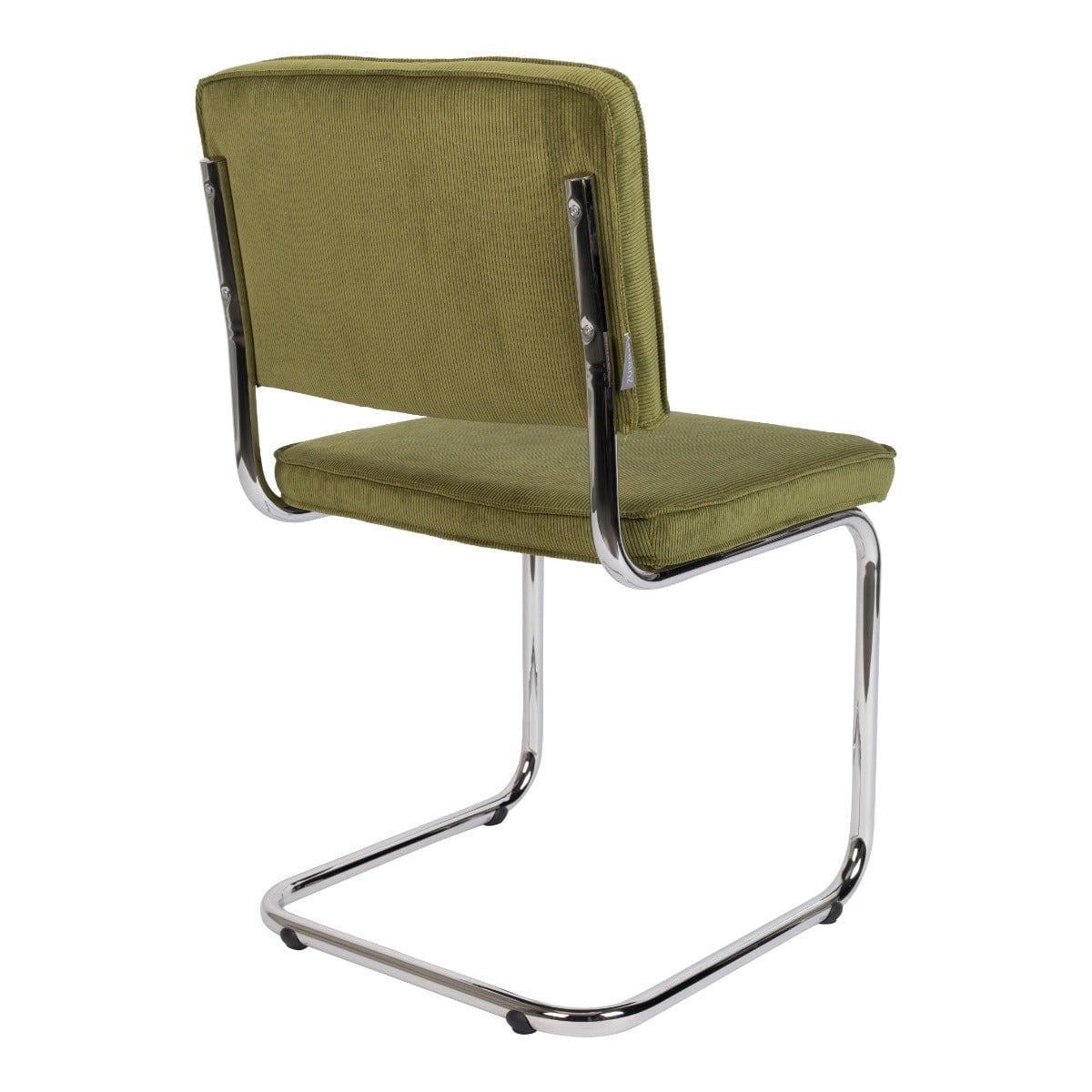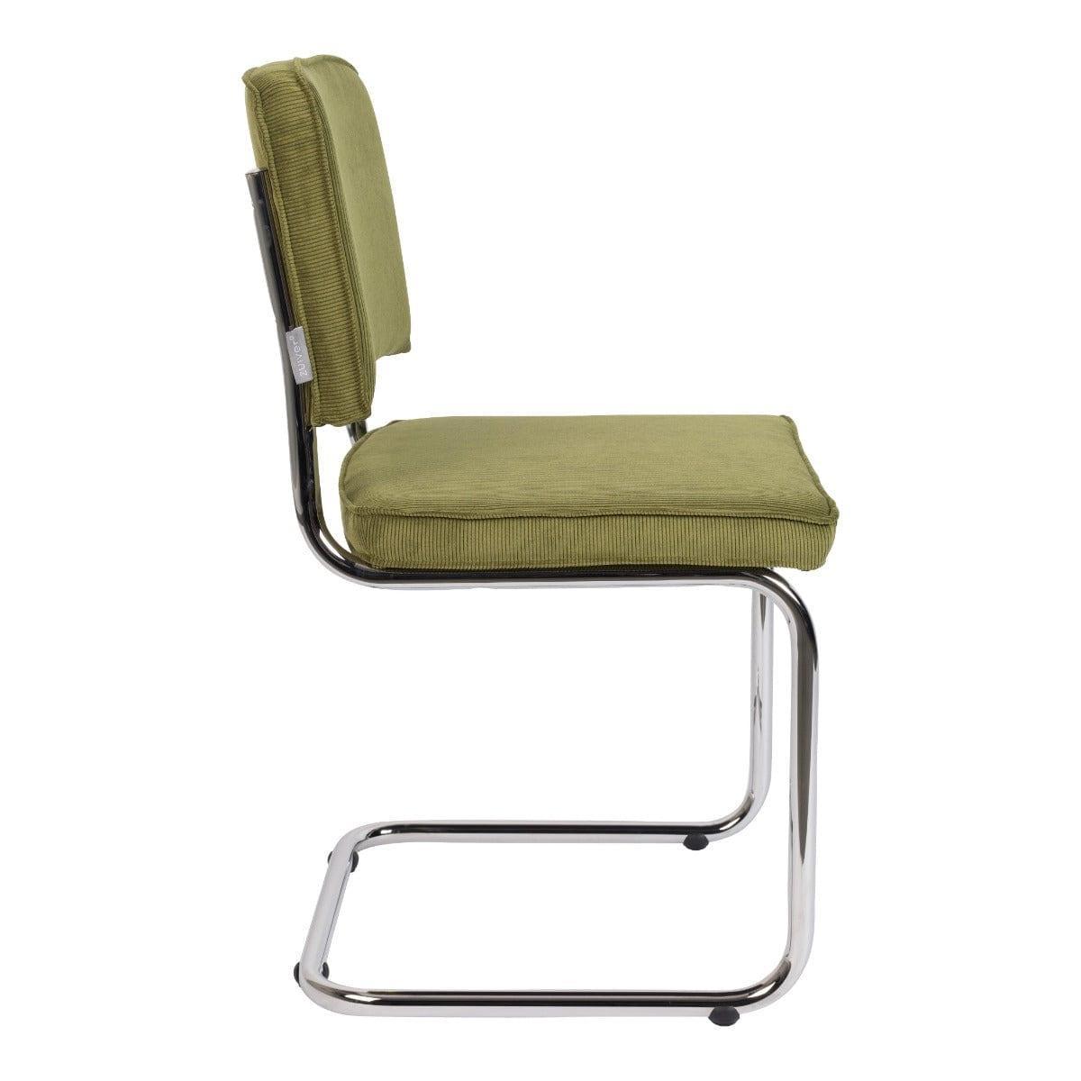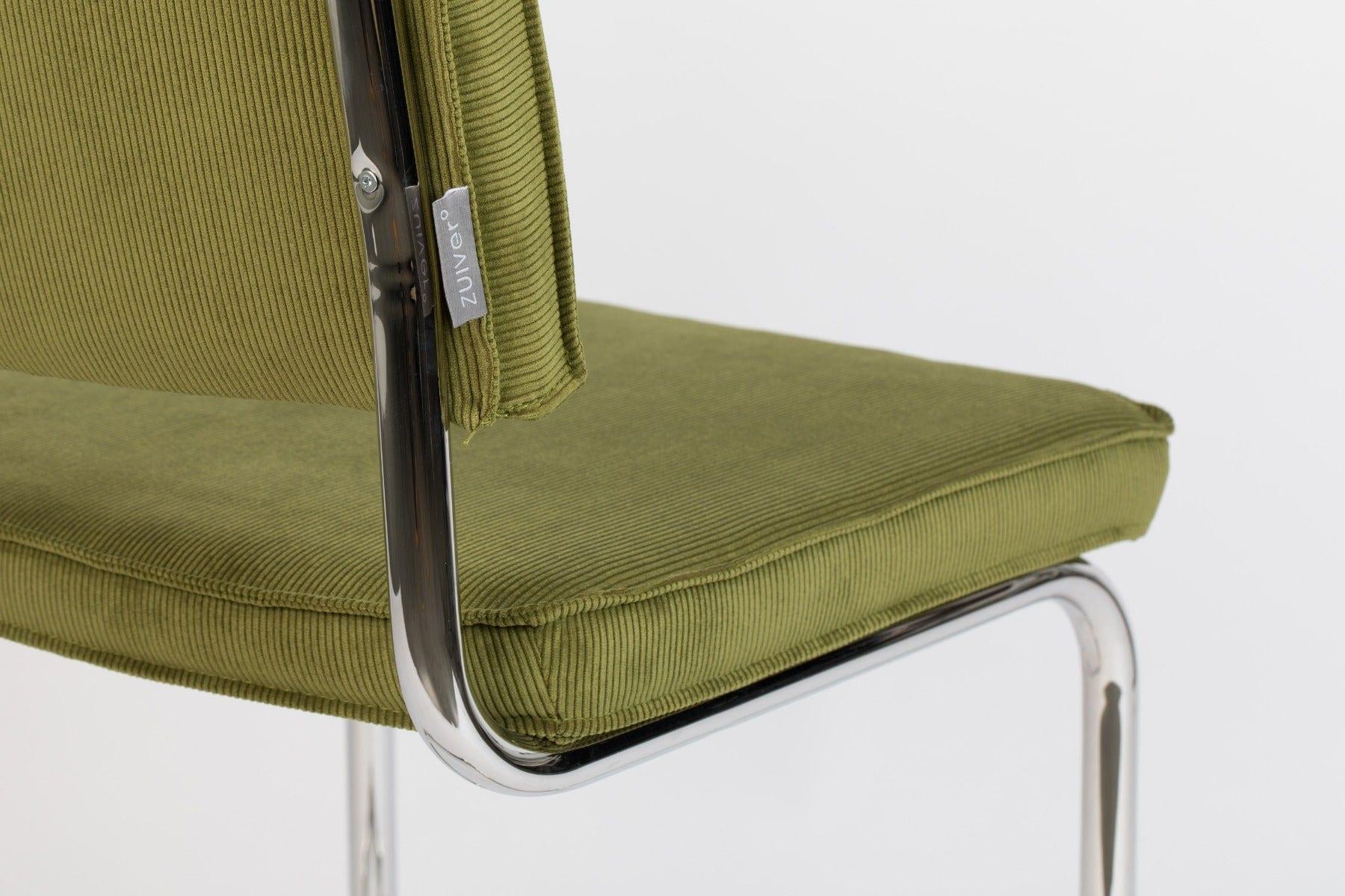 Ridge Rib to ponadczasowe krzesło, które wyróżnia nietypowy stelaż. Sztruksowe, zielone wykończenie i podstawa typu płoza z chromowanego metalu tworzą niesamowite połączenie vintage z nowoczesnym wzornictwem.