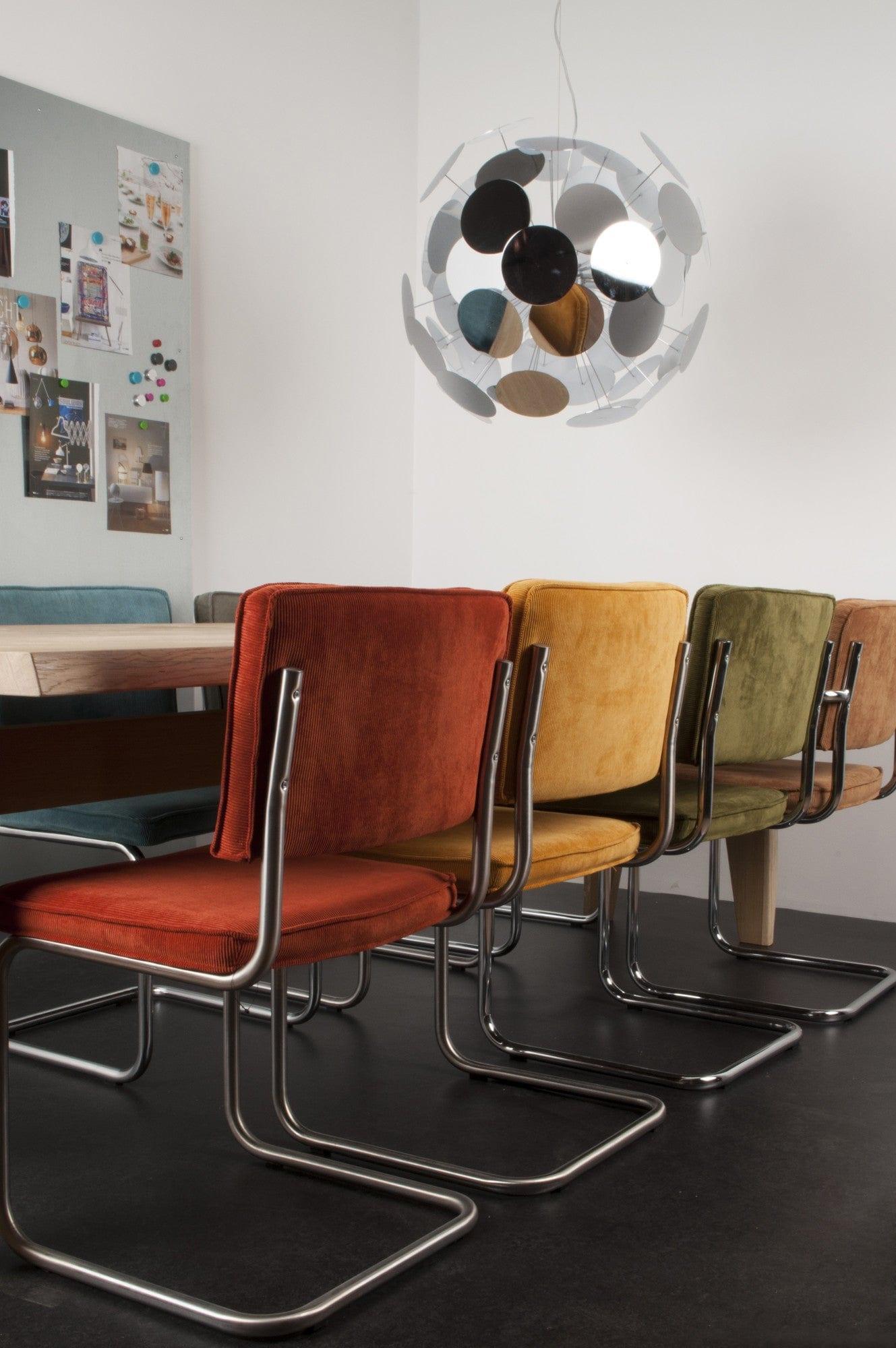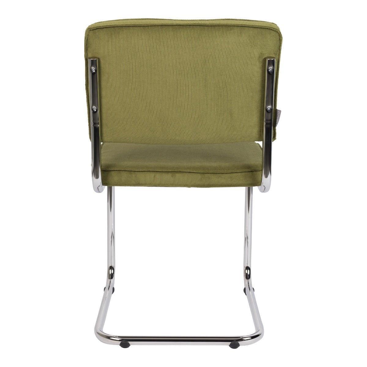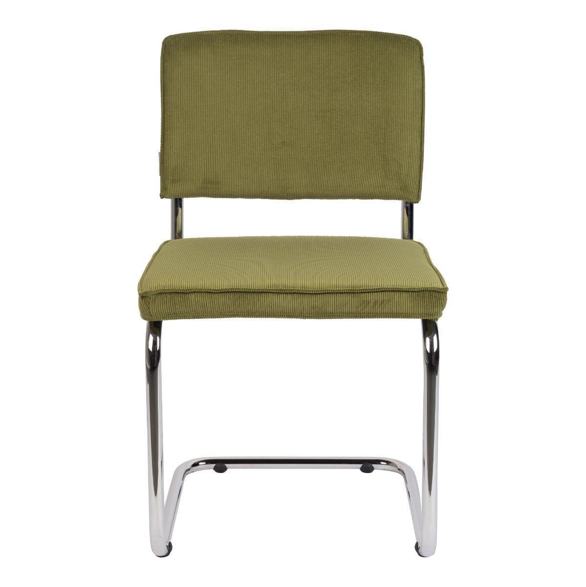 Ridge Rib to ponadczasowe krzesło, które wyróżnia nietypowy stelaż. Sztruksowe, zielone wykończenie i podstawa typu płoza z chromowanego metalu tworzą niesamowite połączenie vintage z nowoczesnym wzornictwem.