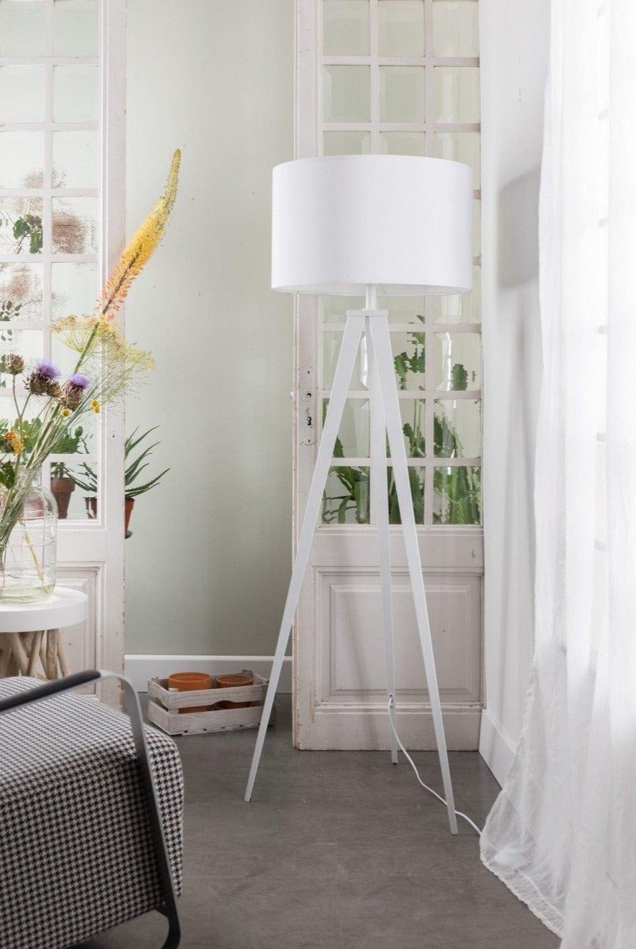 Eleganckie, długie i metalowe nogi to znak rozpoznawczy lampy podłogowej Tripod. Surowość wyglądu została przełamana białym kloszem wykonanym z poliestru, który zawsze można zdjąć dzięki wszytym rzepom.