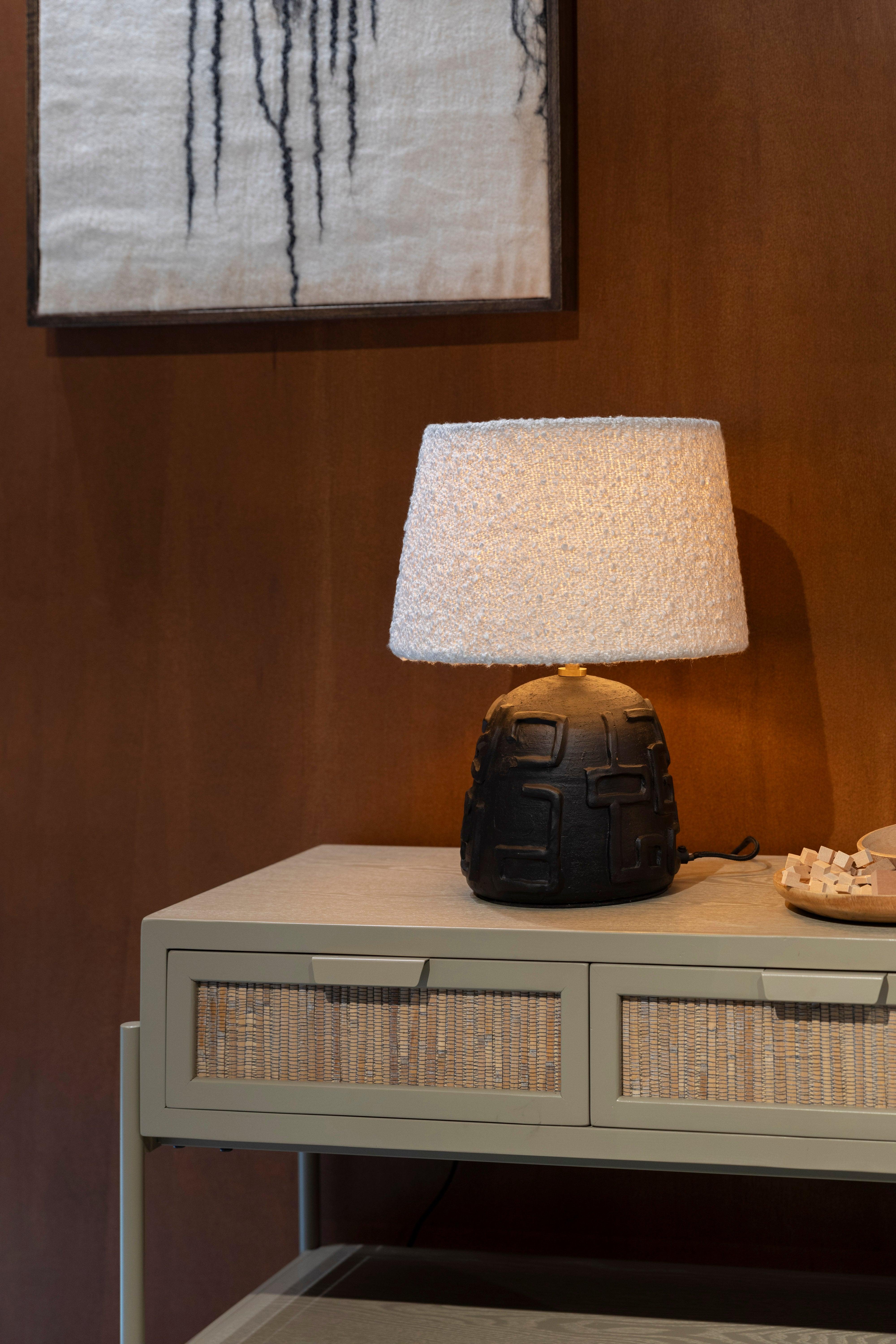 Lampa stołowa Renzo przyciąga wzrok swoim unikalnym designem i atmosferą, którą wprowadza do wnętrza. Czarne elementy konstrukcji kontrastują z białym kloszem wykonanym z grubej tektury falistej, co nadaje jej wyjątkowy charakter. Materiał ten jest nie tylko estetyczny, ale także wyjątkowo trwały, zapewniając ciepłe i delikatne światło.