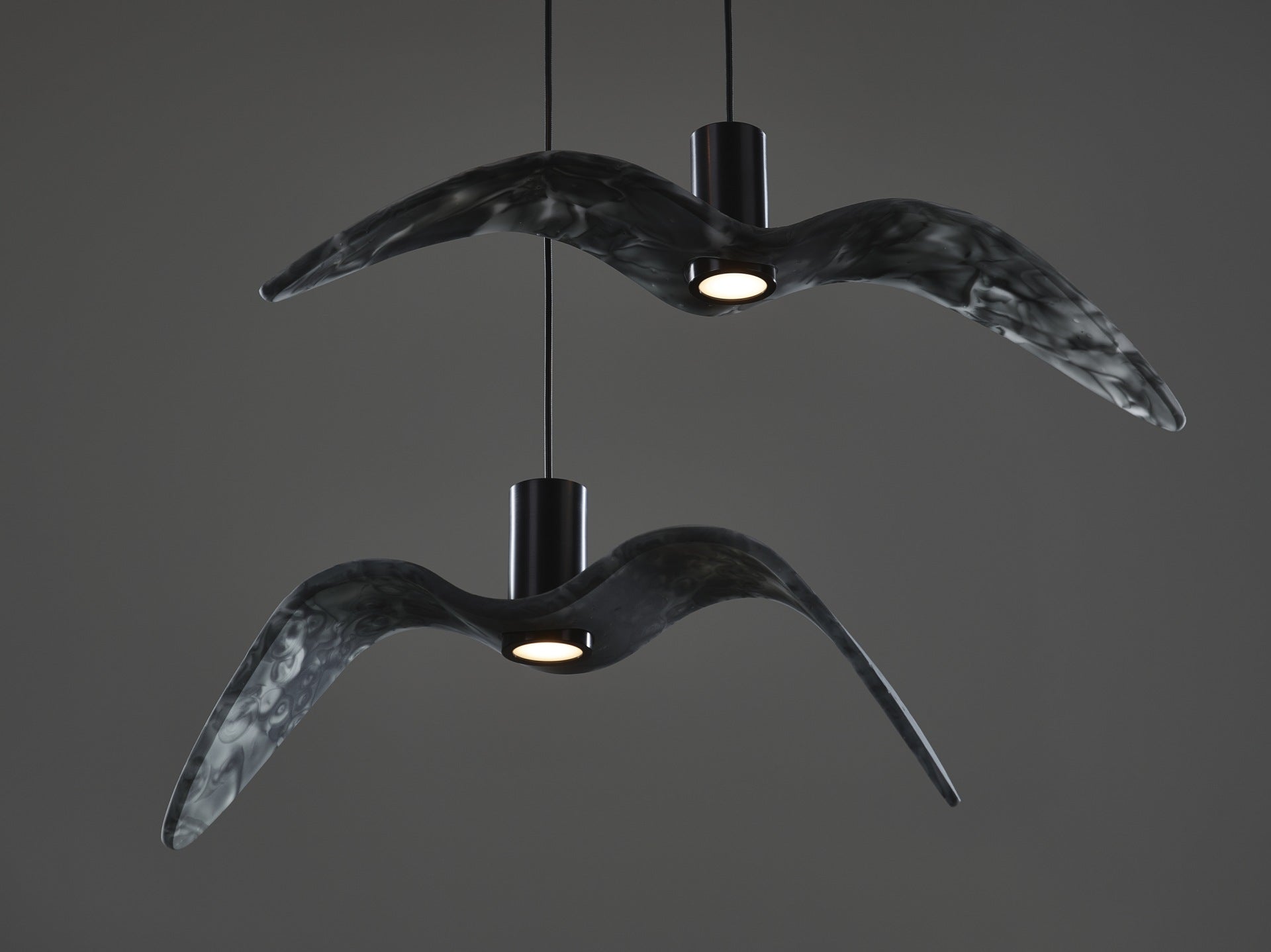 Inspirowane wolnością lotu ptaków, zewnętrzne lampy wiszące Night Birds wnoszą dynamikę i poetycki czar do przestrzeni na zewnątrz. Technologia produkcji, polegająca na formowaniu szkła przez wtapianie i wyginanie, pozwala na uzyskanie unikalnych niuansów kształtów i zabarwień. Każda lampa z tej kolekcji, osadzona w minimalistycznej oprawie z lakierowanego aluminium, reprezentuje różne fazy lotu ptaków, tworząc spektakularne aranżacje, szczególnie efektowne w grupach.