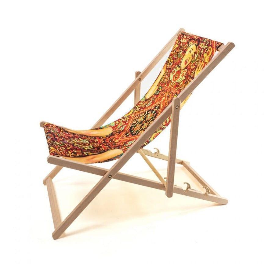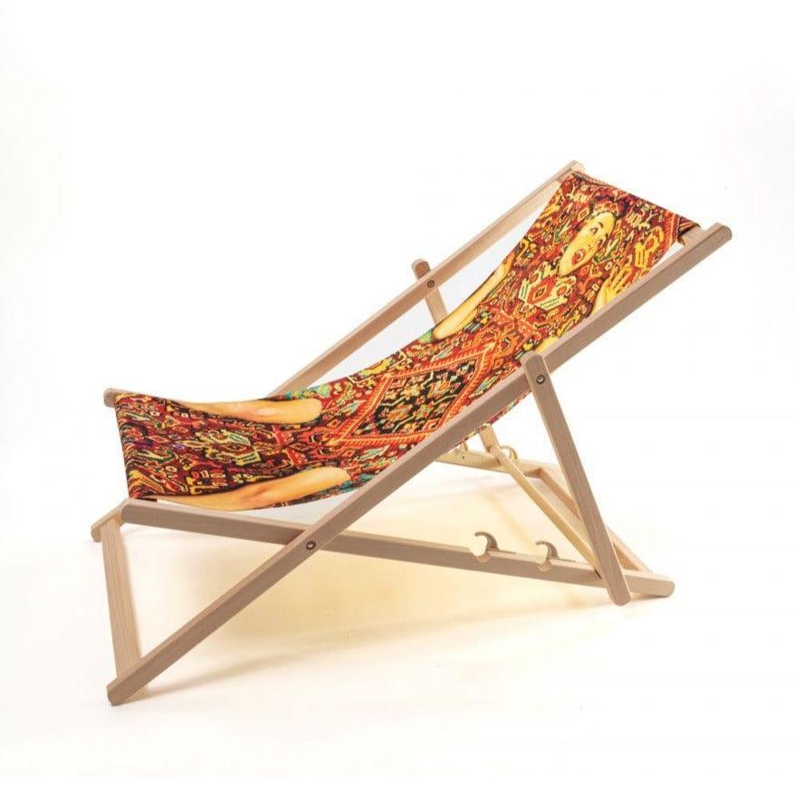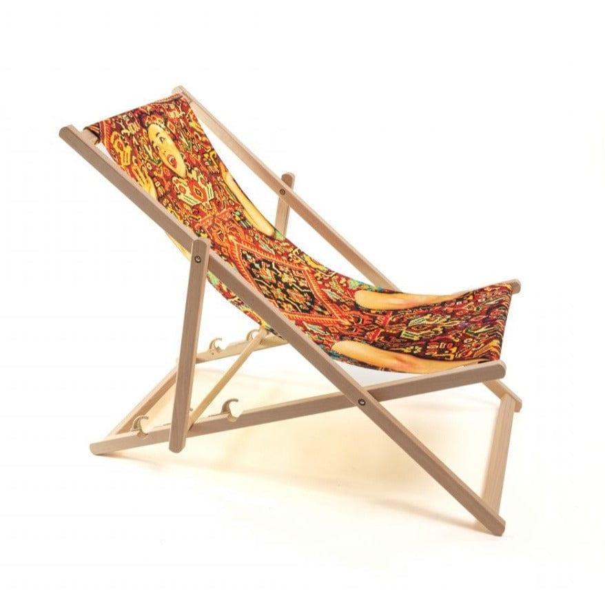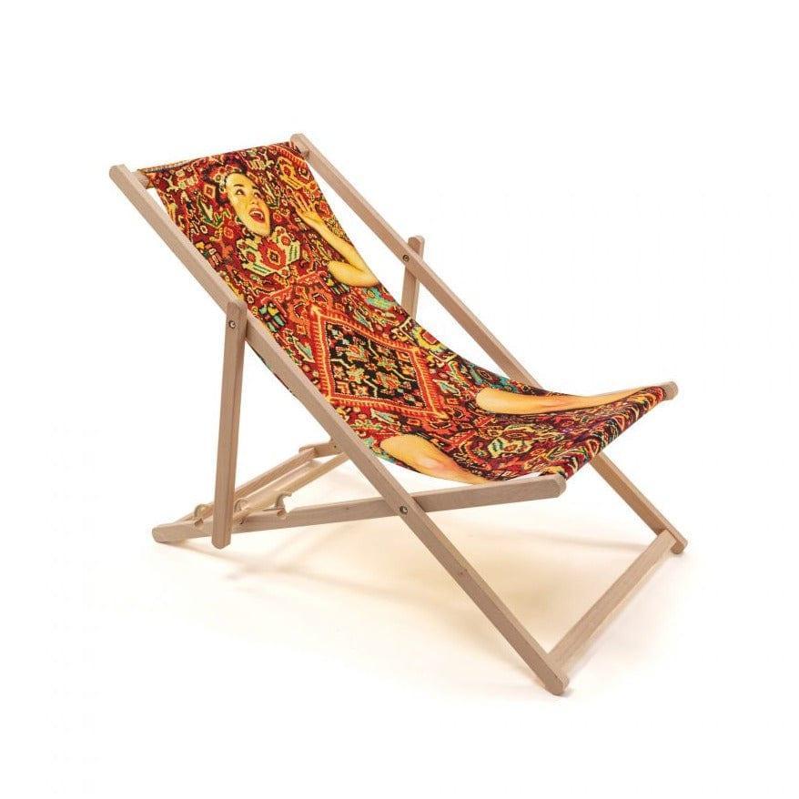 Designerski leżak Lady on Carpet od włoskiej marki Seletti to gwarancja nieustających wakacji! Usiądź wygodnie, weź ulubione czasopismo i popijaj drinka, jakby nikt cię nie obserwował. Leżak wykonano z wysokiej jakości drewna bukowego i materiału odpornego na promieniowanie UV. Posiada trzystopniową regulację oparcia.