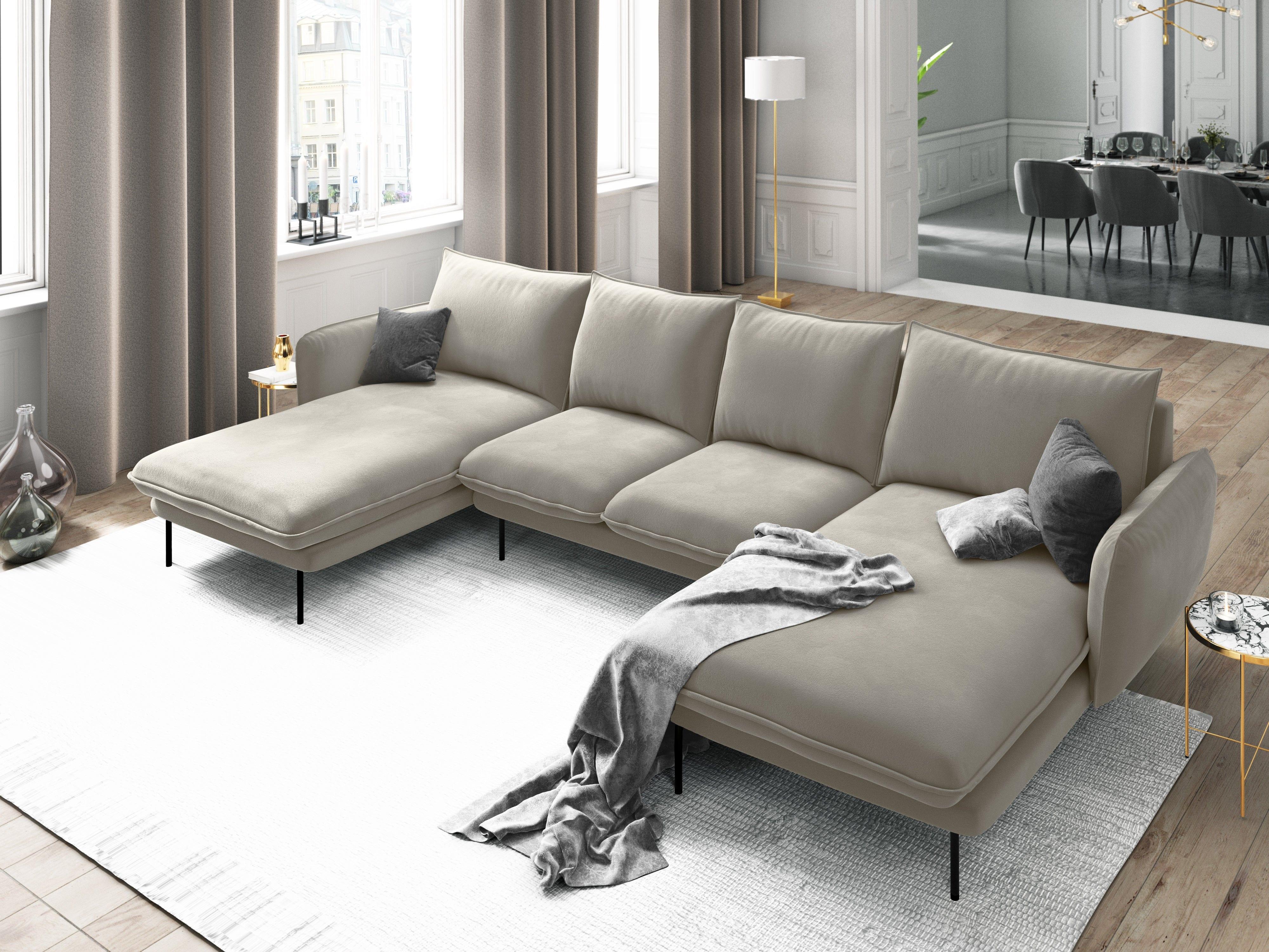 Narożnik w kształcie U Vienna wyróżniają piękne proporcje i harmonijne kształty. Narożnik do salonu jest nie tylko wygodny, ale też wprowadzi do wnętrza nutę paryskiego szyku i elegancji. Subtelna forma i miękkie siedzisko zapewnią niezwykły komfort użytkowania. Metalowe nogi nadają całej formie lekkości.