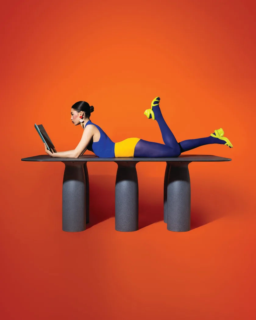 Stół wspiera się na trzech solidnych nogach w kształcie filarów, wykonanych z polietylenu nadającego się do recyklingu. Ich rzeźbiarska forma nadaje meblowi nowoczesny charakter i podkreśla minimalistyczne linie projektu. Ten wyjątkowy stół tworzy funkcjonalne miejsce do spotkań i rozmów, jednocześnie stanowiąc wyjątkowy akcent aranżacji.