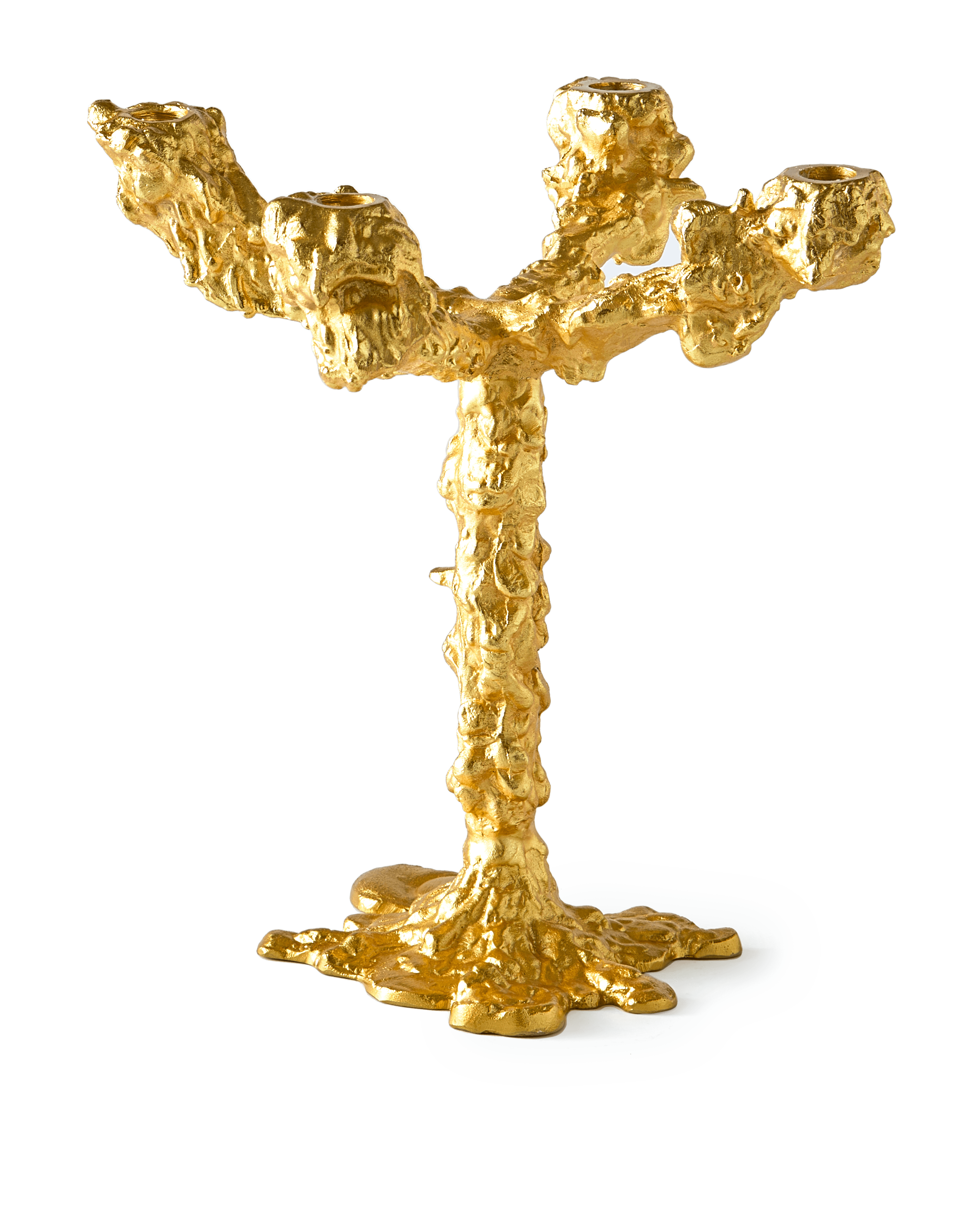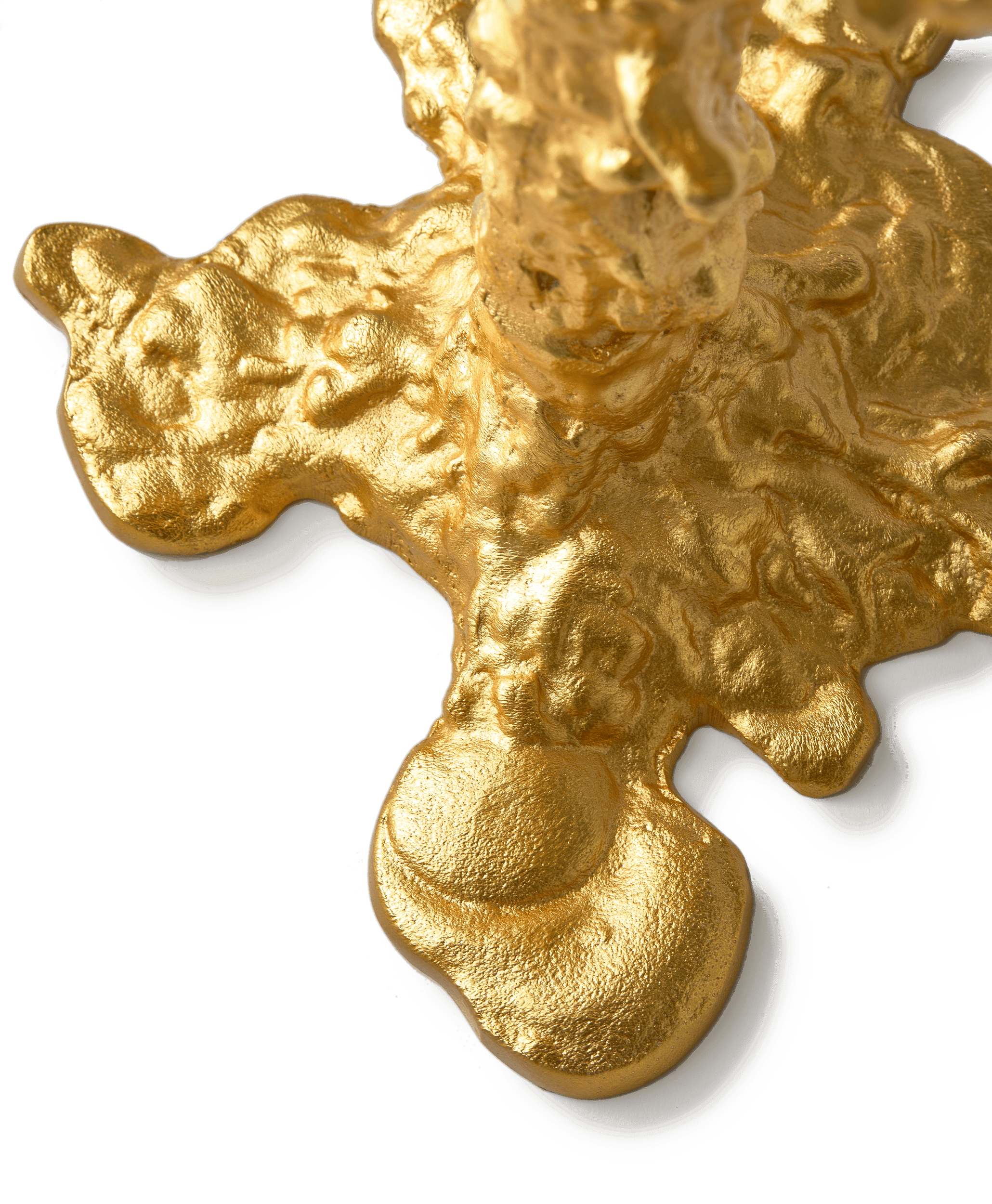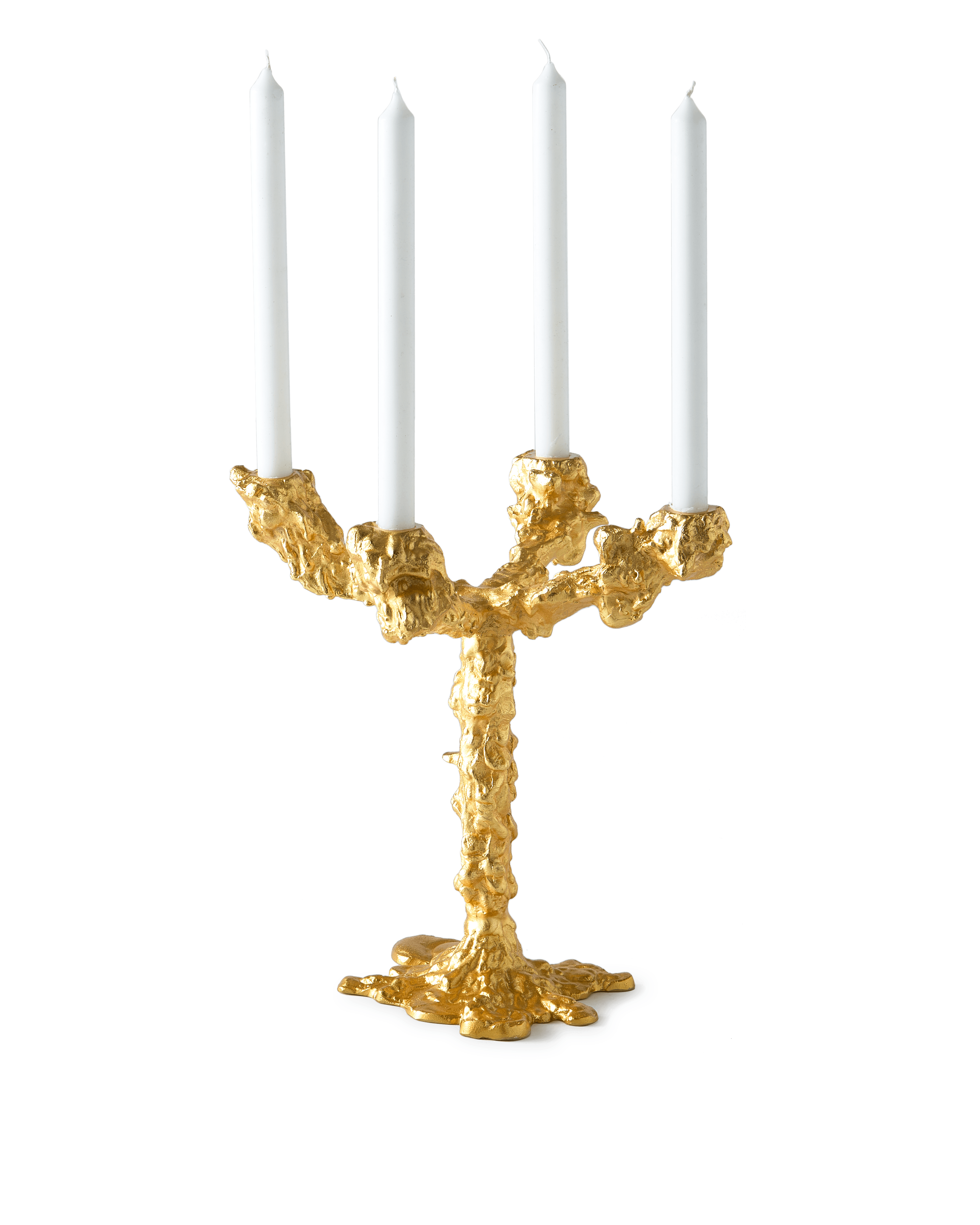 Ten świecznik błyszczy jako samodzielny element dekoracyjny na kominku i zaczarowuje, kiedy jest oświetlany na stole. Każdy zakręt i krzywizna jego powierzchni z pozłacanego aluminium jest wyjątkowy, co czyni go dziełem sztuki zaprojektowanym przez twórcę, Pascala Smelika, którego fascynuje deformacja i unikalność. Drip w sposób teatralny wyciąga swoje ramiona i wchodzi na scenę jako majestatyczny punkt kulminacyjny w Twoim wystroju.
