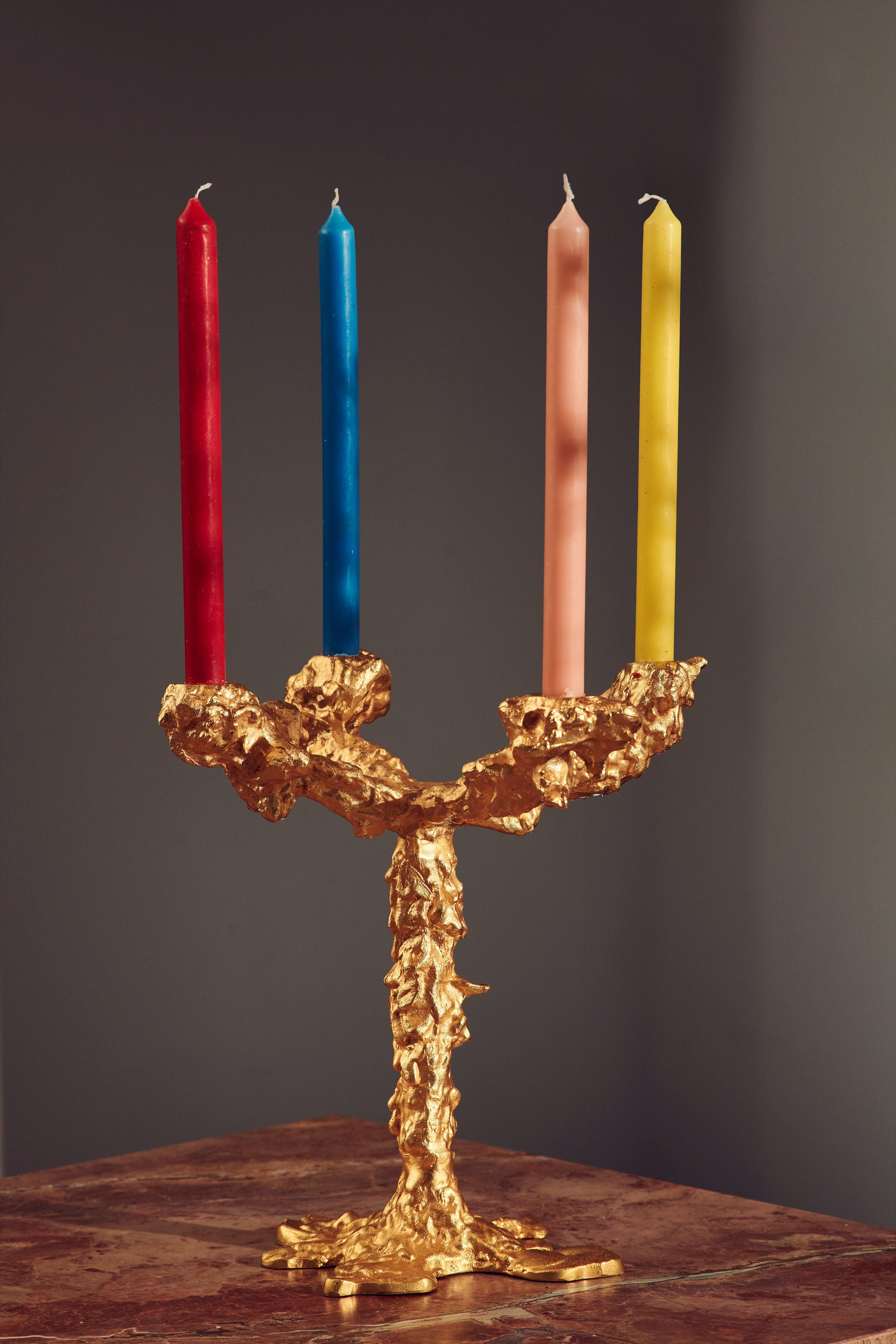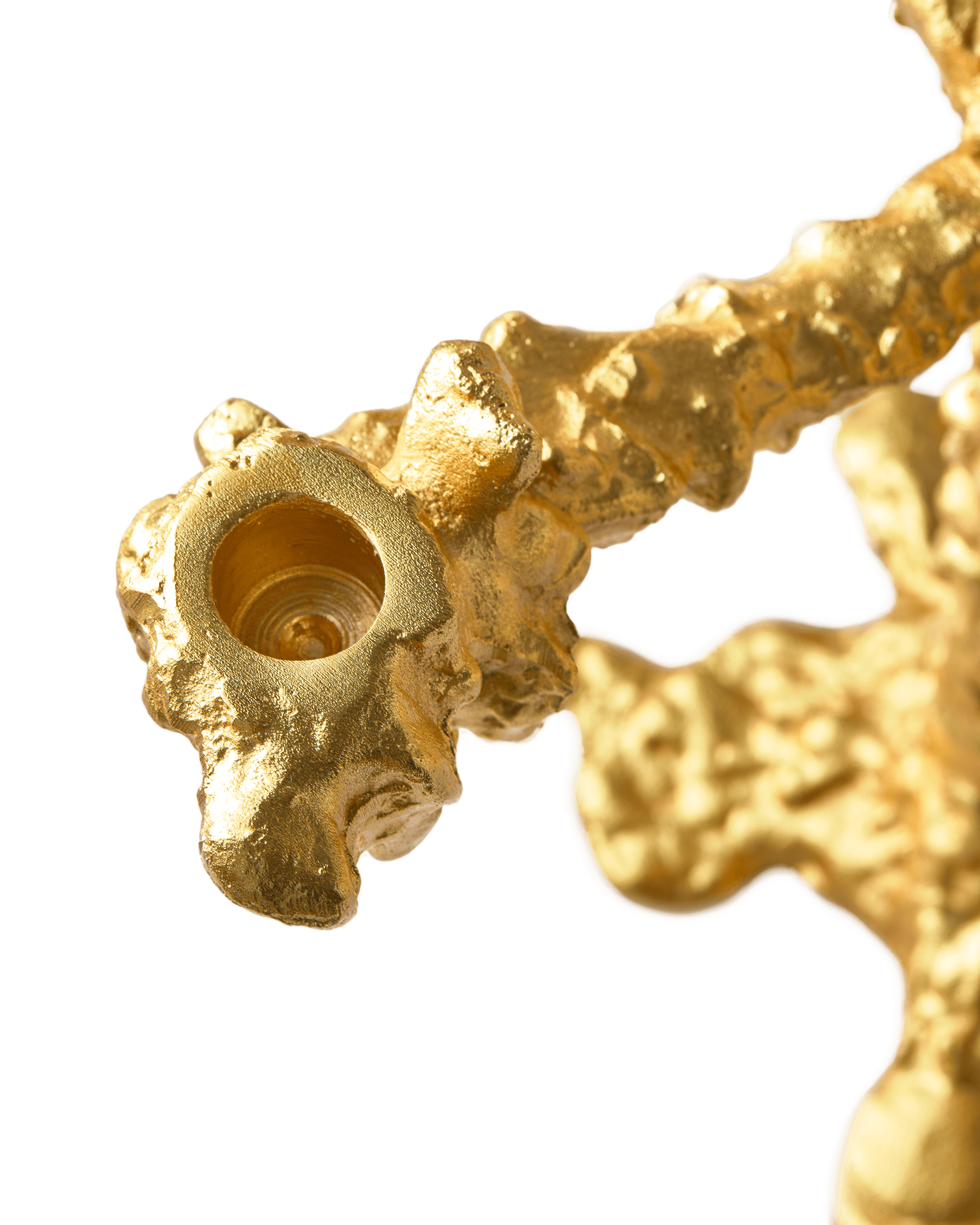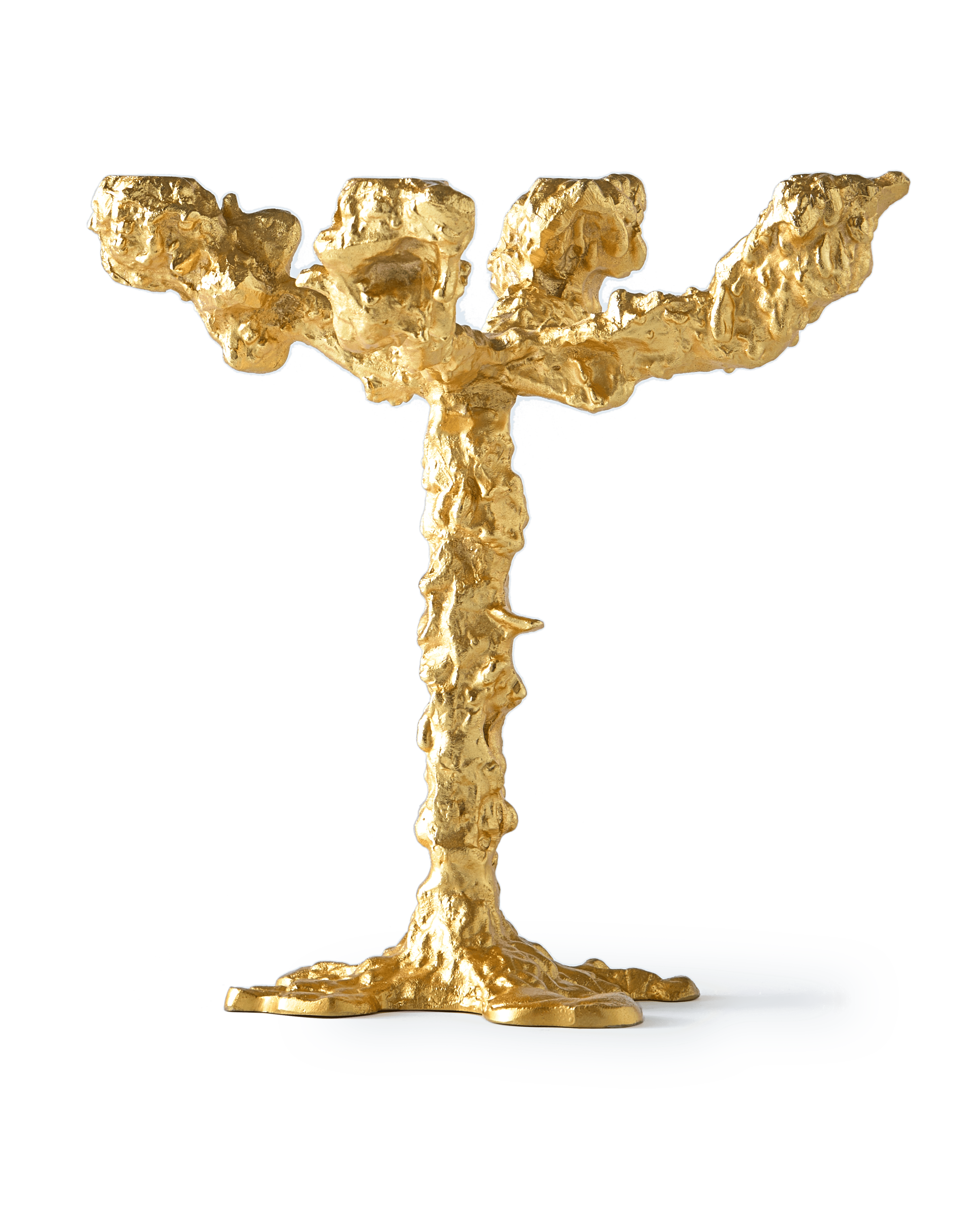 Ten świecznik błyszczy jako samodzielny element dekoracyjny na kominku i zaczarowuje, kiedy jest oświetlany na stole. Każdy zakręt i krzywizna jego powierzchni z pozłacanego aluminium jest wyjątkowy, co czyni go dziełem sztuki zaprojektowanym przez twórcę, Pascala Smelika, którego fascynuje deformacja i unikalność. Drip w sposób teatralny wyciąga swoje ramiona i wchodzi na scenę jako majestatyczny punkt kulminacyjny w Twoim wystroju.