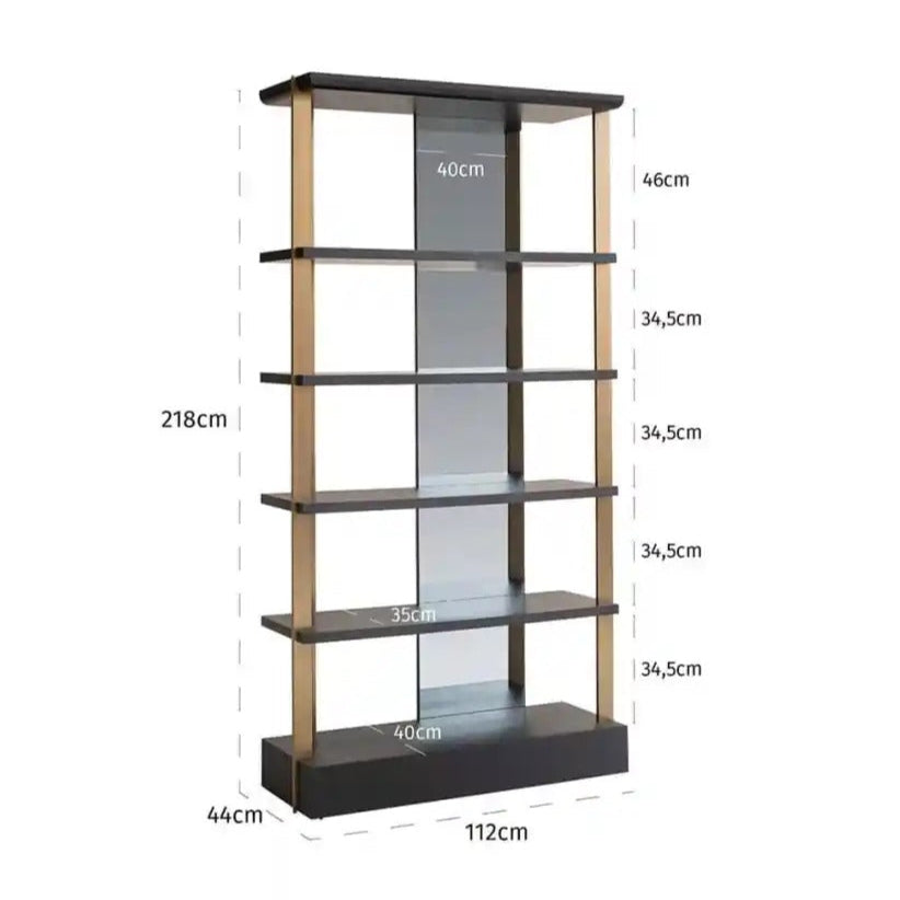 Elegancki regał Rigley z lustrem to propozycja dla osób, które cenią połączenie nowoczesnego designu z funkcjonalnością. Wysoka konstrukcja i smukłe proporcje sprawiają, że mebel doskonale wpisze się zarówno w salon, jak i przestrzeń biurową czy reprezentacyjny hol. Lustrzany tył optycznie powiększa wnętrze, a czarne półki i złote detale dodają całości luksusowego charakteru.