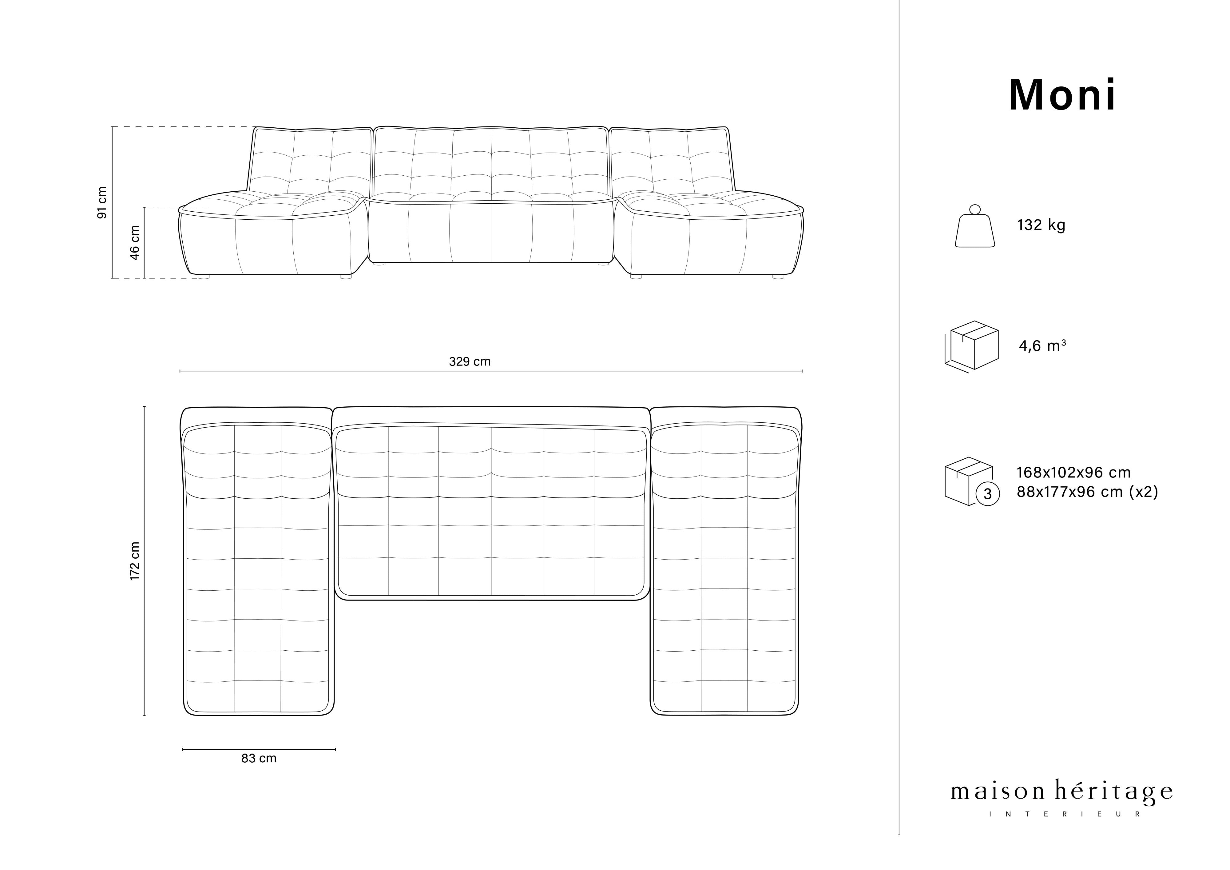 Tapicerka z tkaniny strukturalnej, której drobno pleciona struktura przypomina aksamit o niejednolitej powierzchni, jest przyjemna w dotyku i wyjątkowo trwała. Ergonomiczne kształty zapewniają swobodne podparcie całych pleców. Kolekcja Moni obejmuje kilka kombinacji sof i narożników, a także elementy takie jak szezlongi i pufy.