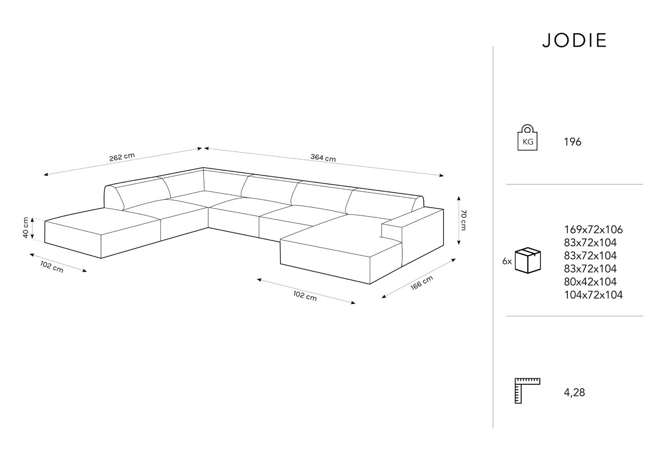 Jodie Sofa panoramiczna jest bardzo wygodna dzięki swojemu dużemu rozmiarowi, który umożliwia siedzenie na niej nawet siedmiu osobom. Dodatkowo posiada miękkie, wygodne poduszki oparciowe i siedziska, które zapewniają komfort podczas użytkowania.