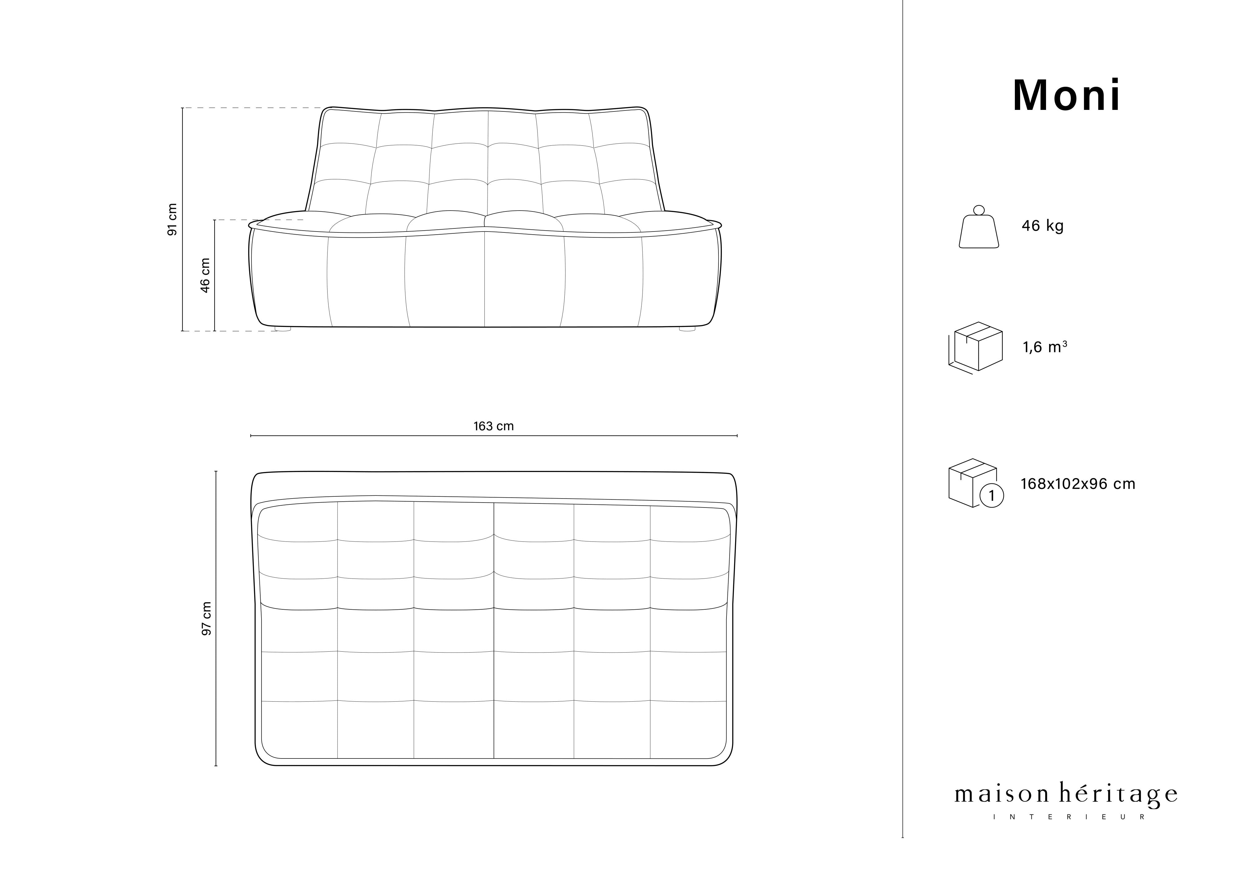 Skórzana sofa dla dwóch osób Moni definiuje funkcjonalność i wygoda w połączeniu z nowoczesnym designem. Stylowe pikowanie i oryginalna bryła świetnie sprawdzą się zarówno w eleganckim salonie, jak i w nowoczesnym biurze. Linia siedziska i oparcia jest wygięta w łuk i posiada delikatnie wyprofilowane wgłębienie, oferujące niezwykły komfort użytkowania.