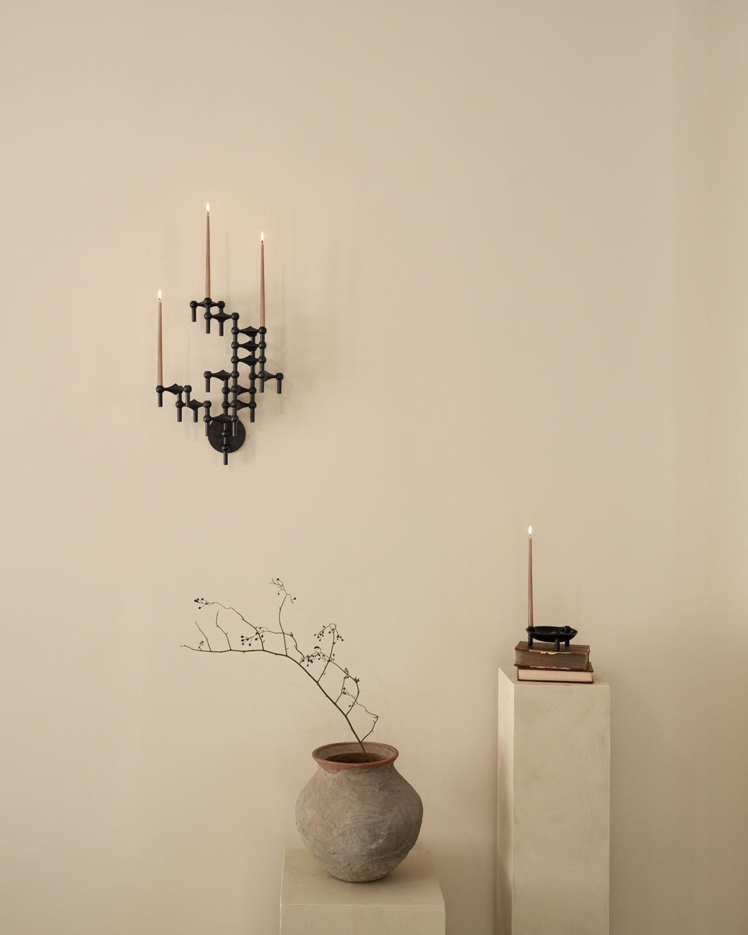 Świecznik ścienny jest zaprojektowany, aby rozszerzyć wizualne możliwości STOFF Nagel. Zainspirowany ikonicznym designem, świecznik ścienny umożliwia tworzenie unikalnych rzeźb na powierzchniach pionowych w nieskończonych kombinacjach ze świecznikiem, misą i wazonem. Świecznik ścienny jest subtelny i dyskretny, zachęcając do odkrywania indywidualnych sposobów eksponowania kolekcji STOFF Nagel.