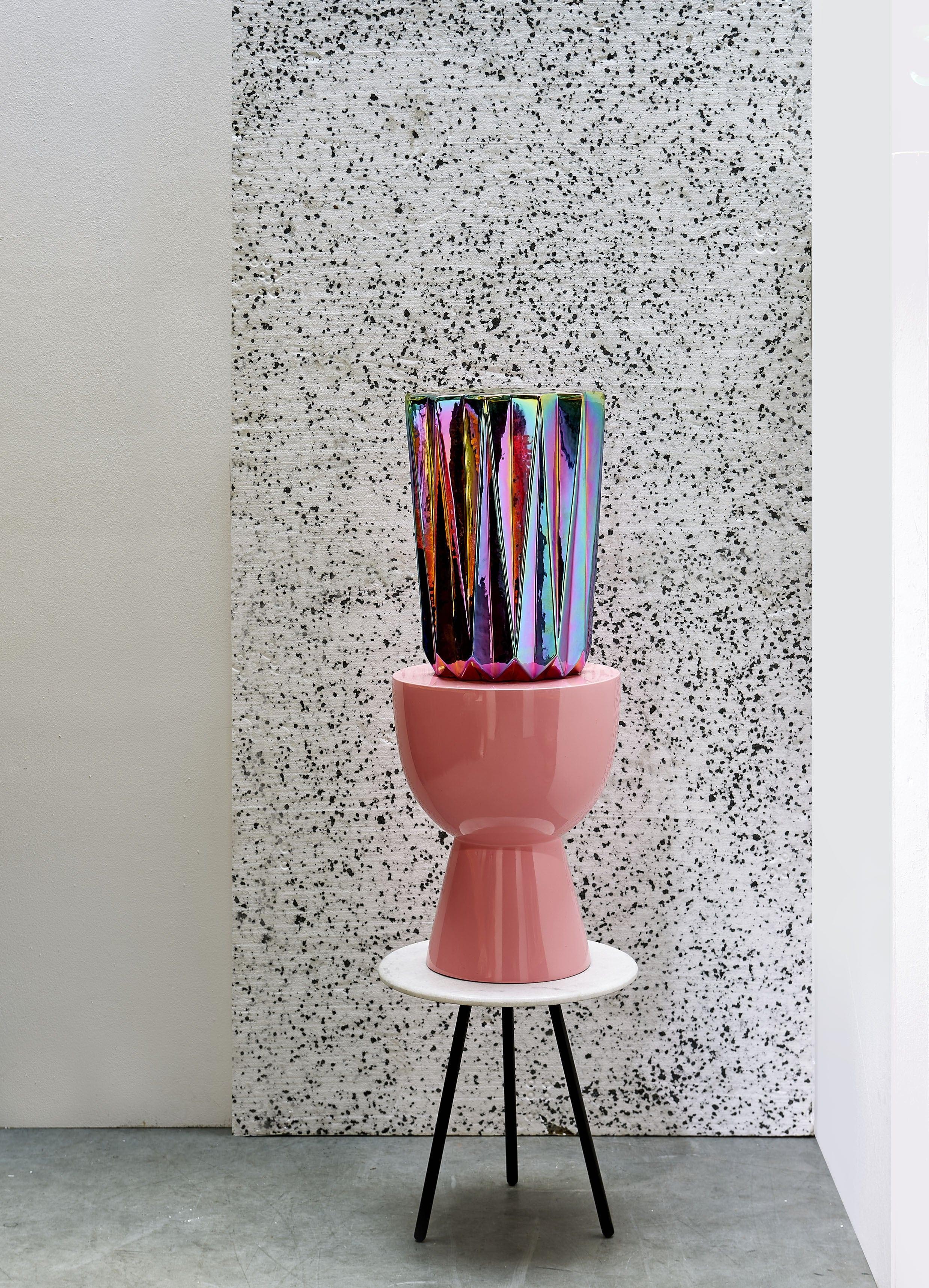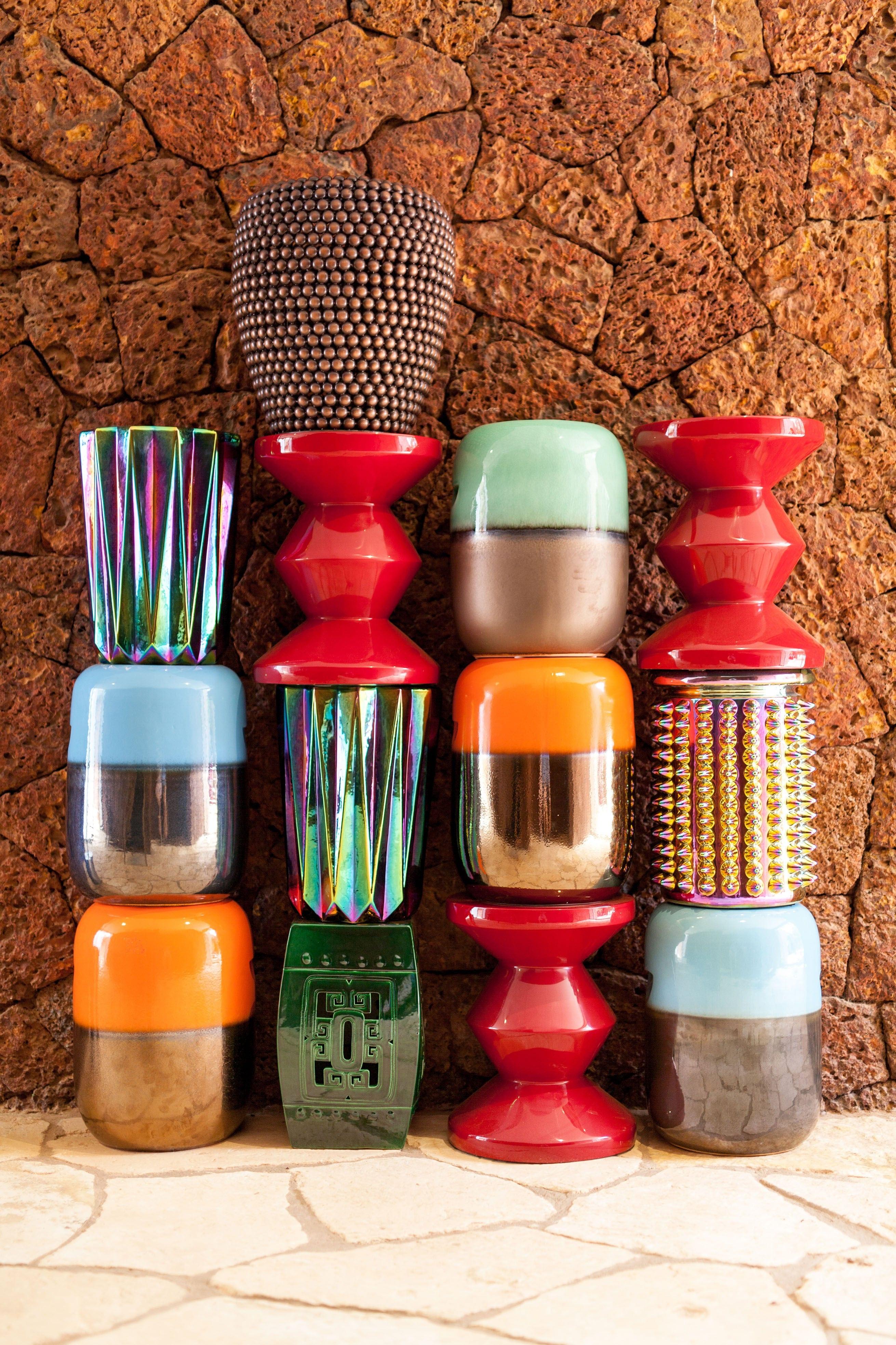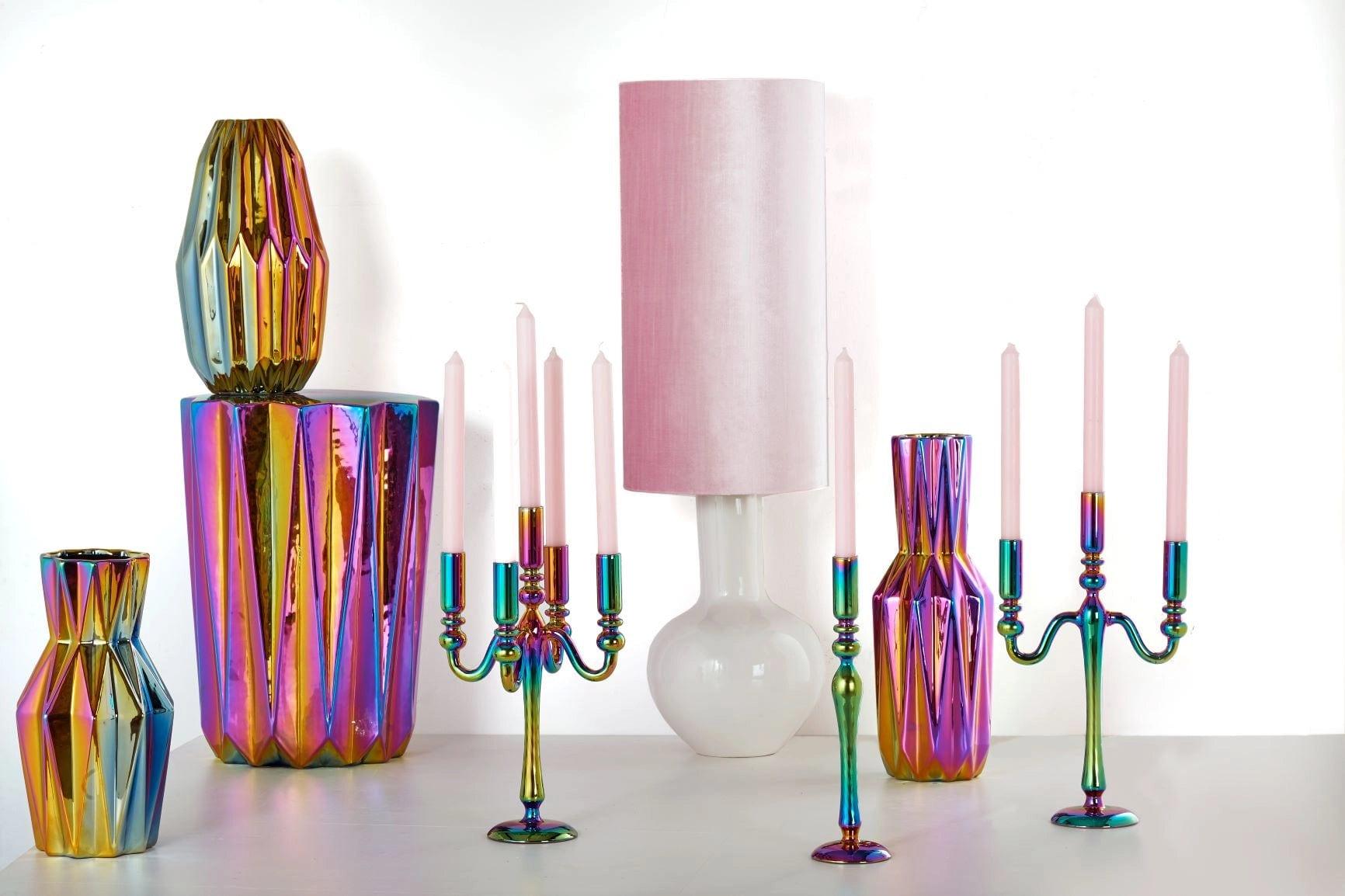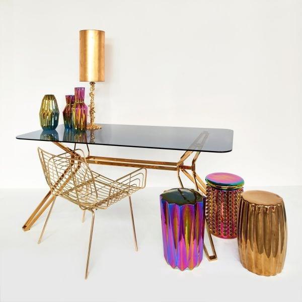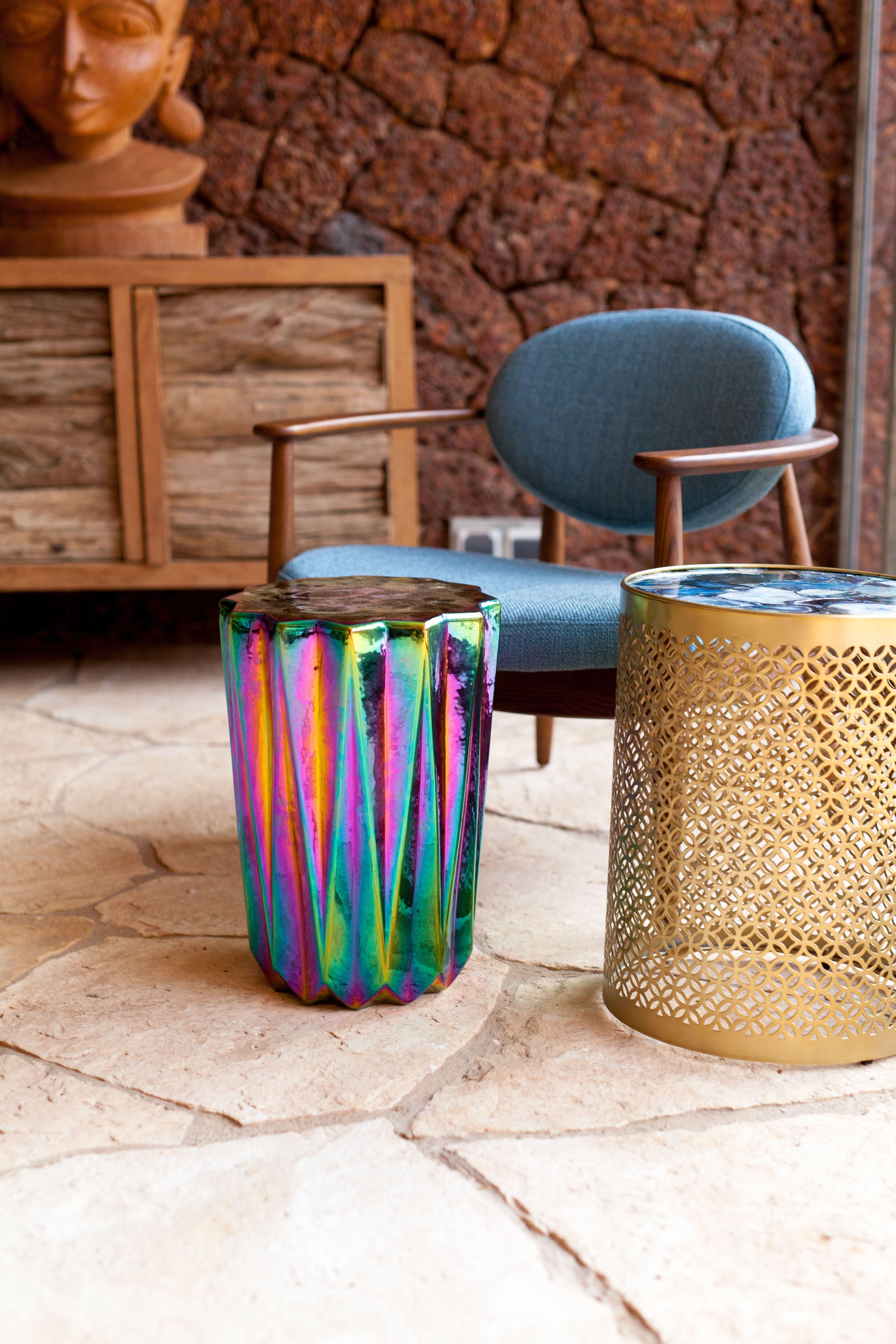 Stołek Oily Folds to niezwykły dodatek zaprojektowany przez Rodericka Vosa. Gra kolorów oraz charakterystyczny odcień benzyny znajdującej się w kałuży wody sprawia, że stołek Oily Busk przeniesie Cię w zupełnie inny świat pełen bajkowych kształtów i niebanalnego designu.