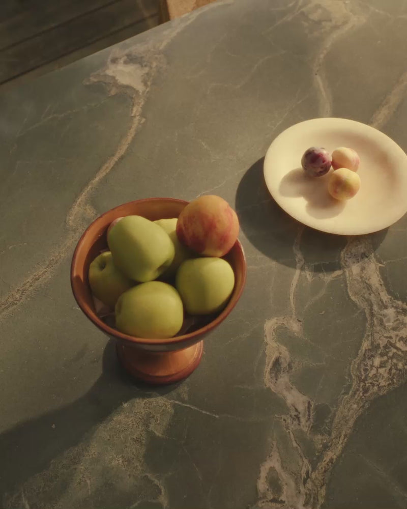 Stół Epic to wyjątkowy projekt autorstwa duetu GamFratesi, który przenosi monumentalną estetykę inspirowaną architekturą starożytnej Grecji i Rzymu w przestrzeń zewnętrzną. Wersja ogrodowa wykonana z naturalnego kwarcytu Botanic Green zachwyca rzeźbiarską sylwetką i wyjątkową teksturą. Każdy stół jest unikalny – charakterystyczne żyłkowanie, ciemnozielony odcień z domieszką czerni i połyskujących kryształków kwarcu tworzą naturalne dzieło sztuki użytkowej.