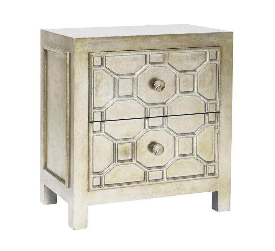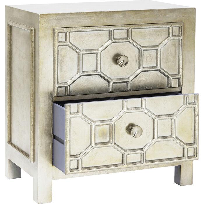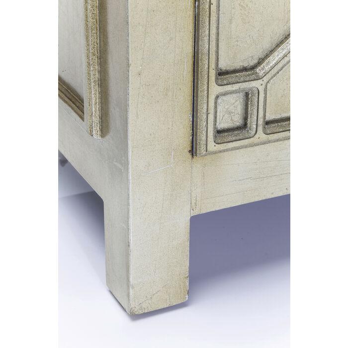 Szafka Alhambra to hołd dla ornamentyki i detali inspirowanych sztuką arabską. Jej przednia część wyróżnia się misternymi wzorami, podkreślonymi ekskluzywnym, matowym wykończeniem w srebrnym kolorze, co dodaje jej elegancji i luksusowego wyglądu idealnie pasującego do stylu glamour.