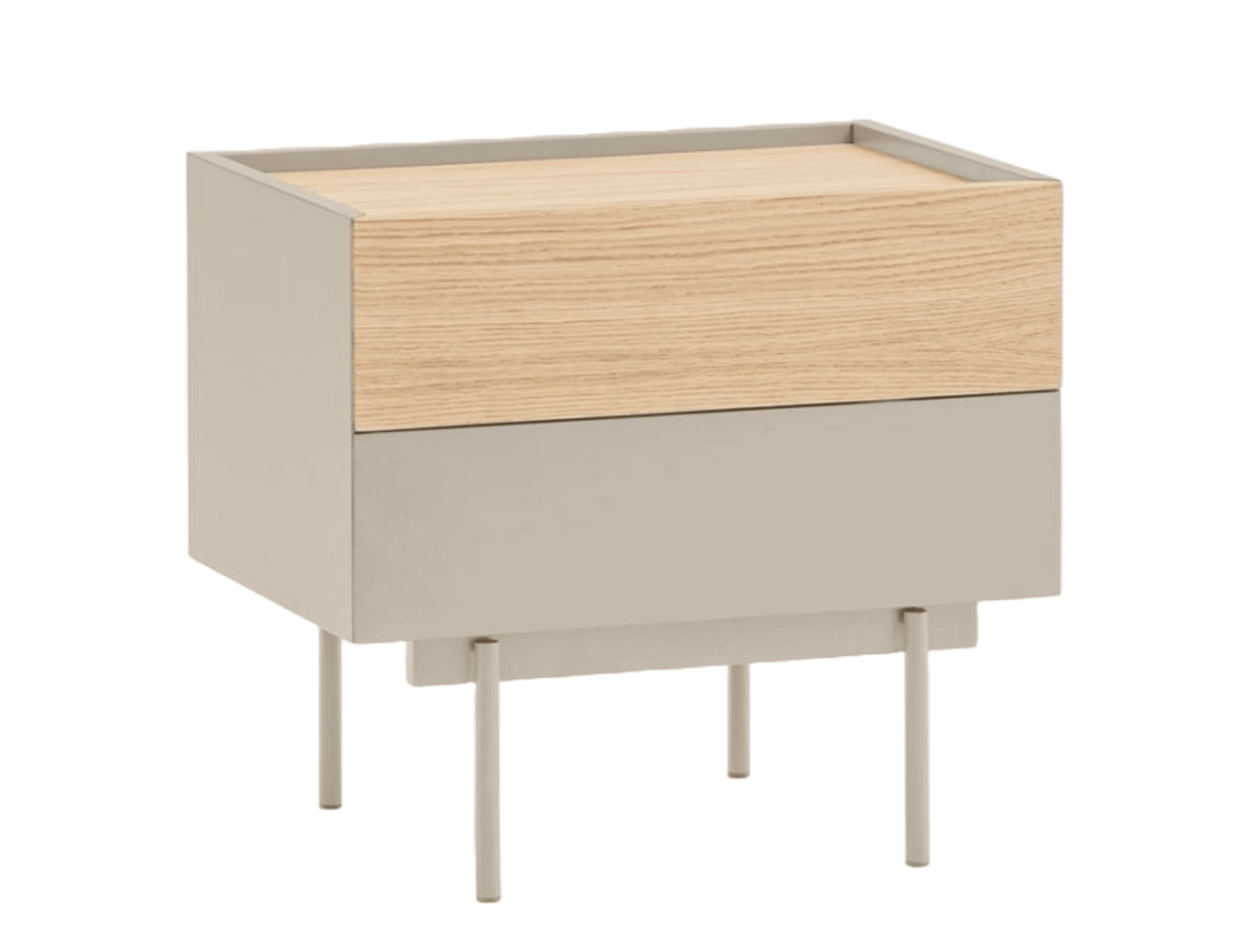 Szafka nocna stojąca na nóżkach Otto w kolorze beżowym wyróżnia się nowoczesnym stylem o czystych liniach, gdzie kolor harmonijnie łączy się z akcentami naturalnego forniru, co pozwala dopasować ją do różnorodnych przestrzeni. Jej konstrukcja z nóżkami dodaje elegancji i lekkości, a solidne oparcie zapewnia stabilność.