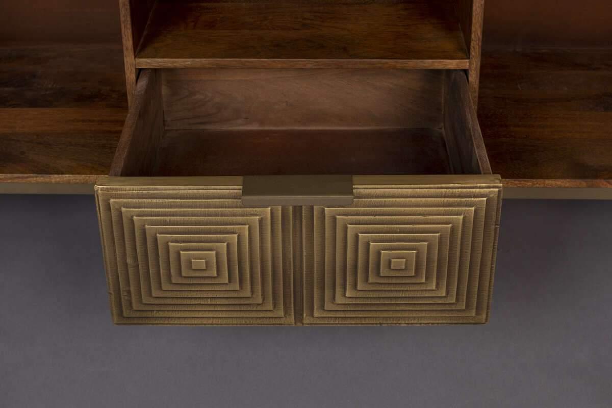 Lite drewno mango z wykończeniem w kolorze miodowym. Fronty szuflad z antycznego mosiądzu, dna z MDF. Rama z żelaza, malowana proszkowo w kolorze antycznego mosiądzu