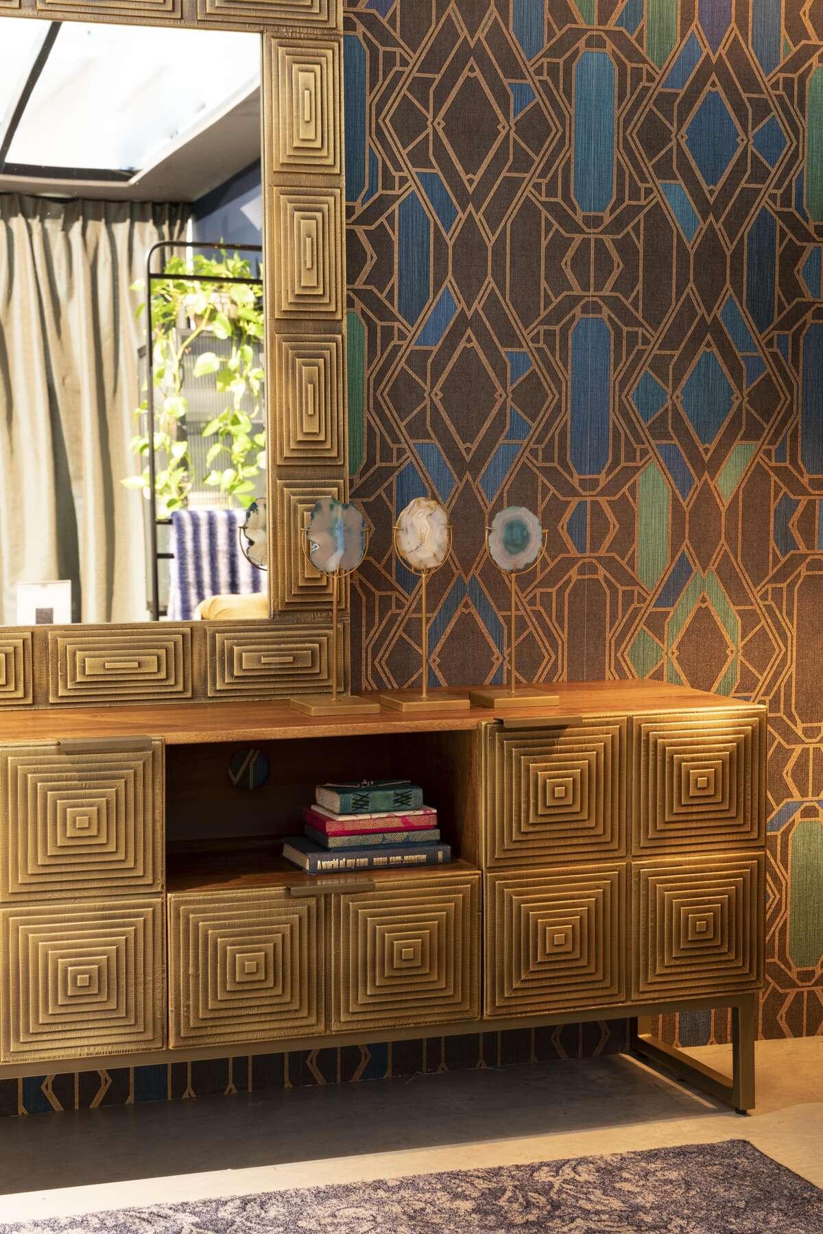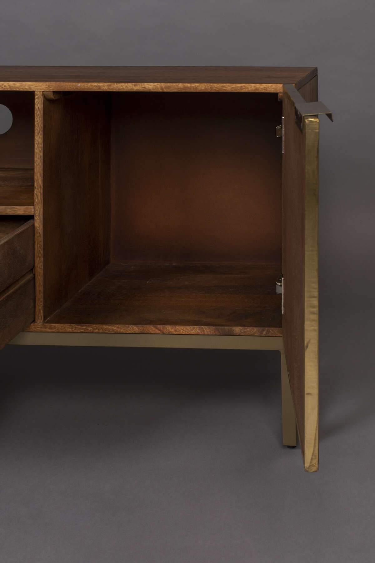 Volan to designerski kredens wykonany z litego drewna mango w kolorze miodowym. Kredens Volan wyróżnia się oryginalnym kształtem, a także stylowym wykończeniem. Mosiężne dodatki sprawiają, że kredens zyskuje antycznego charakteru, natomiast całość uzupełnia stylowa stylowa, żelazna rama, która dodaje projektowi szyku i klasy.