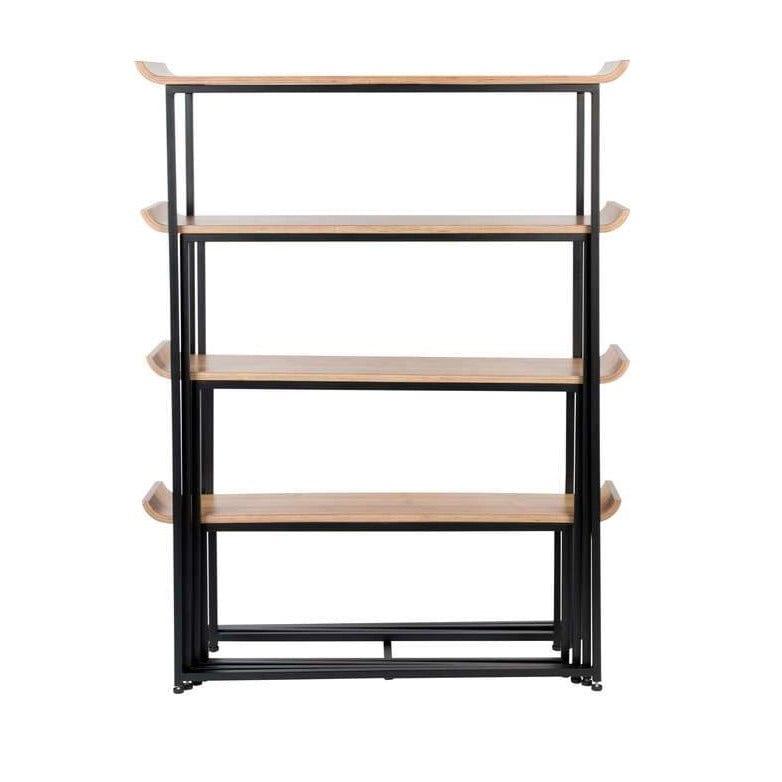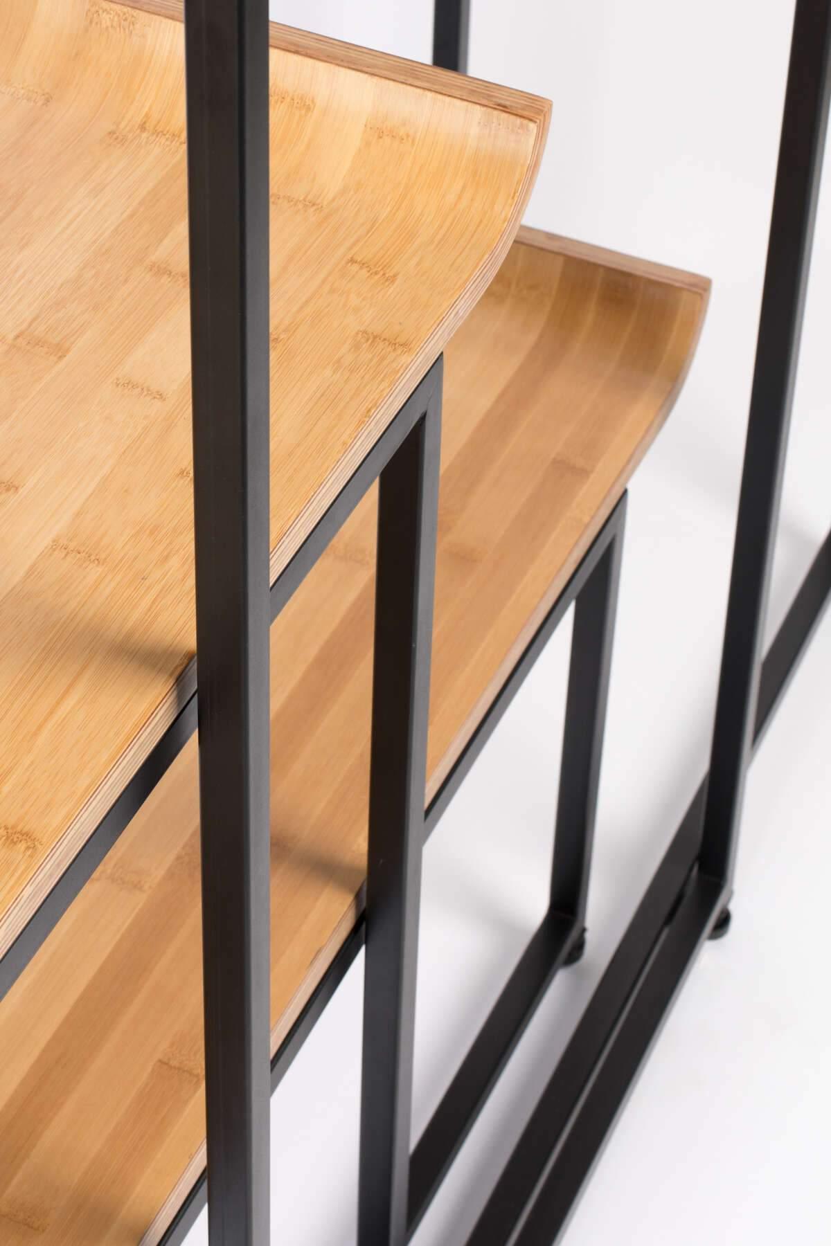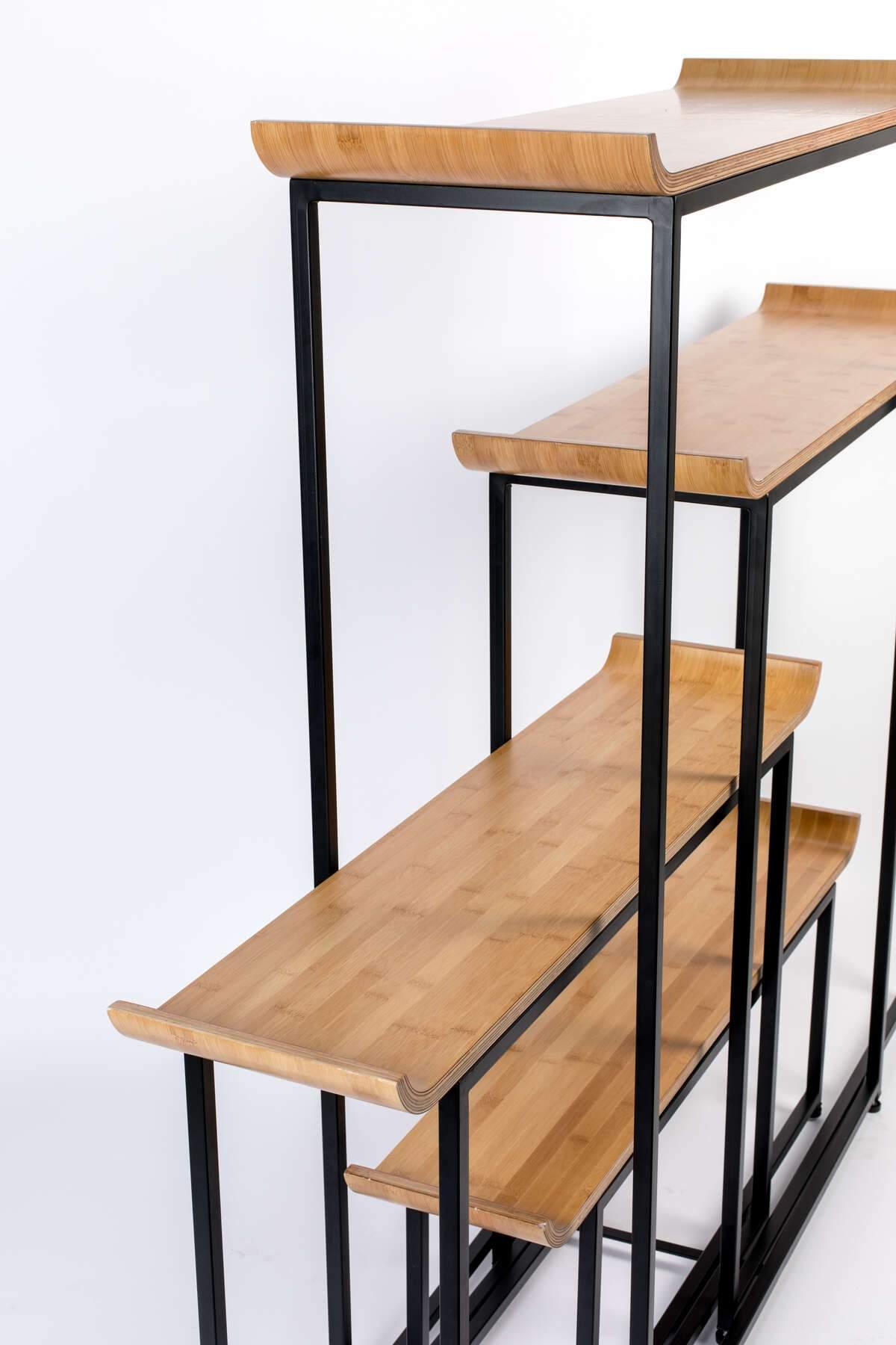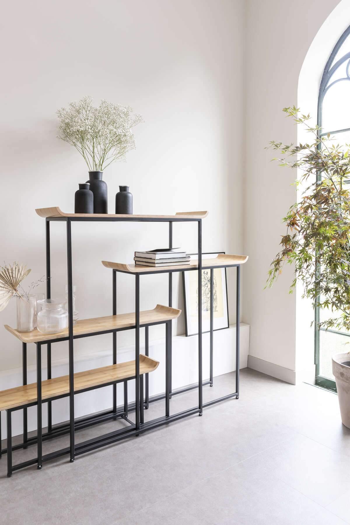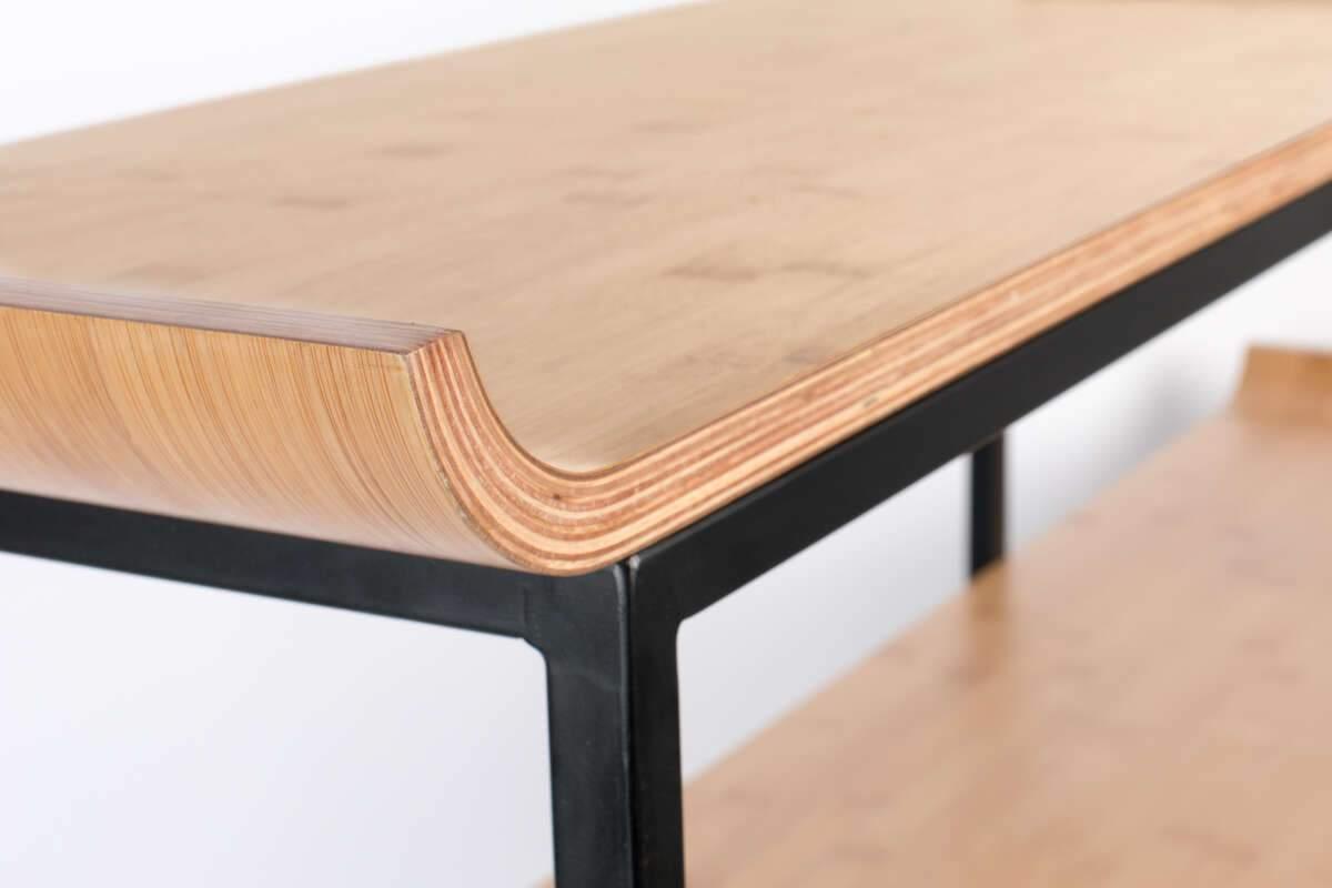 Półki ze sklejki fornirowanej 2 cm z wykończeniem z naturalnego drewna, metalowa rama malowana proszkowo na czarno.