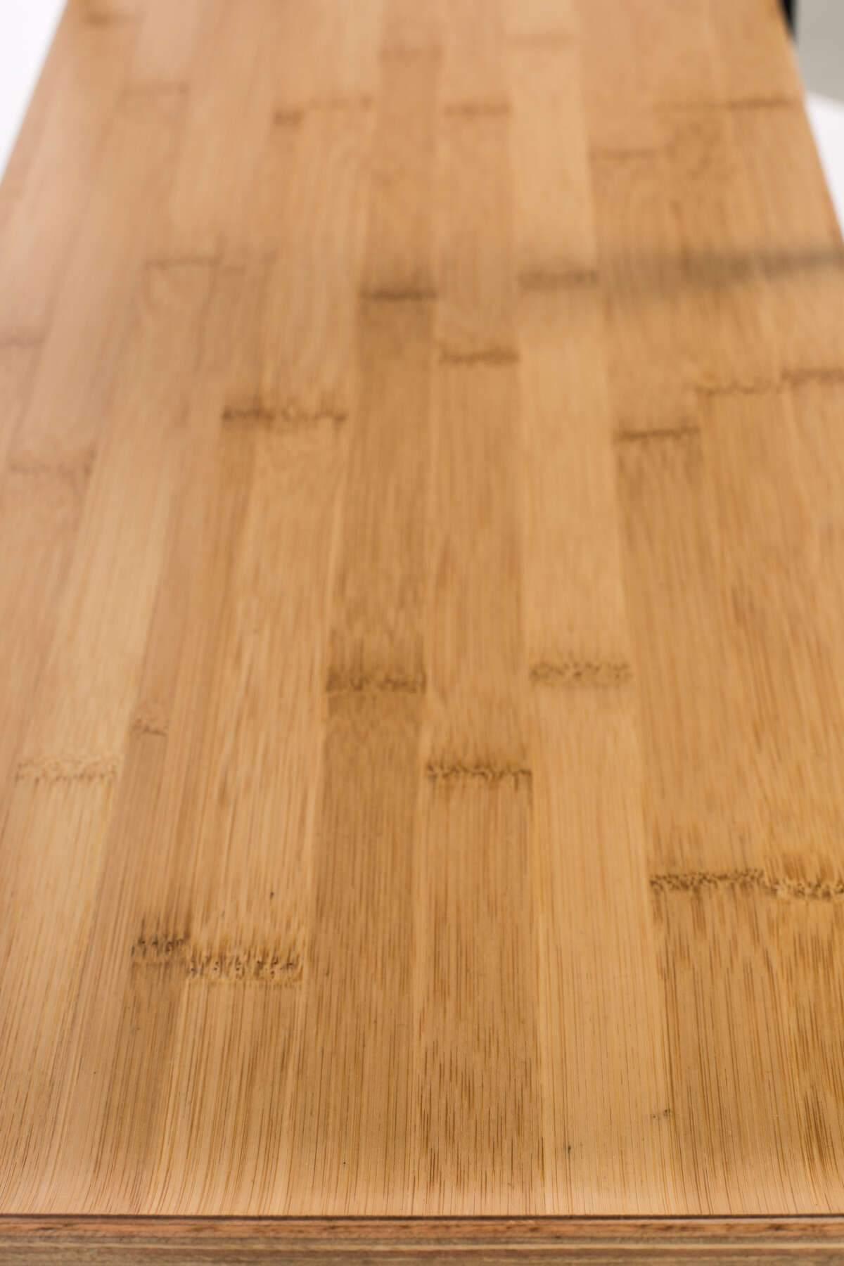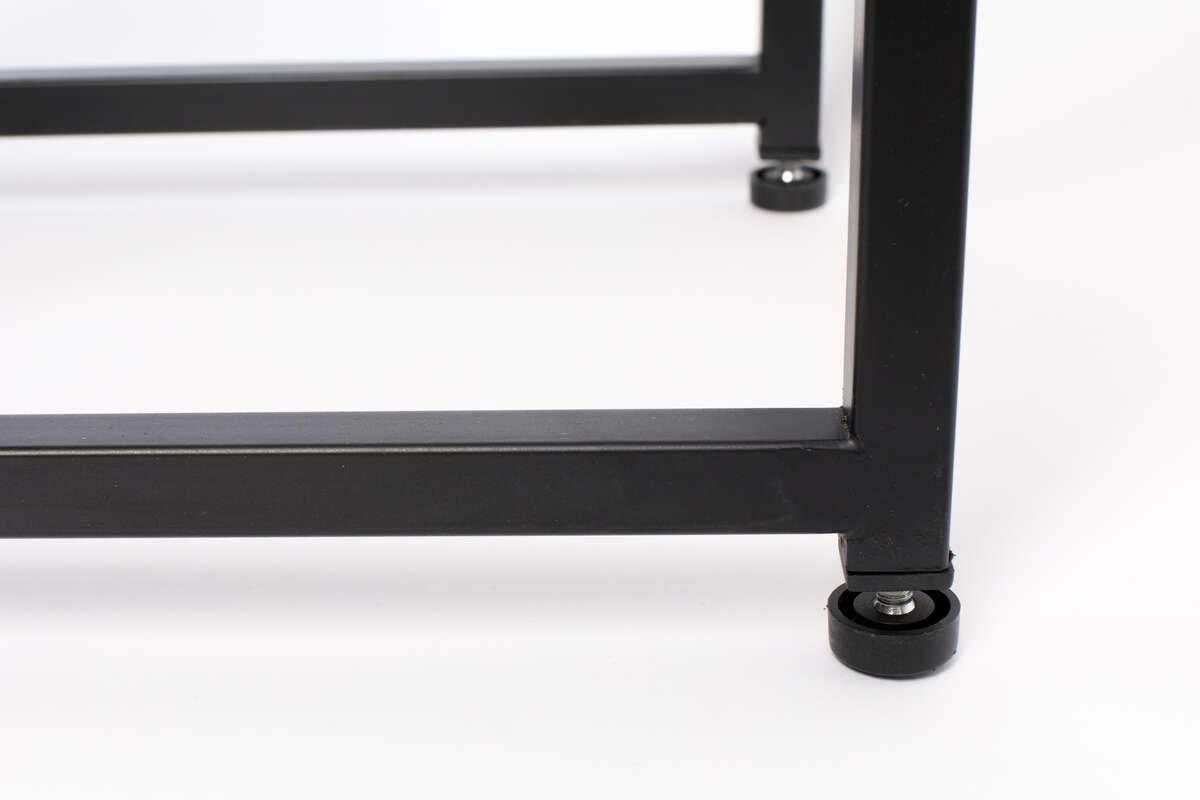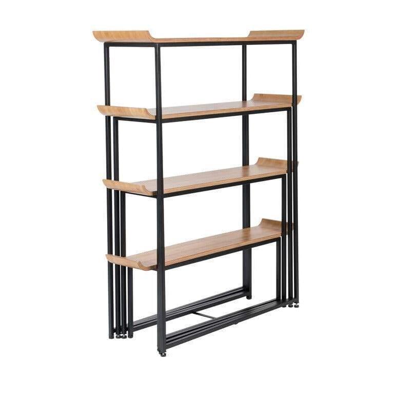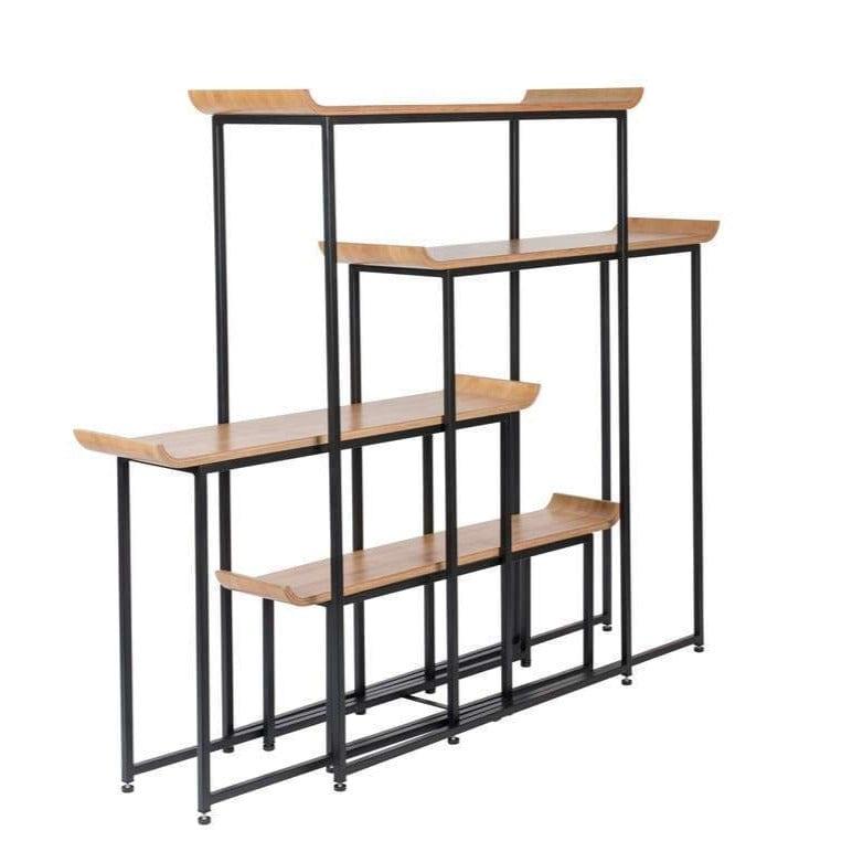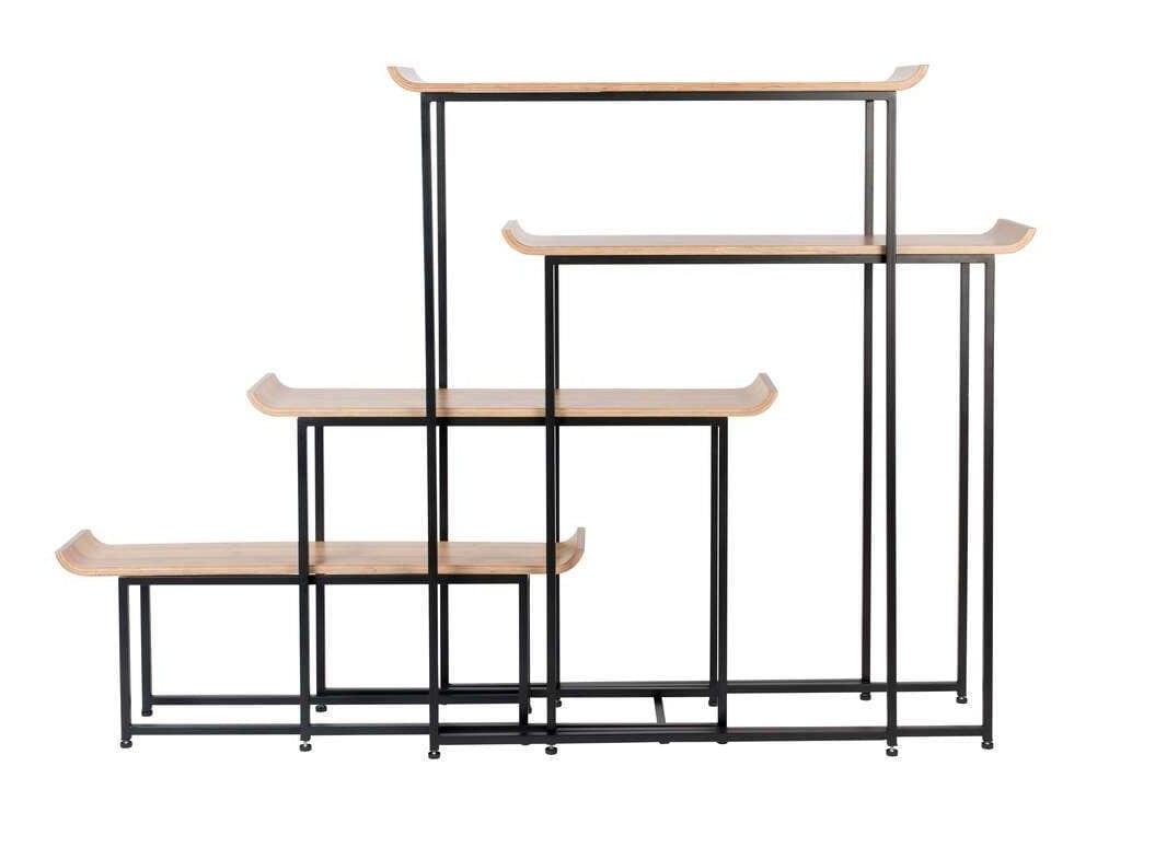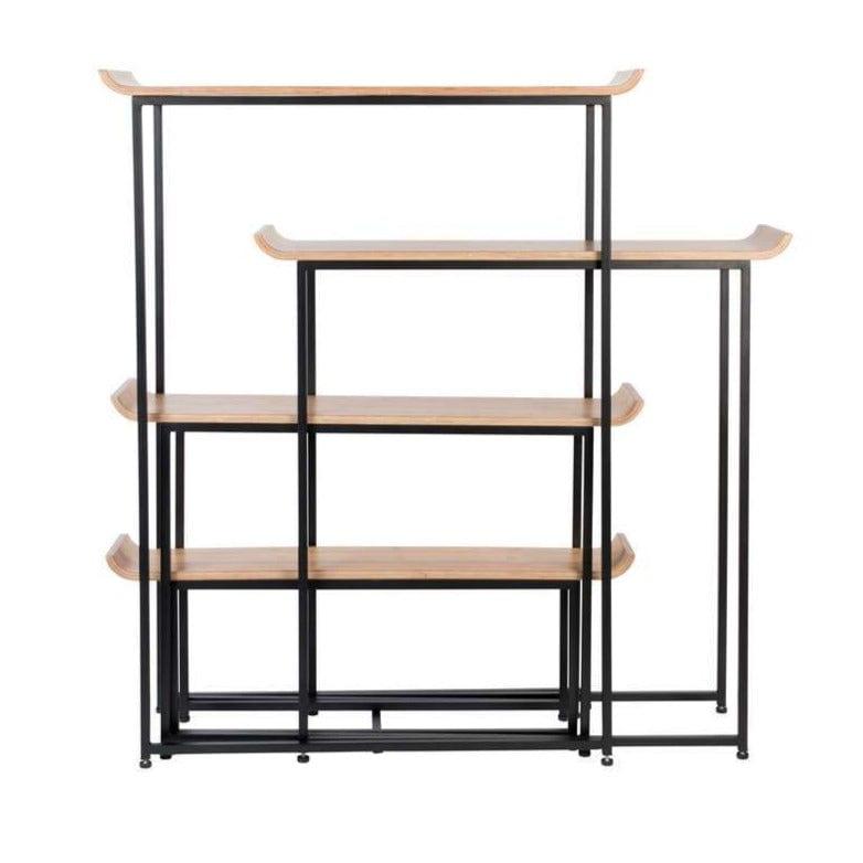 Półki ze sklejki fornirowanej 2 cm z wykończeniem z naturalnego drewna, metalowa rama malowana proszkowo na czarno.