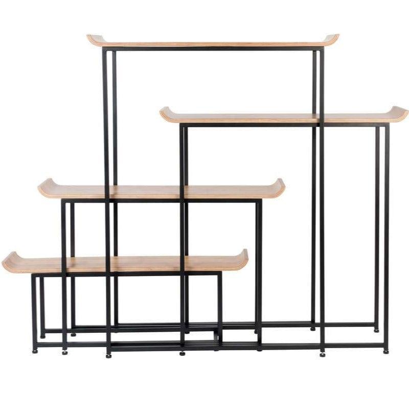 Czarna rama z metalu, na której ułożono półki z naturalnego drewna świetnie się sprawdzi w nowoczesnym pokoju młodzieżowym jak również boho salonie, jako świetne miejsce na figurki oraz kwiatki.