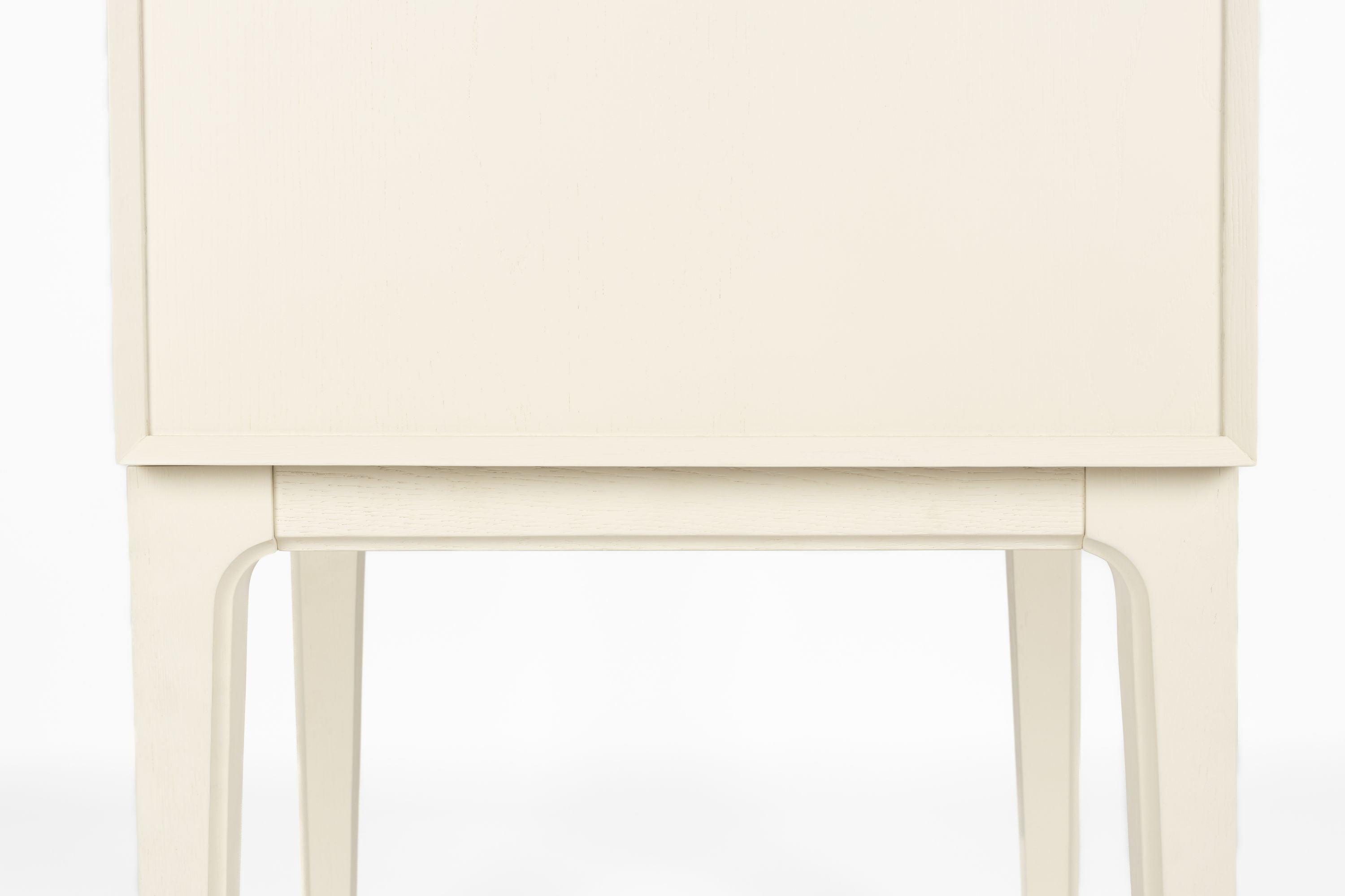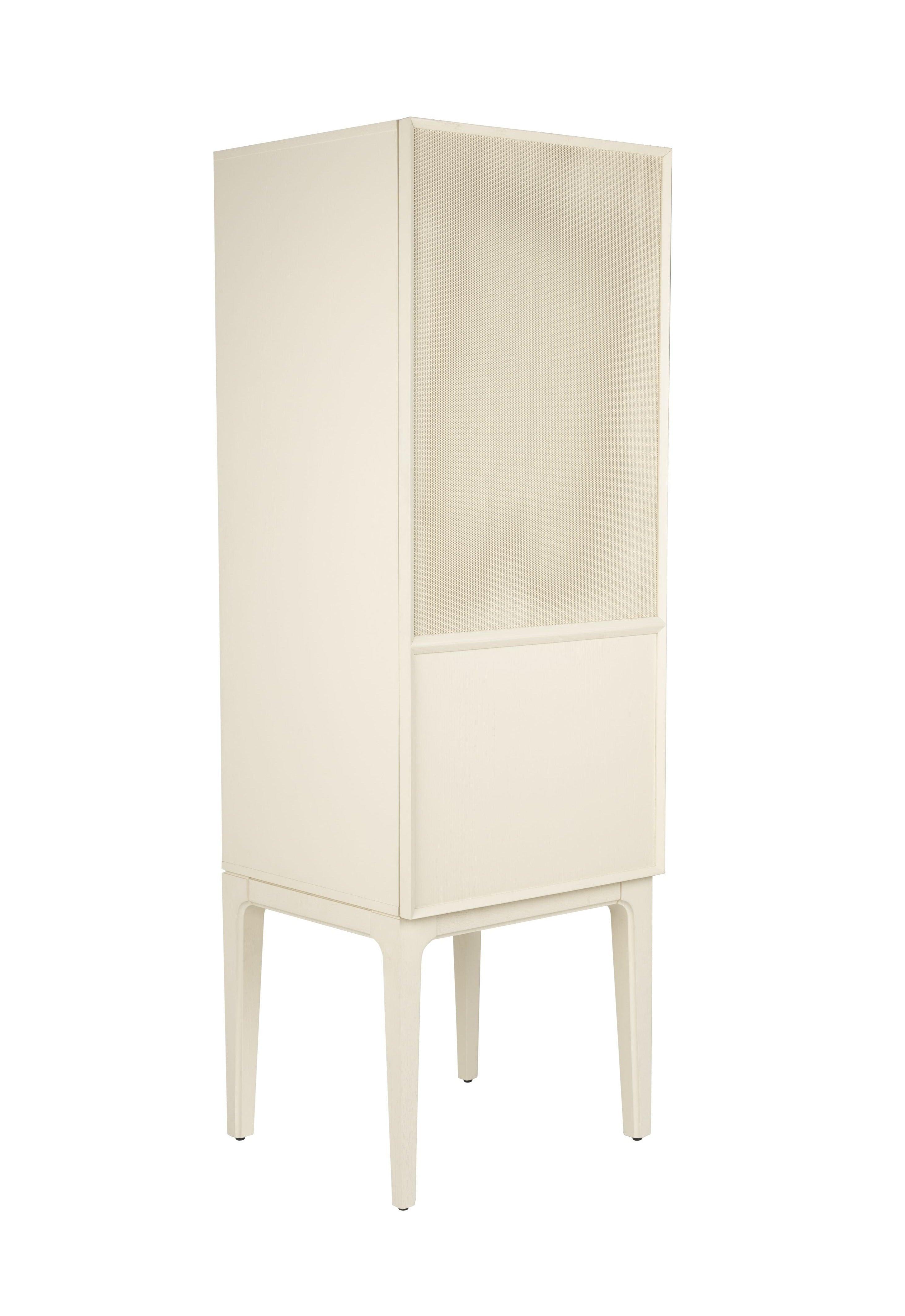 Wykończenie w kolorze kremowym pięknie podkreśla naturalny rysunek słojów dębu. Metalowe, ażurowe drzwi mają przyciągające wzrok panele. Podniesione nogi nadają szafce lekkości.