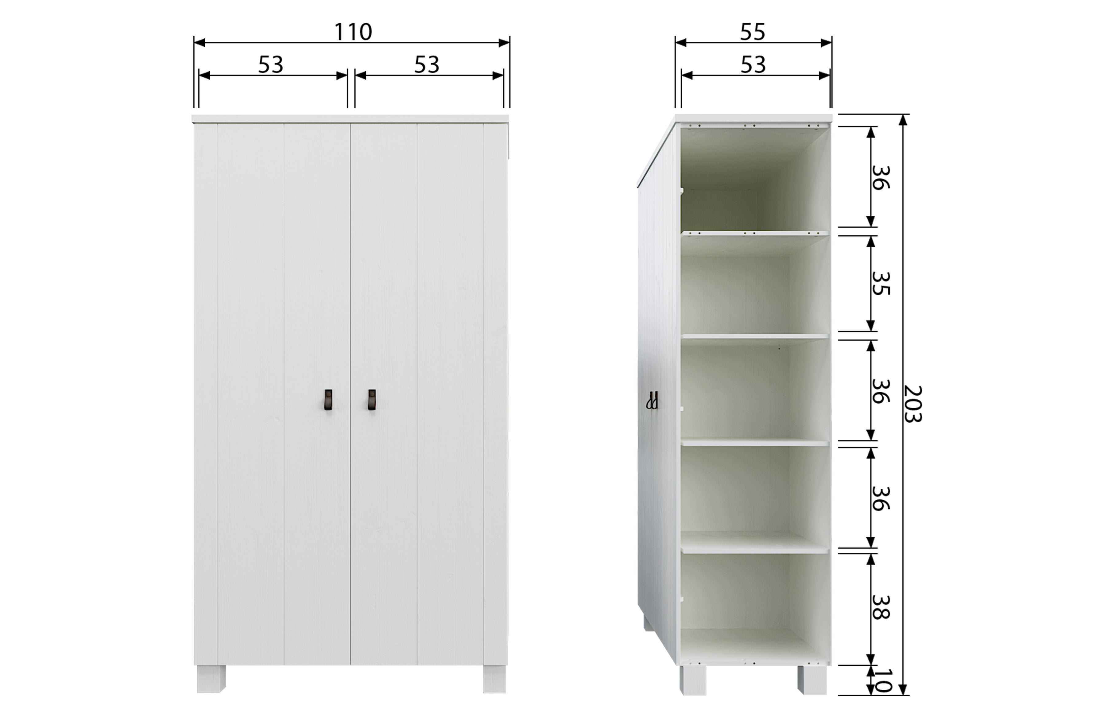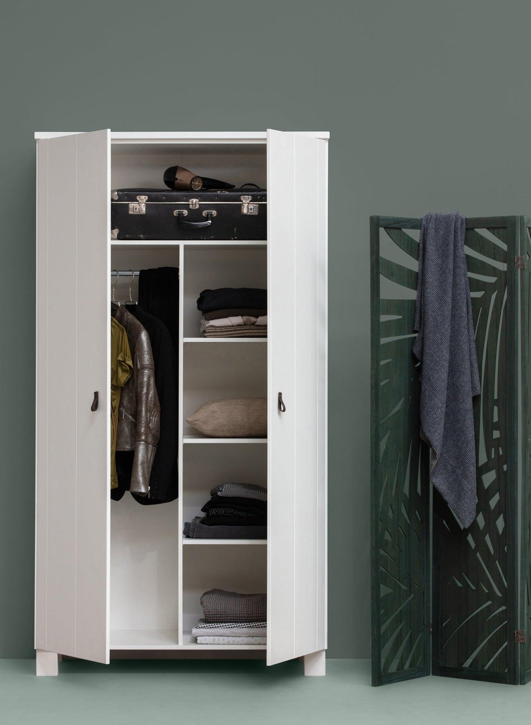 Biała szafa Ties jest wykonana z drewna sosnowego, które zapewniają jej długowieczność i trwałość. Dwa drzwi z łatwością otwierają się, odsłaniając przestrzeń do przechowywania, która jest na tyle pojemna, aby pomieścić wszystko, czego potrzebujesz - od ubrań po pościel czy ręczniki.