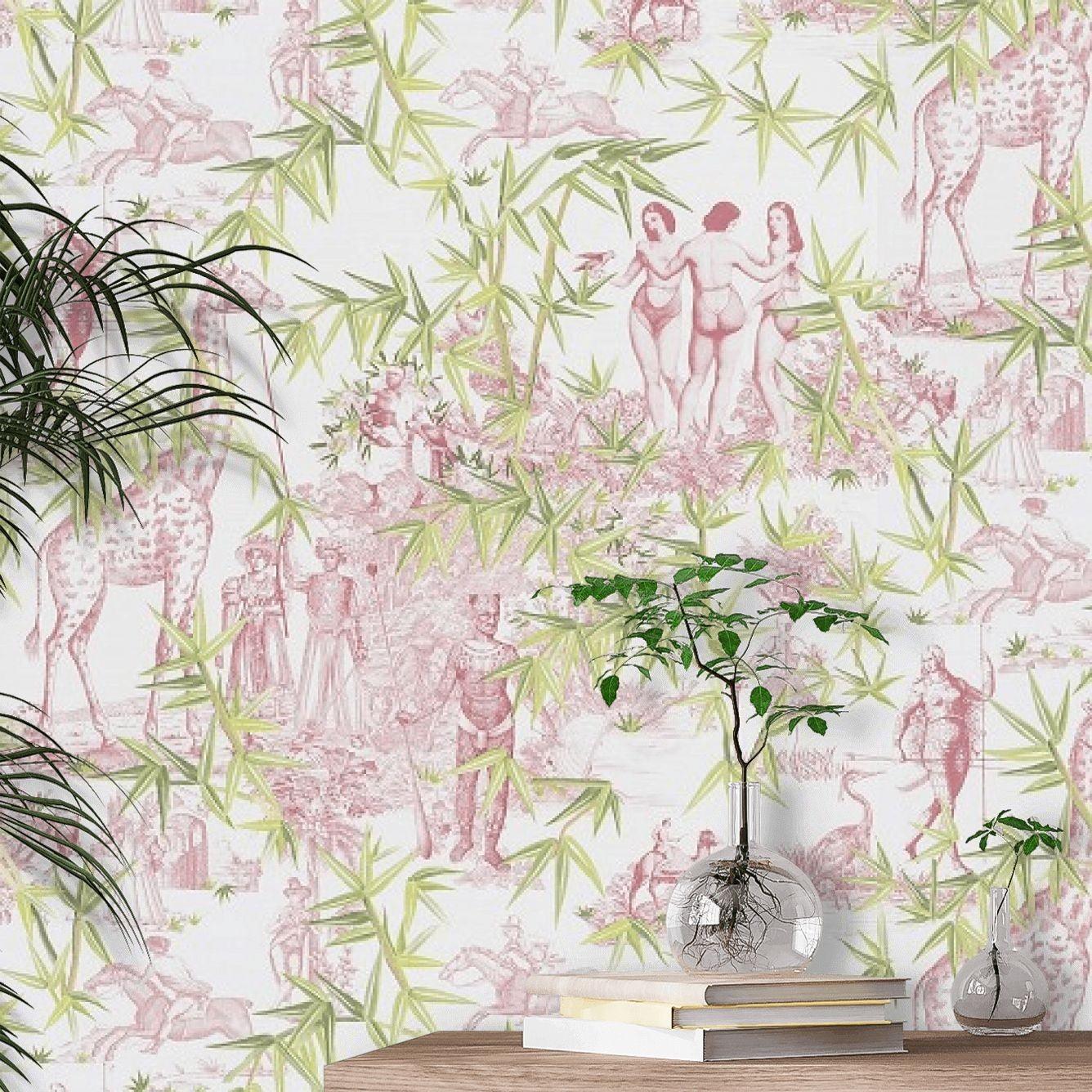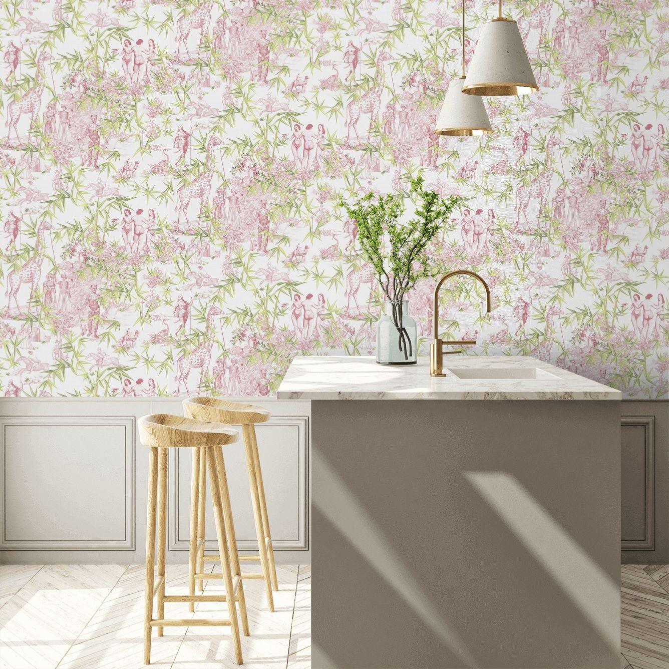 Tapeta Exotisme Tomette to wyjątkowy element dekoracyjny, który wzbogaci każde wnętrze o nutę egzotyki i elegancji. Charakterystycznym elementem tej tapety jest nadruk sceniczny, ukazujący bujną roślinność w postaci liści, nadając pomieszczeniu wyjątkowy, tropikalny klimat. Wybór wzoru nawiązuje do klasycznej obróbki Lacroix, co dodaje tapecie unikalnego charakteru i ekscentryczności. Różowo-zielona tapeta została wykonana na gładkiej włókninie, co nie tylko gwarantuje trwałość, ale także ułatwia proces zawieszania. Dzięki tej strukturze materiału, tapeta doskonale układa się na ścianie, tworząc równomierną i estetyczną powierzchnię.