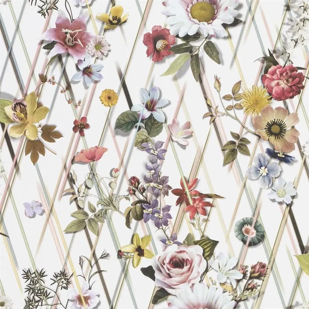 Ta oszałamiająca kwiecista tapeta od Christiana Lacroix, zaprojektowana jako uzupełnienie druku Werandy, przedstawia fotograficzne kwiaty splecione w neonową siatkę wiązek światła. Konwencjonalnie drukowane na gładkiej włókninie, co ułatwia zawieszenie. Dostępny w czterech charakterystycznych kolorach.