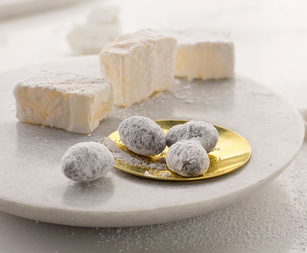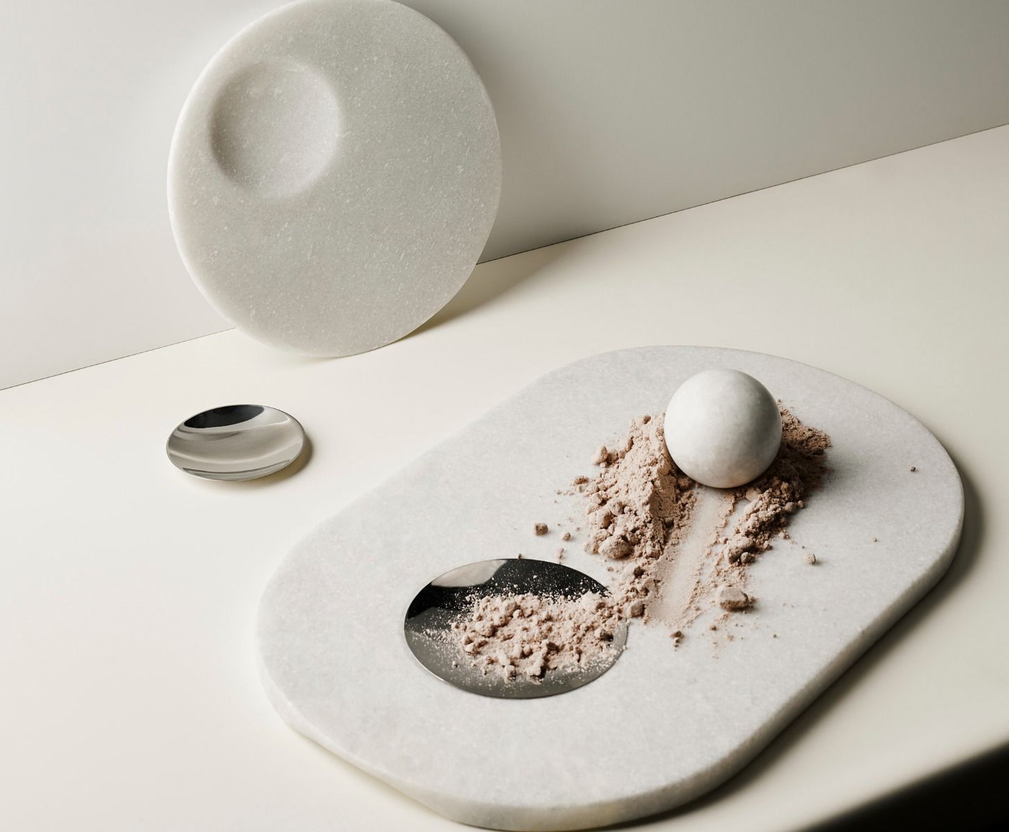 W zestawie znajduje się zdejmowana, ręcznie młotkowana miseczka z mosiądzu, która może służyć do zbierania okruchów, oliwy, dipów lub przypraw. Należy pamiętać, że niezabezpieczony marmur może wchłaniać barwniki, dlatego warto unikać bezpośredniego kontaktu z substancjami takimi jak czerwone wino czy ocet.