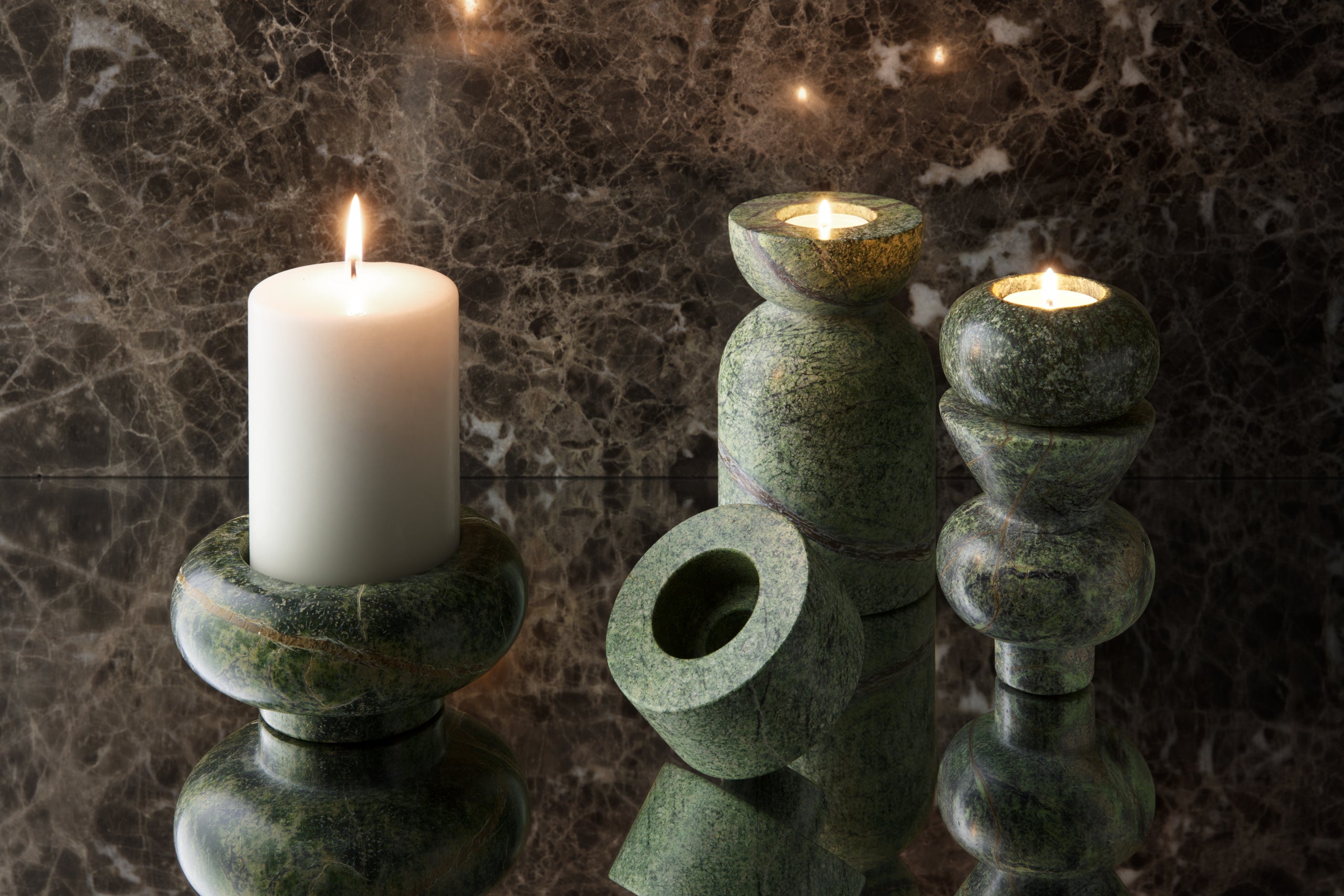 Świecznik Stone to zestaw pięciu zabawnych, układanych i rekonfigurowalnych świeczników, które tworzą rzeźbiarskie kompozycje we wnętrzu. Każdy element wykonany jest z unikalnego kawałka marmuru, co sprawia, że każdy świecznik ma niepowtarzalny wzór i strukturę. Kolekcja nawiązuje do ponadczasowej elegancji marmuru – materiału, który od wieków fascynuje architektów, rzeźbiarzy i projektantów.