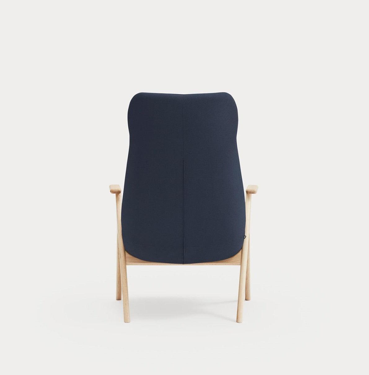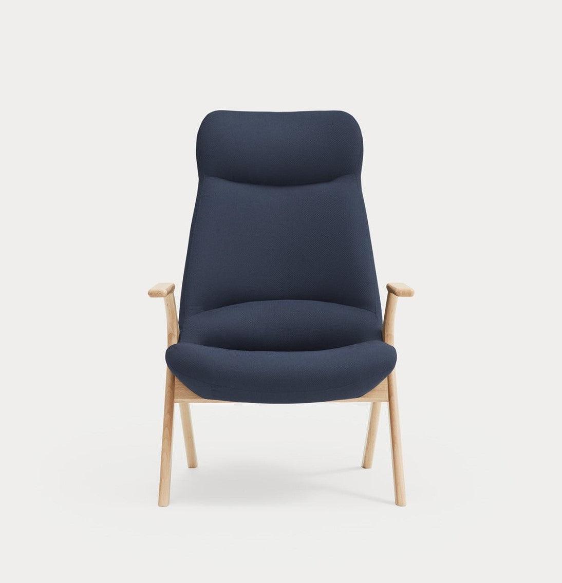 Fotel DINS wysoki ciemnoniebieski z drewnianą podstawą
