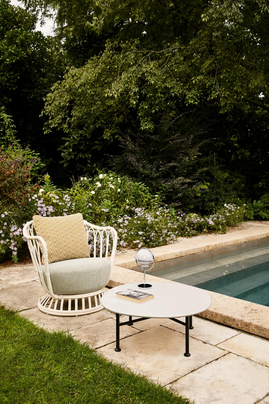 Fotel ogrodowy Grace to współczesna reinterpretacja szkicu Tove Kindt-Larsen z 1936 roku — jednej z najważniejszych postaci duńskiego modernizmu. Kultowy model z kolekcji GUBI zachwyca elegancją, zmysłową formą oraz lekkością inspirowaną naturą. W nowej wersji outdoorowej Grace zyskuje świeży wyraz dzięki zastosowaniu innowacyjnych materiałów: odpornego na warunki atmosferyczne aluminium malowanego proszkowo oraz plecionki z włókien polietylenowych, które wizualnie i dotykowo nawiązują do klasycznego rattanu.