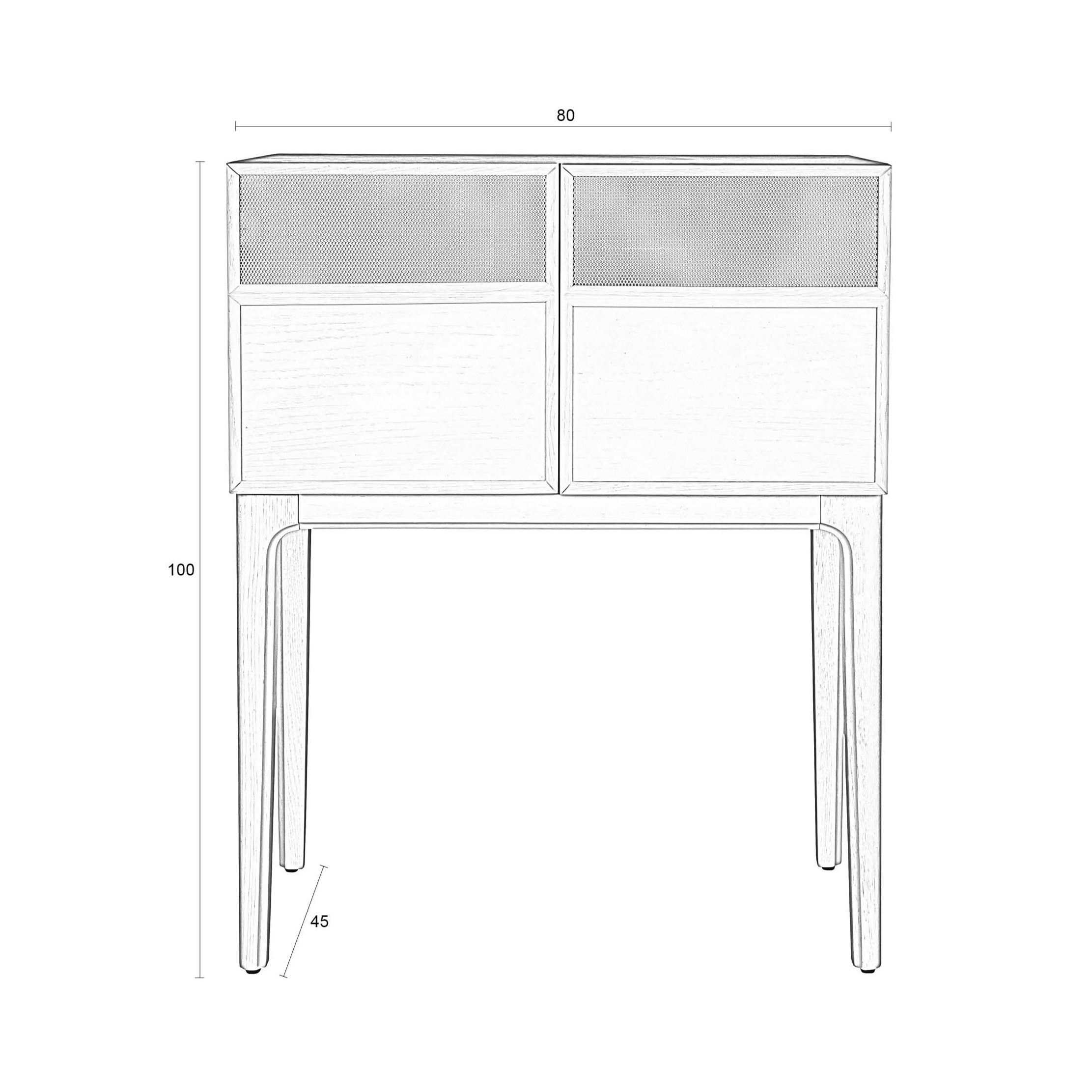 Wykończenie w kolorze kremowym pięknie podkreśla naturalny rysunek słojów dębu. Metalowe, ażurowe drzwi mają przyciągające wzrok panele. Podniesione nogi nadają komodzie lekkości.