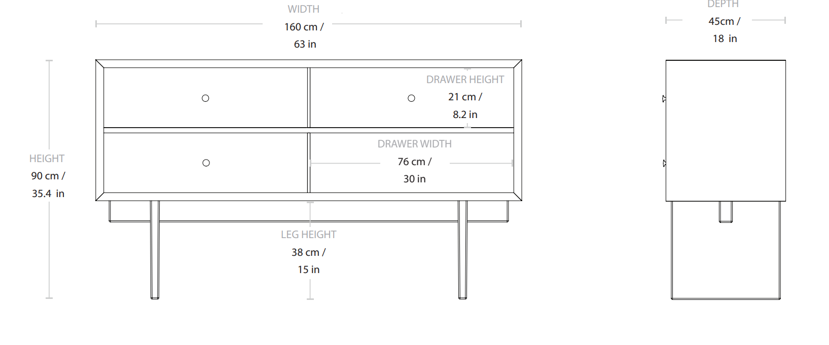 Cztery pojemne szuflady z systemem cichego domykania oferują dużo miejsca do przechowywania, idealnie sprawdzając się w salonie, jadalni czy sypialni. Górna powierzchnia komody może służyć jako przestrzeń do ekspozycji dekoracji, książek czy sztuki, podkreślając indywidualny charakter wnętrza. Komoda może również funkcjonować jako elegancki mebel wolnostojący w przestrzeniach otwartych.