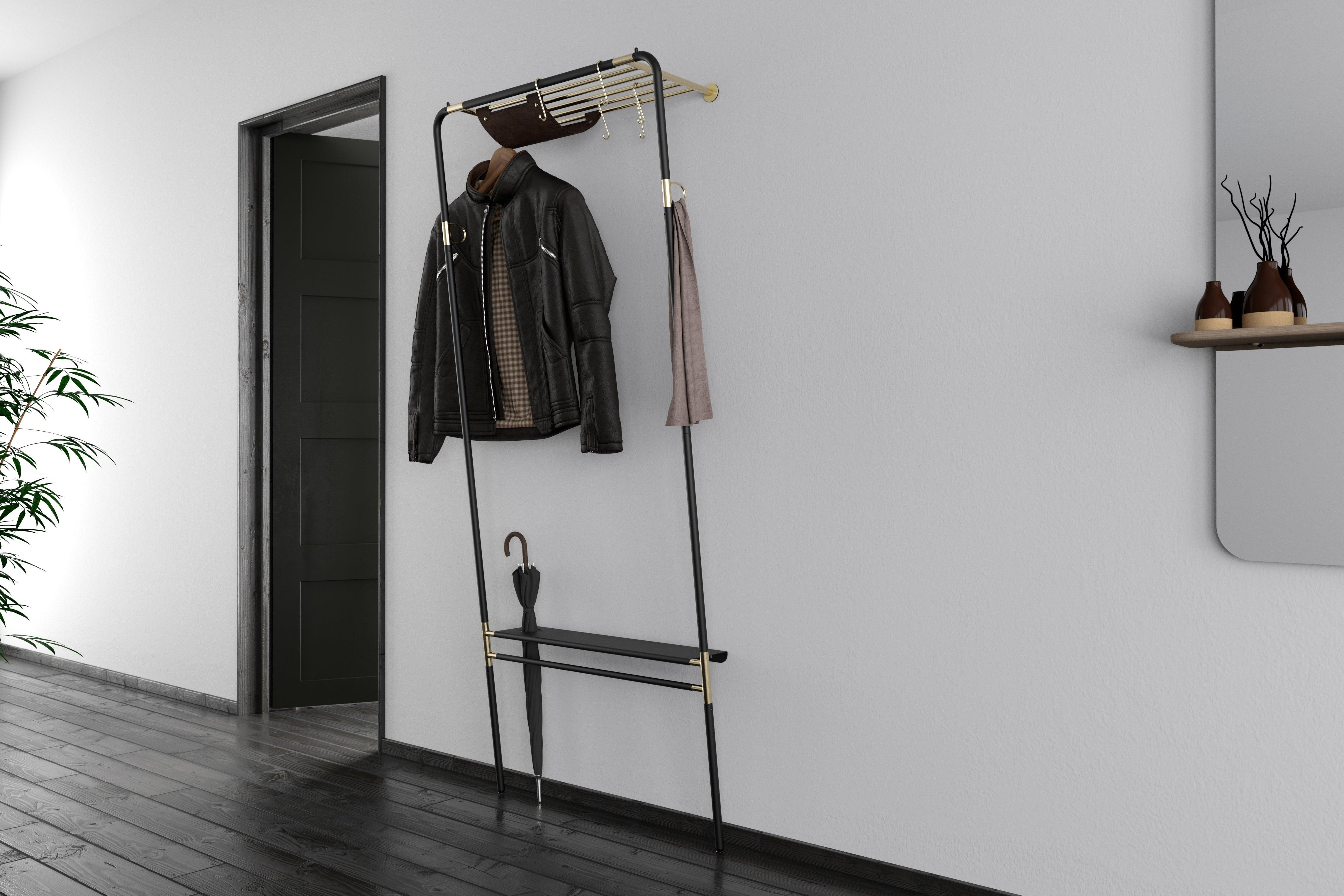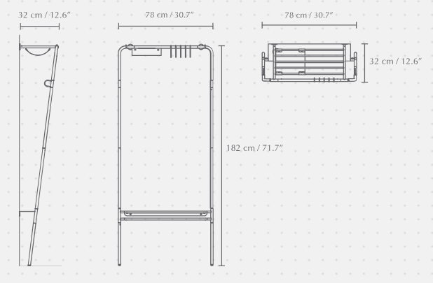 Wieszak na ubrania Lean On Me został zaprojektowany tak, aby umożliwić wygodne przechowywanie wszystkich niezbędnych rzeczy na świeżym powietrzu, jednocześnie maksymalnie wykorzystując dostępną przestrzeń. Jego innowacyjny design pozwala mu opierać się pod kątem od ściany u podstawy, co sprawia, że zajmuje minimalną ilość miejsca na podłodze.