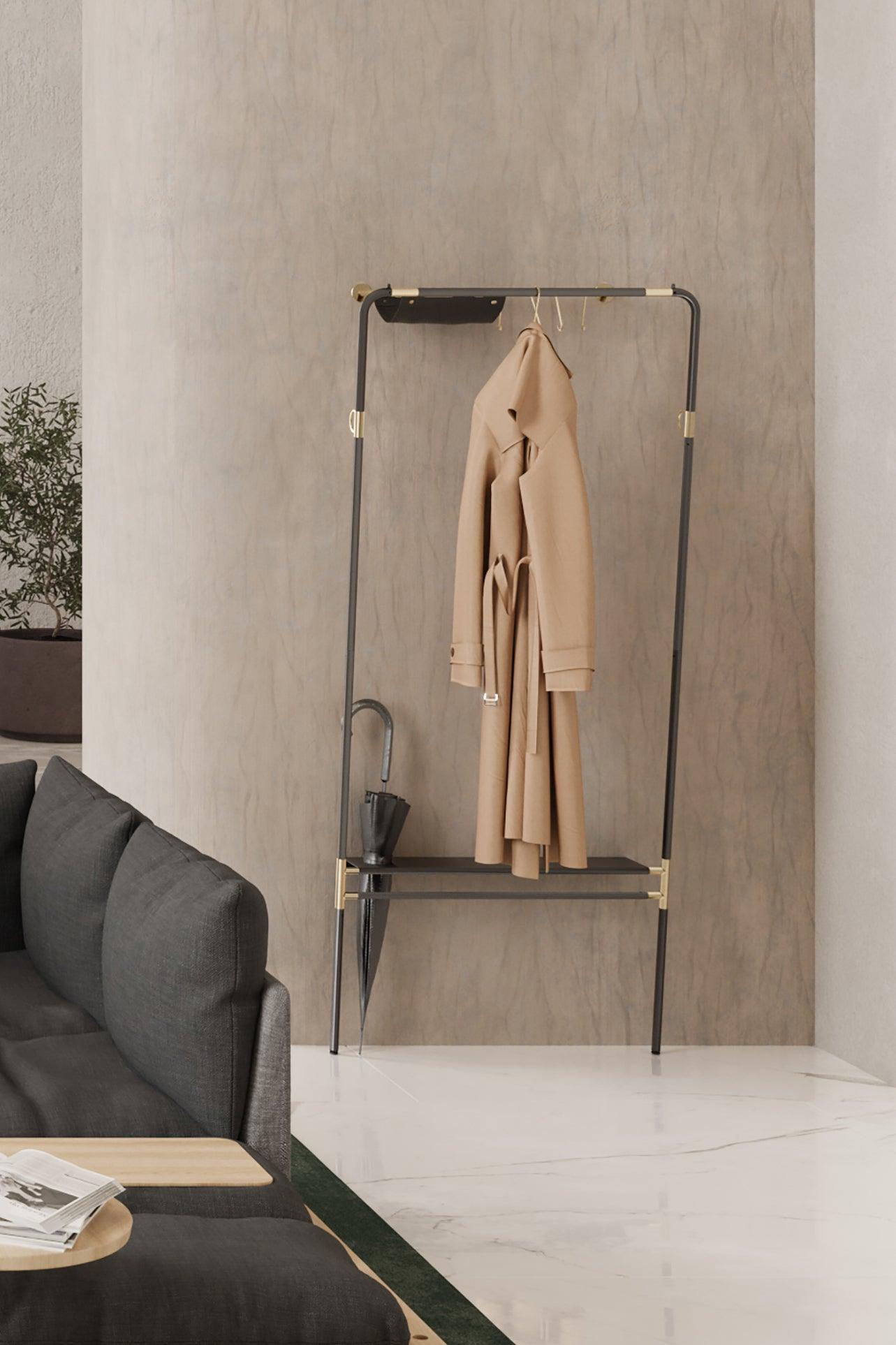 Wieszak doskonale sprawdza się w wąskich korytarzach i innych miejscach, gdzie przestrzeń jest ograniczona. Jednocześnie jego wyrazista konstrukcja przyciąga uwagę, stanowiąc imponujący element, który witająco przyjmuje gości w ważnych punktach wejścia do domu.