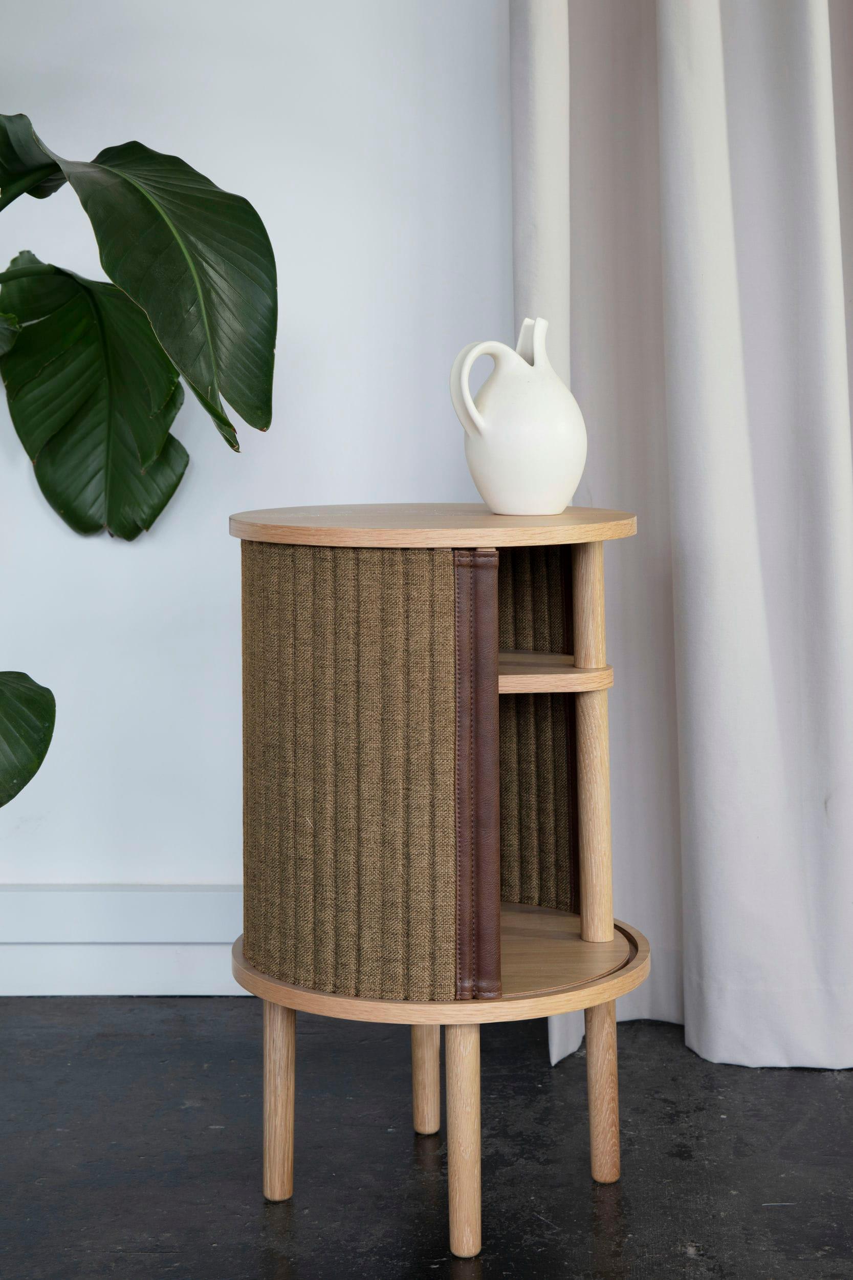 Dostępny w trzech kolorach: naturalny dąb, ciemny dąb i czarny dąb, z żaluzjami w czterech starannie dobranych kolorach tkaniny Horizons, pochodzącej w 100% z recyklingu. Żaluzje są wymienne, co oznacza, że możesz łatwo zmieniać je samodzielnie, dodając nowe życie projektowi bez konieczności zakupu zupełnie nowego mebla, co jednocześnie przyczynia się do oszczędzania światowych zasobów.