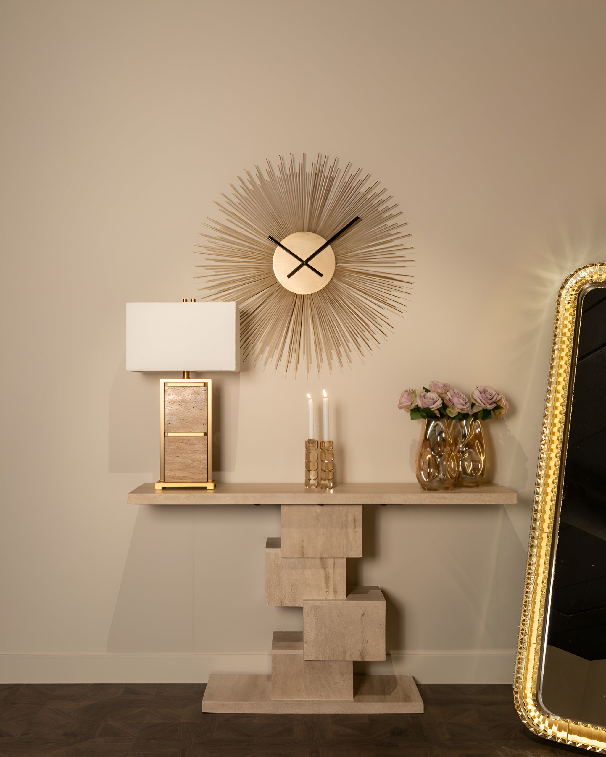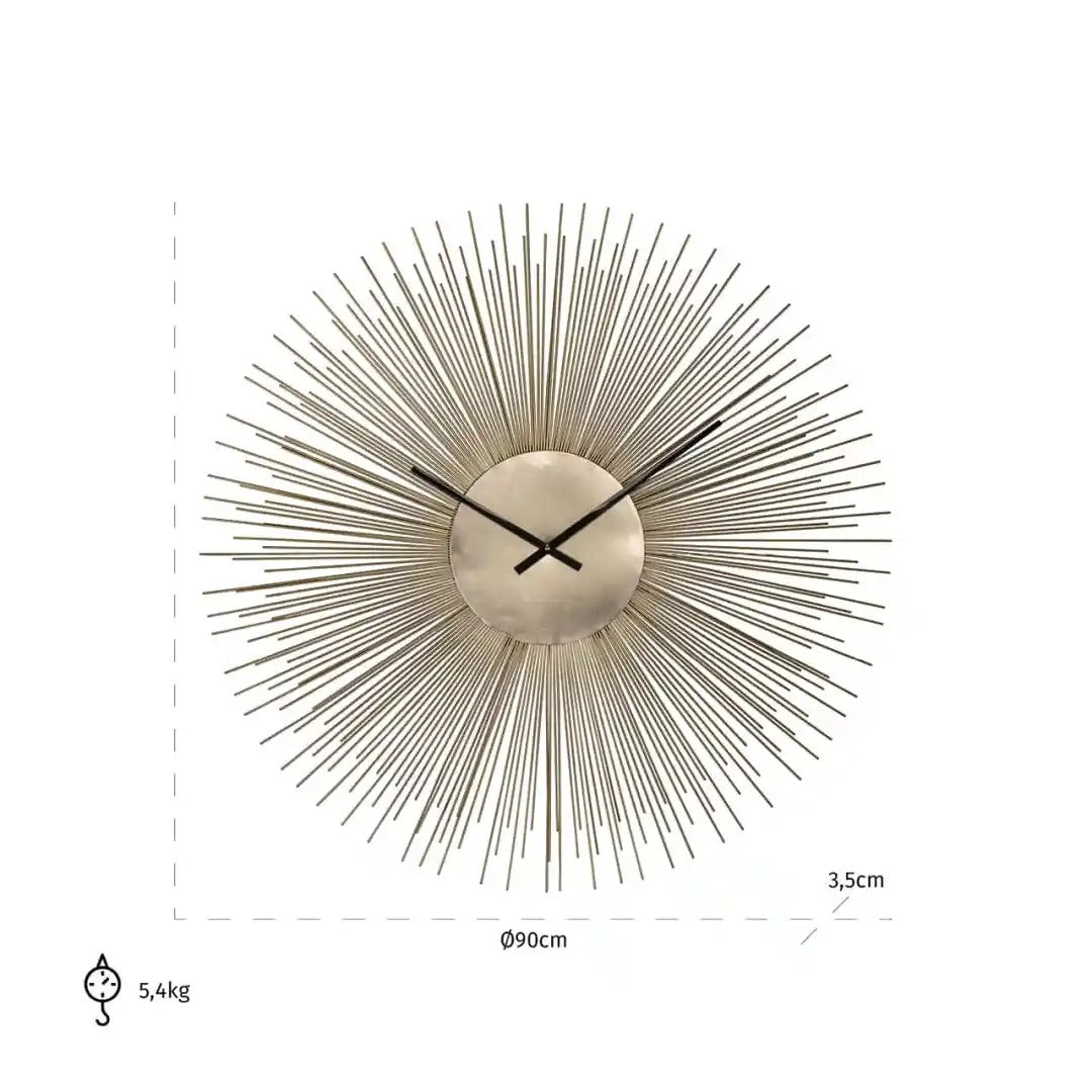 Zegar ścienny Chasin w kształcie słońca to wyjątkowa dekoracja, która nada wnętrzu niepowtarzalnego blasku. Promienista konstrukcja w złotym kolorze tworzy efekt trójwymiarowy, sprawiając, że zegar staje się centralnym punktem aranżacji. Smukłe, czarne wskazówki kontrastują z tłem, zapewniając elegancję i funkcjonalność w jednym.