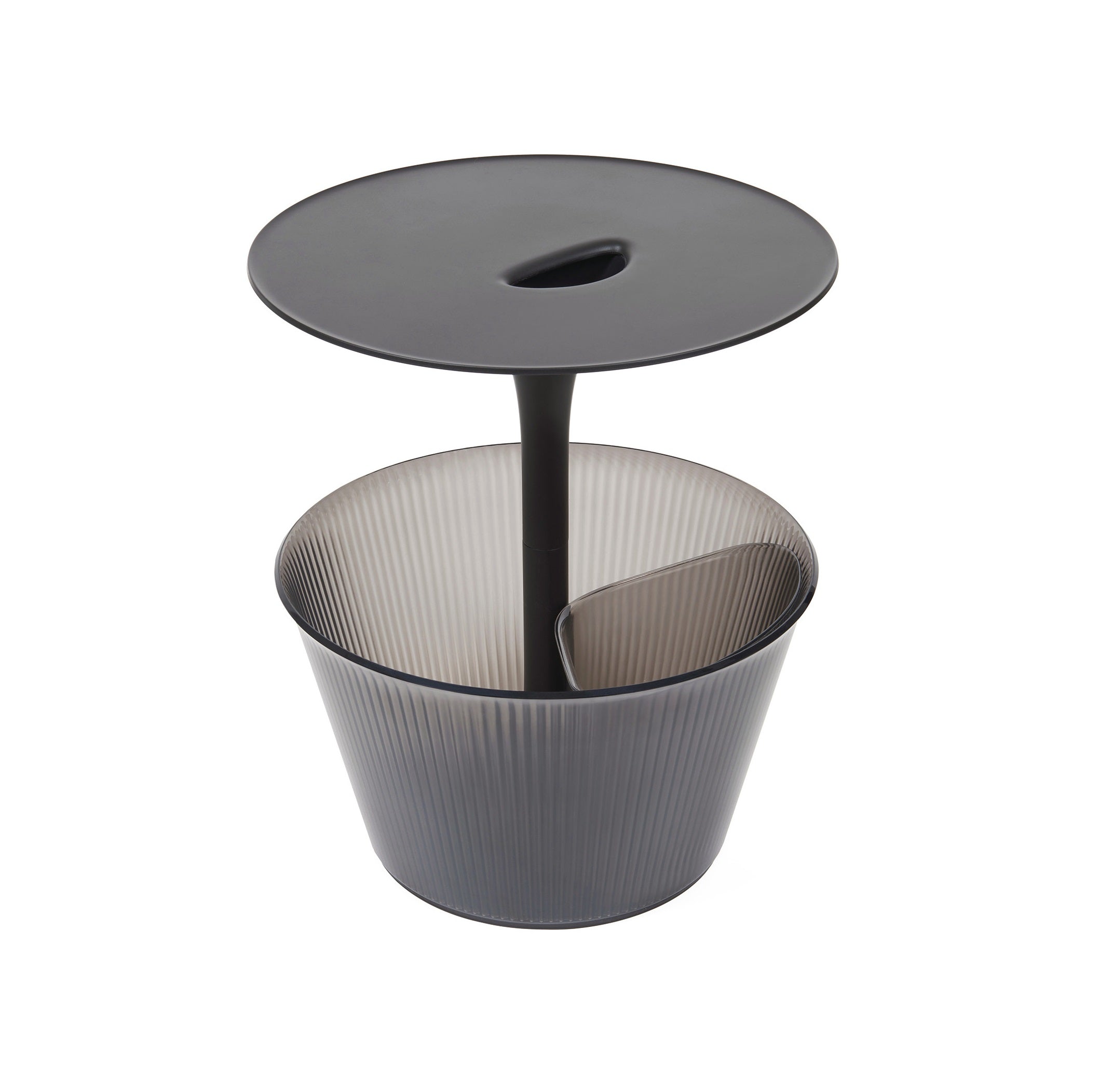 Tisch Pick-up, das von Jacob Wagner für Alessi entwickelt wurde, ist ein multifunktionales Möbelstück, das drei Funktionen in einem Thema kombiniert: Tisch, Zeitschriftenstand und Flaschenhalter. Es ist eine Kombination aus Pragmatismus und Eleganz, die durch minimalistische Linien und hohe Funktionalität auszeichnet.